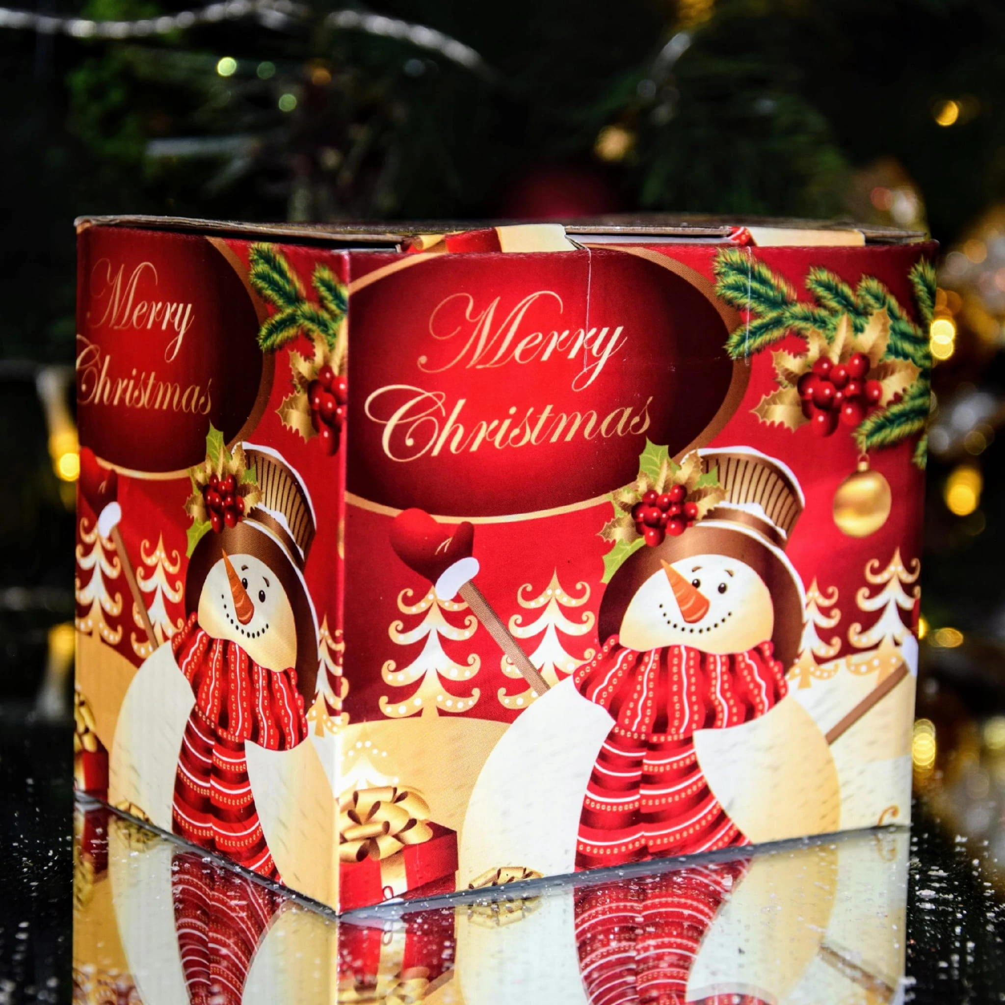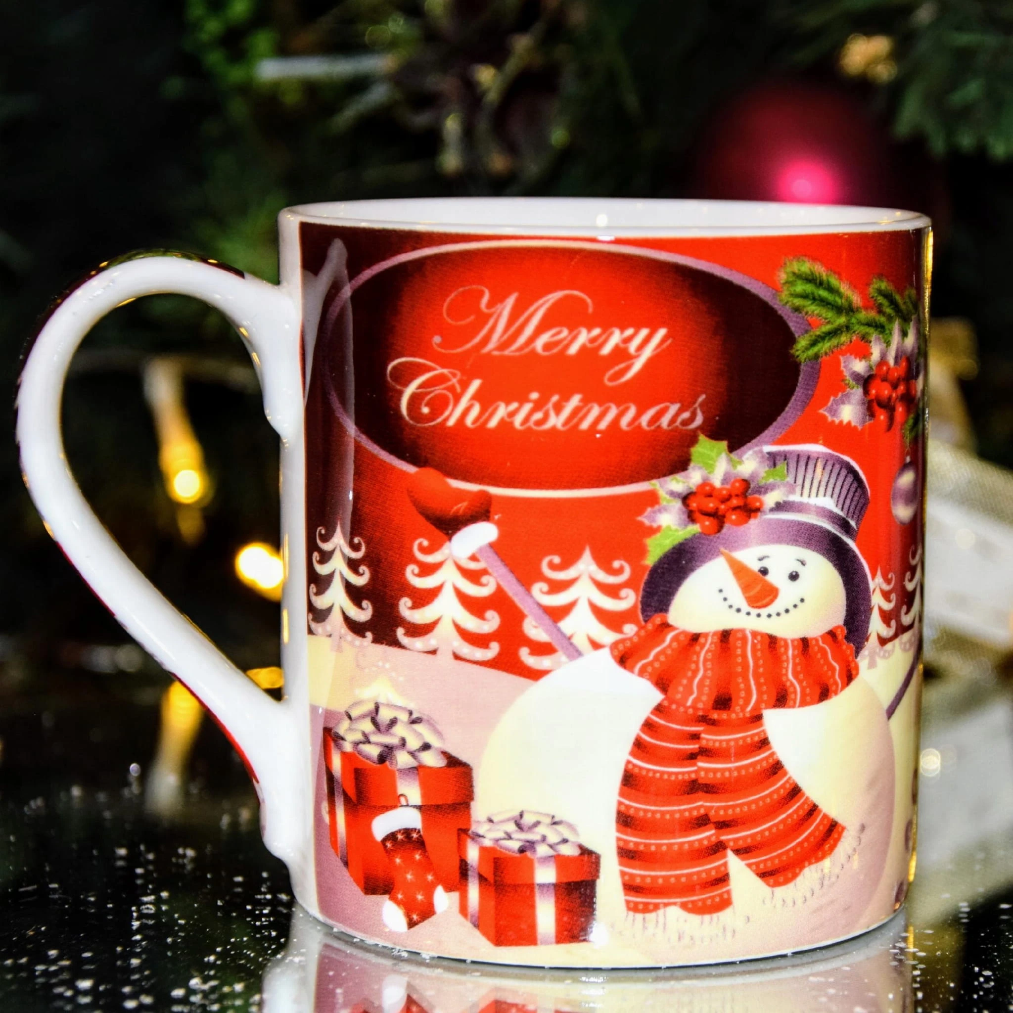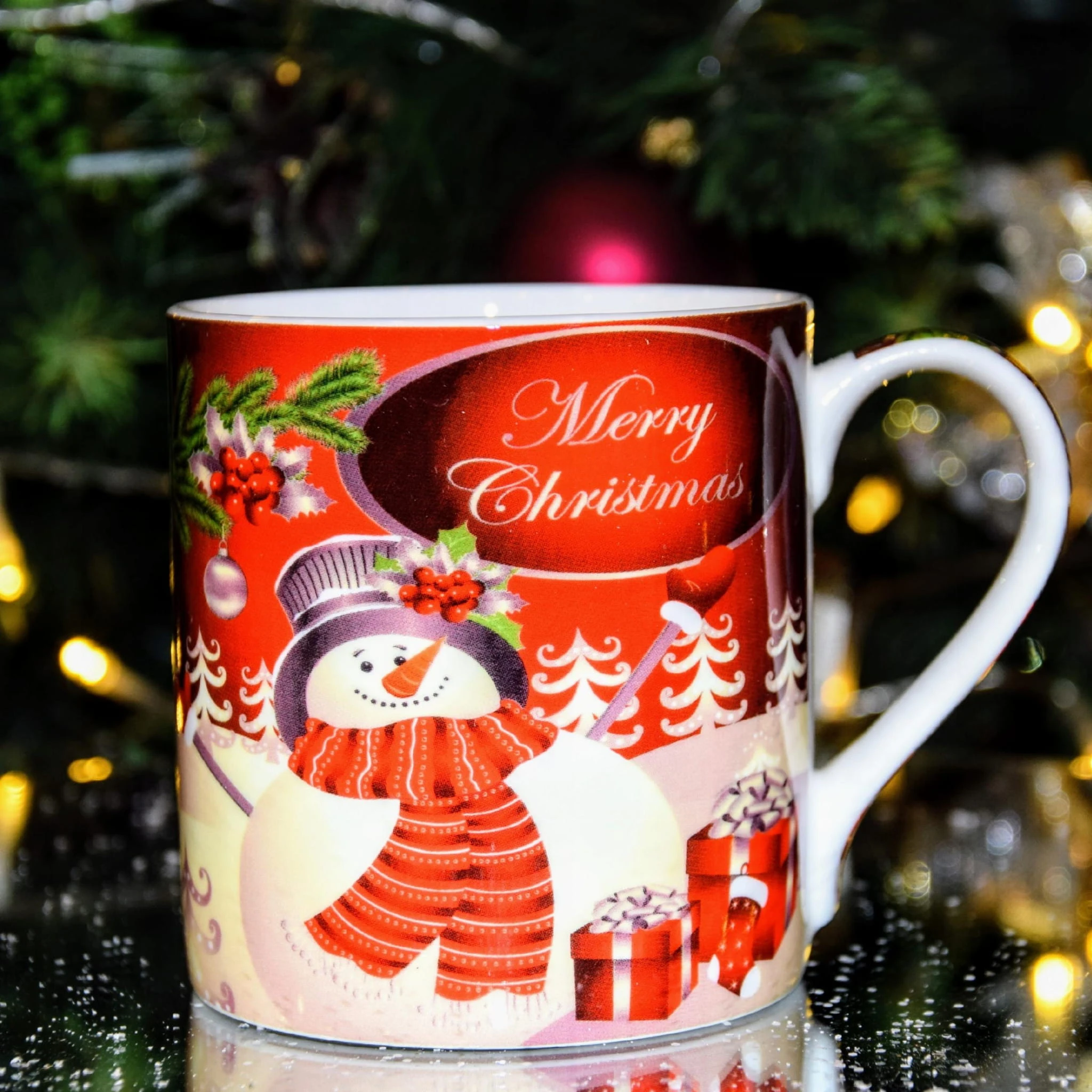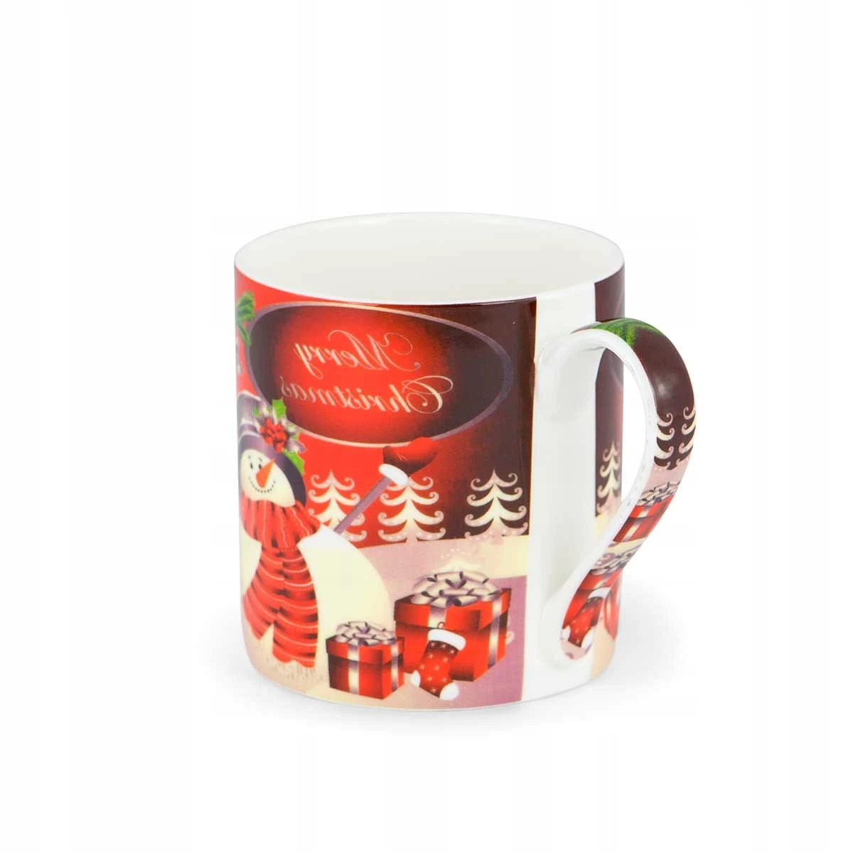 Kubek wykonany jest z wysokiej jakości porcelany Bone China w białym kolorze, z nadrukiem świątecznym – wesoły bałwanek z prezentami i napis Merry Christmas.