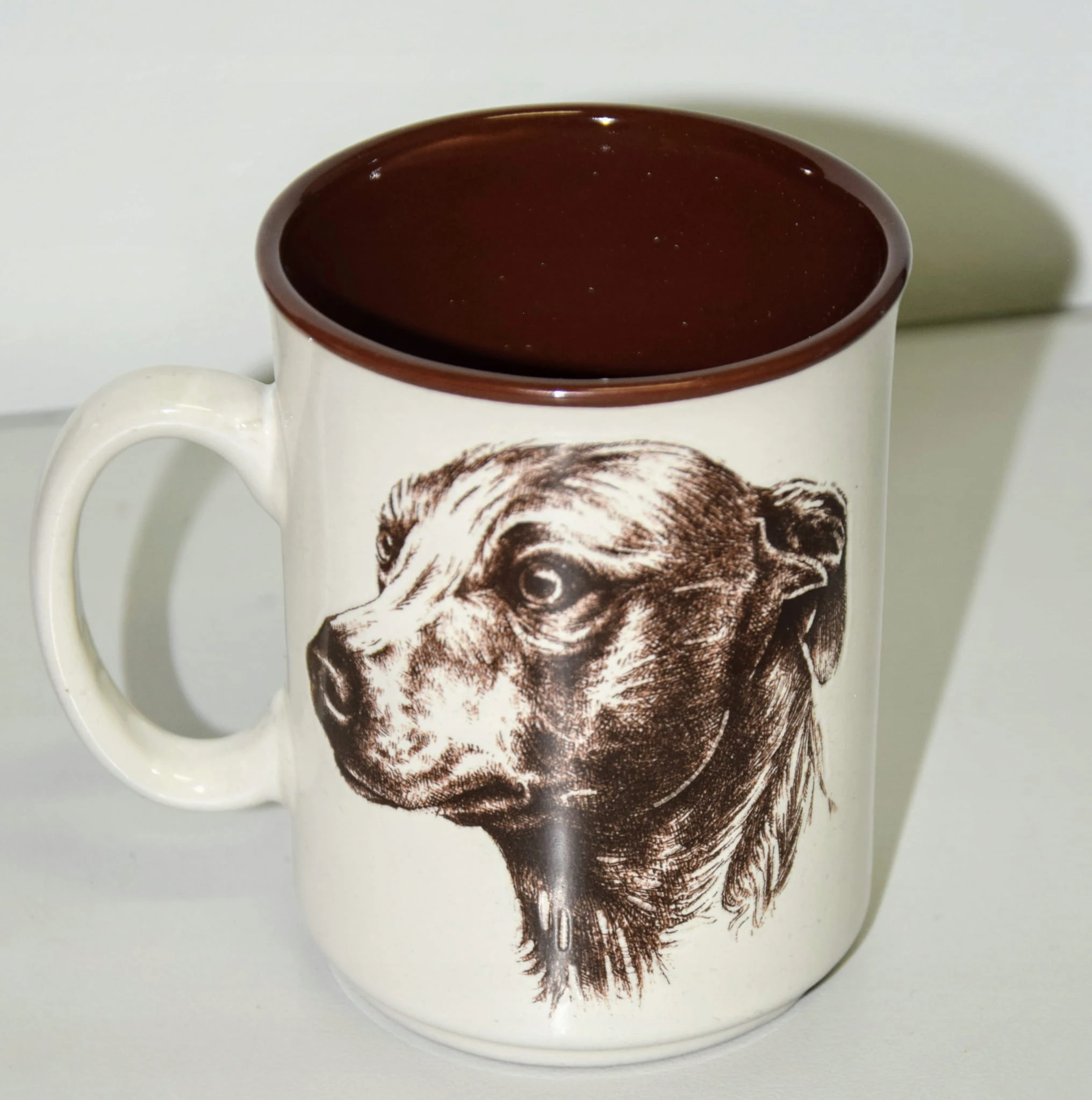 Nieduży kubek o klasycznym kształcie, z porcelany New Bone China England Collection. Elegancki wygląd gwarantują połączenie koloru ecru z brązem oraz motyw psa, delikatnie wyżłobiony w porcelanie.