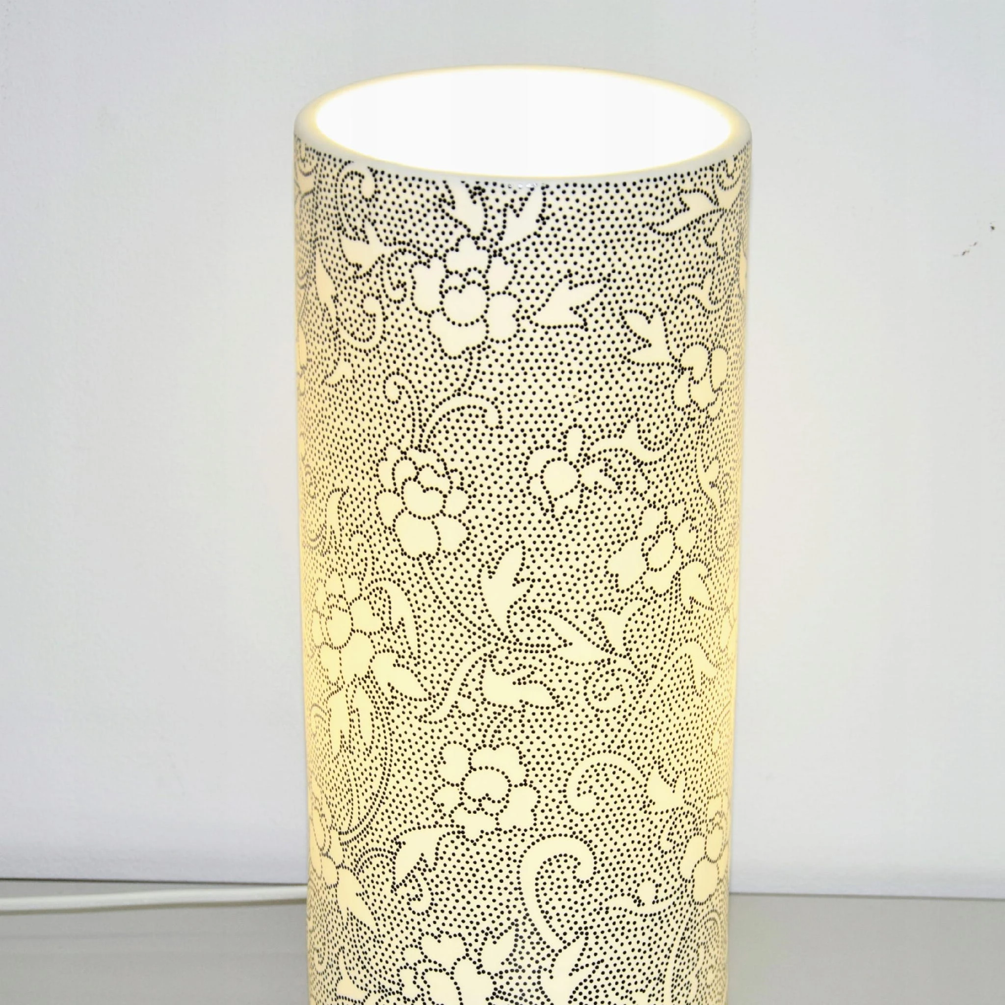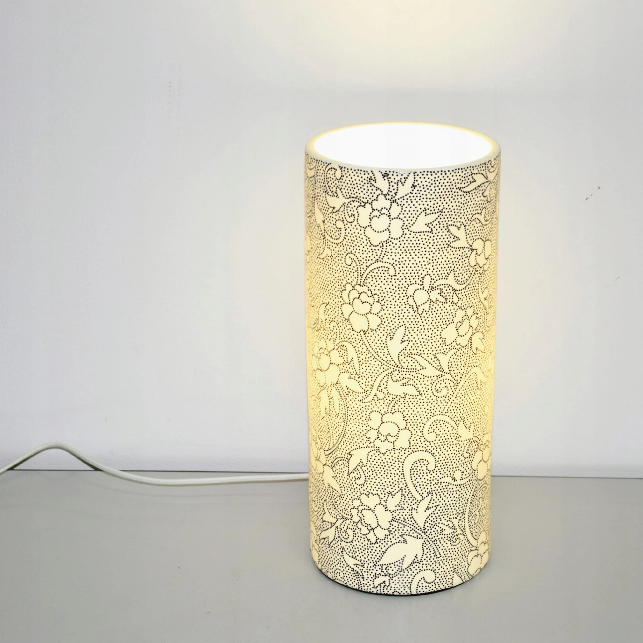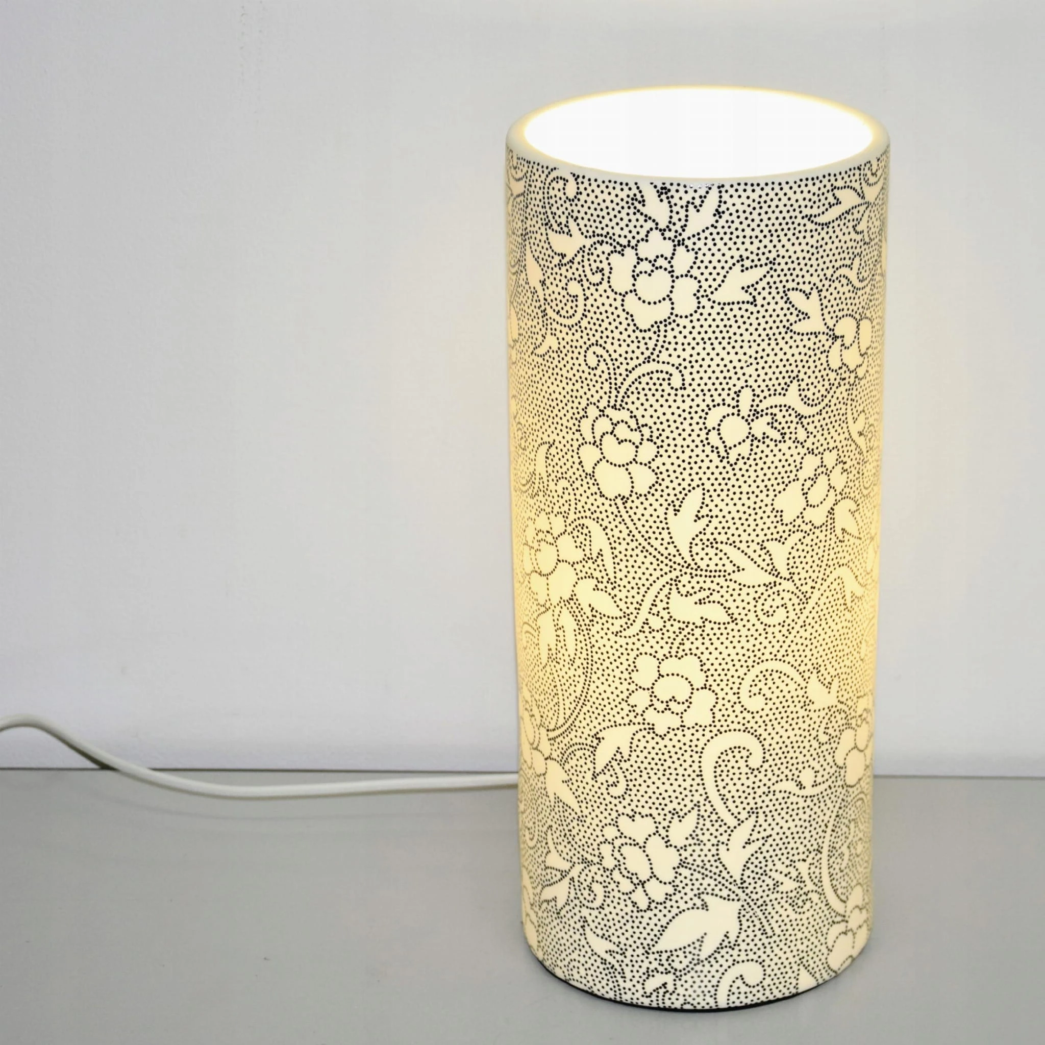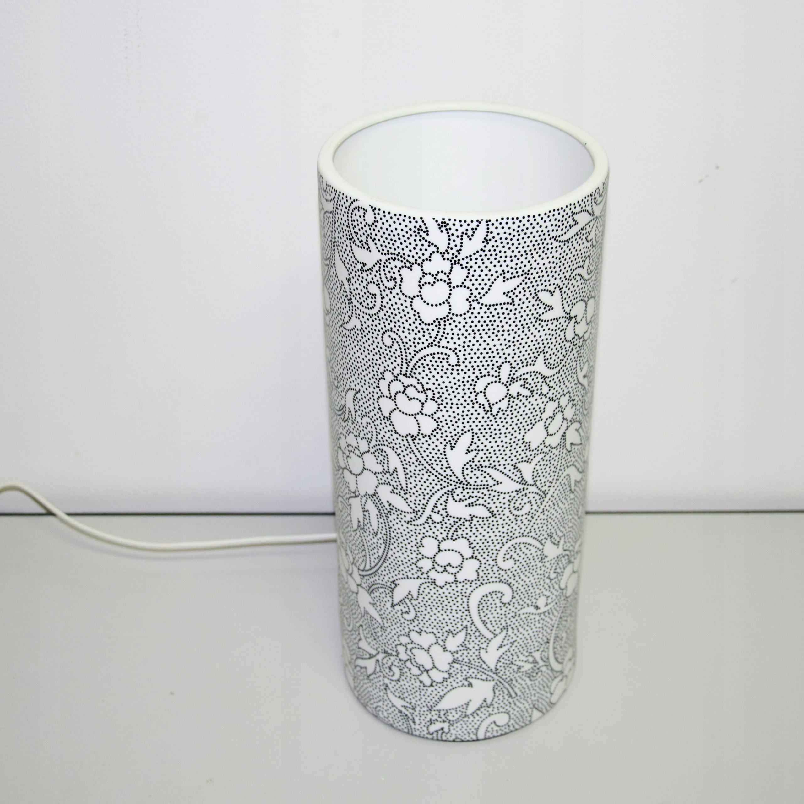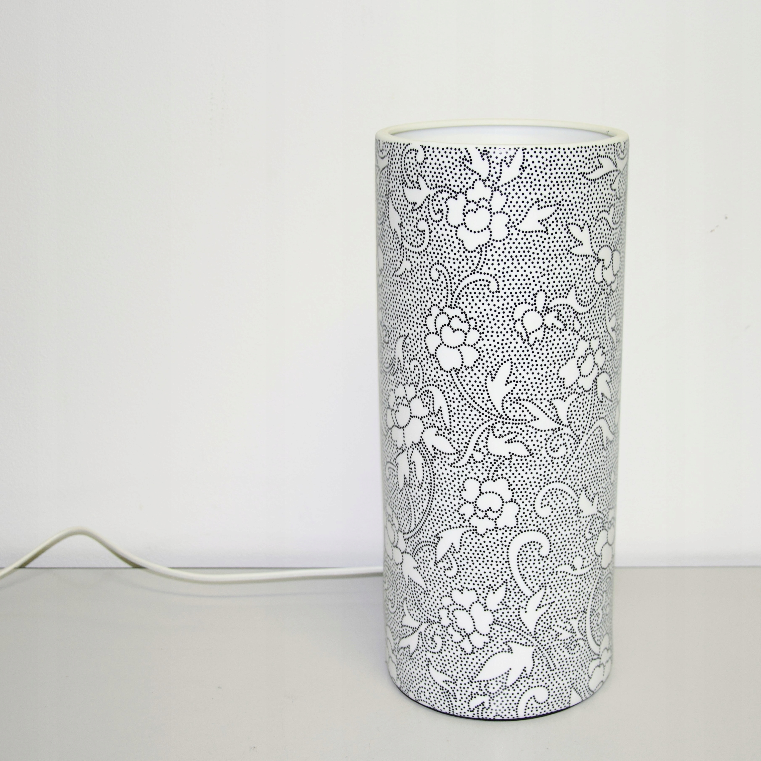 Lampa w kształcie tuby. Wewnątrz biała, na zewnątrz czarny print