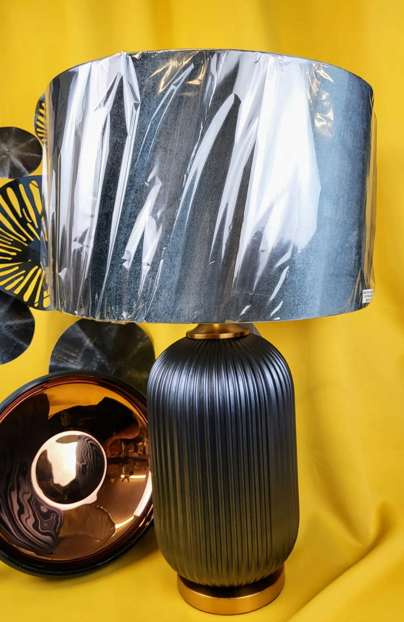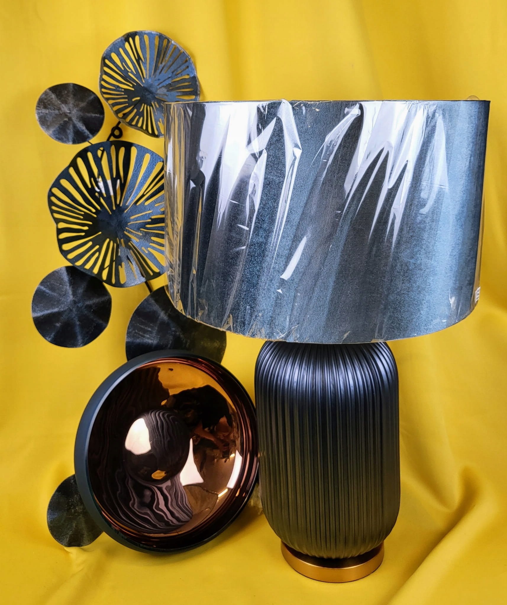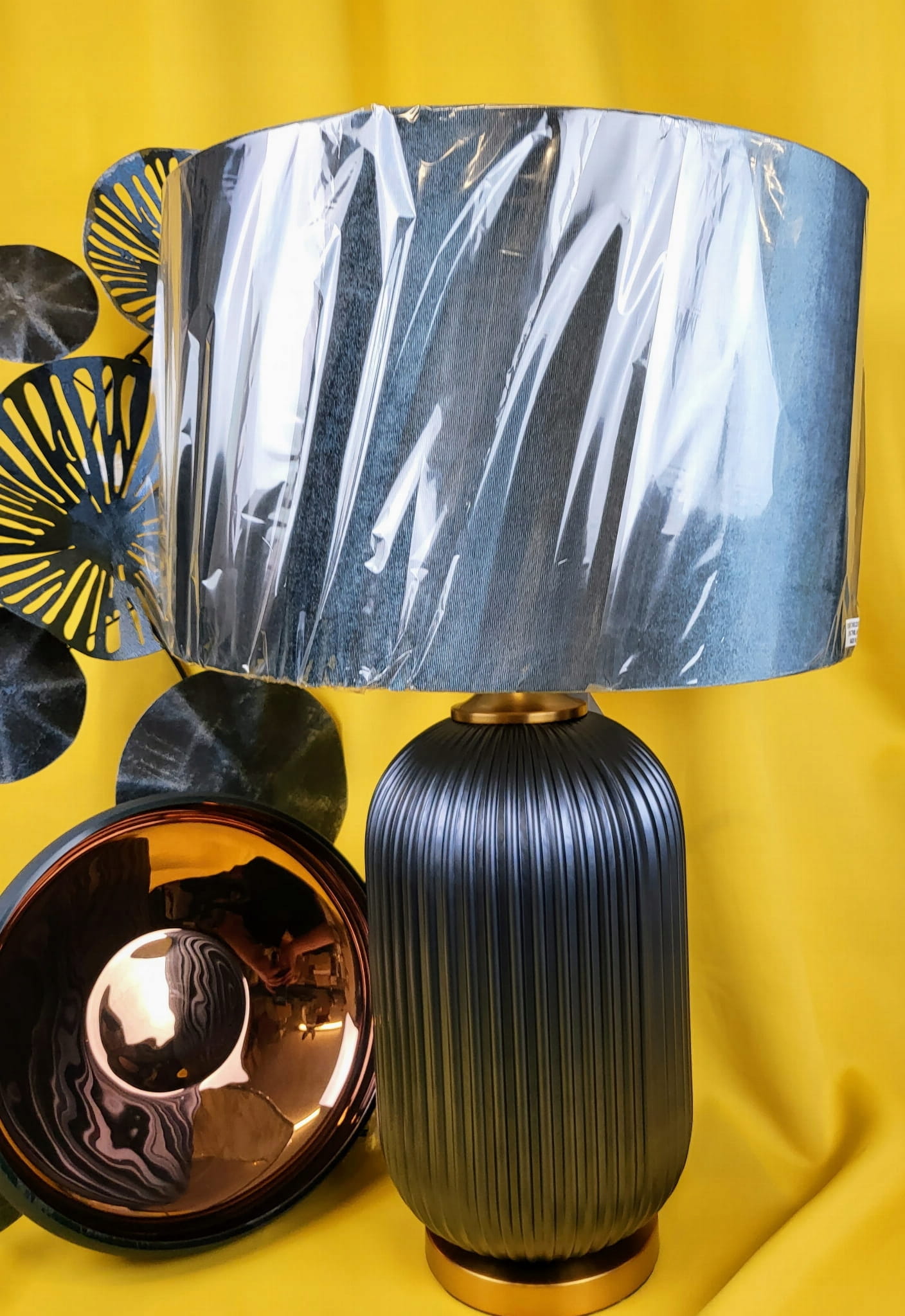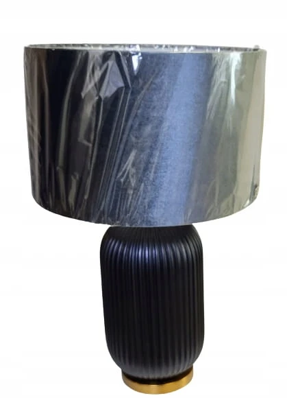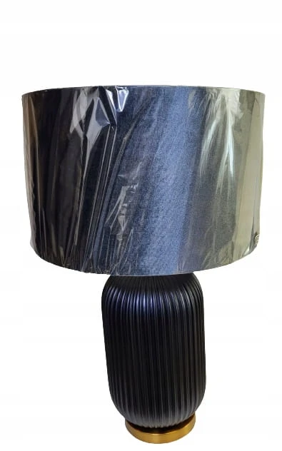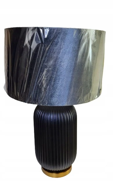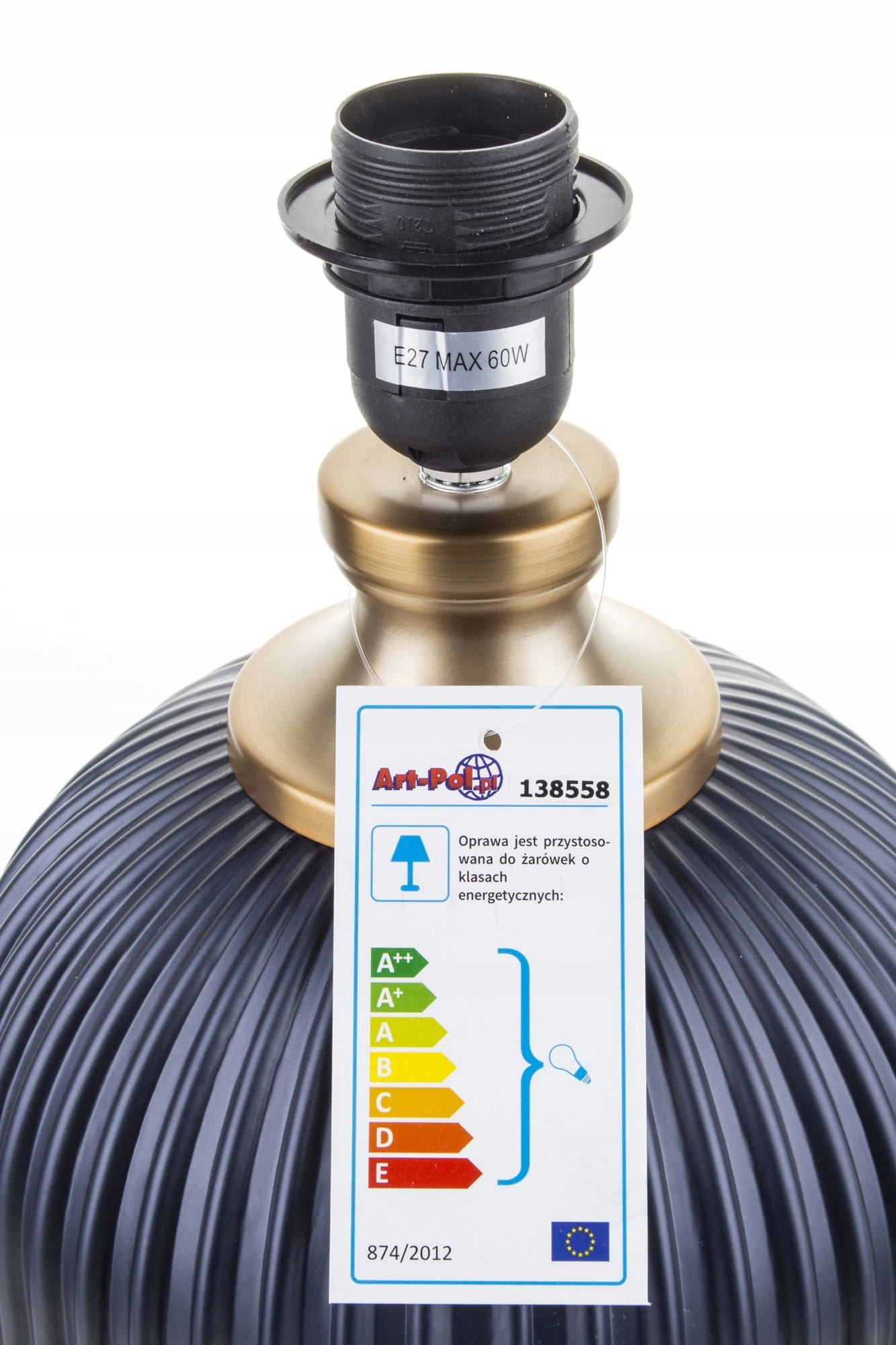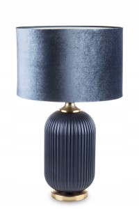 Podstawa o klasycznym prążkowanym kształcie w granatowym kolorze ze złotymi akcentami. Abażur wykonany z materiału w kolorze granatowym.