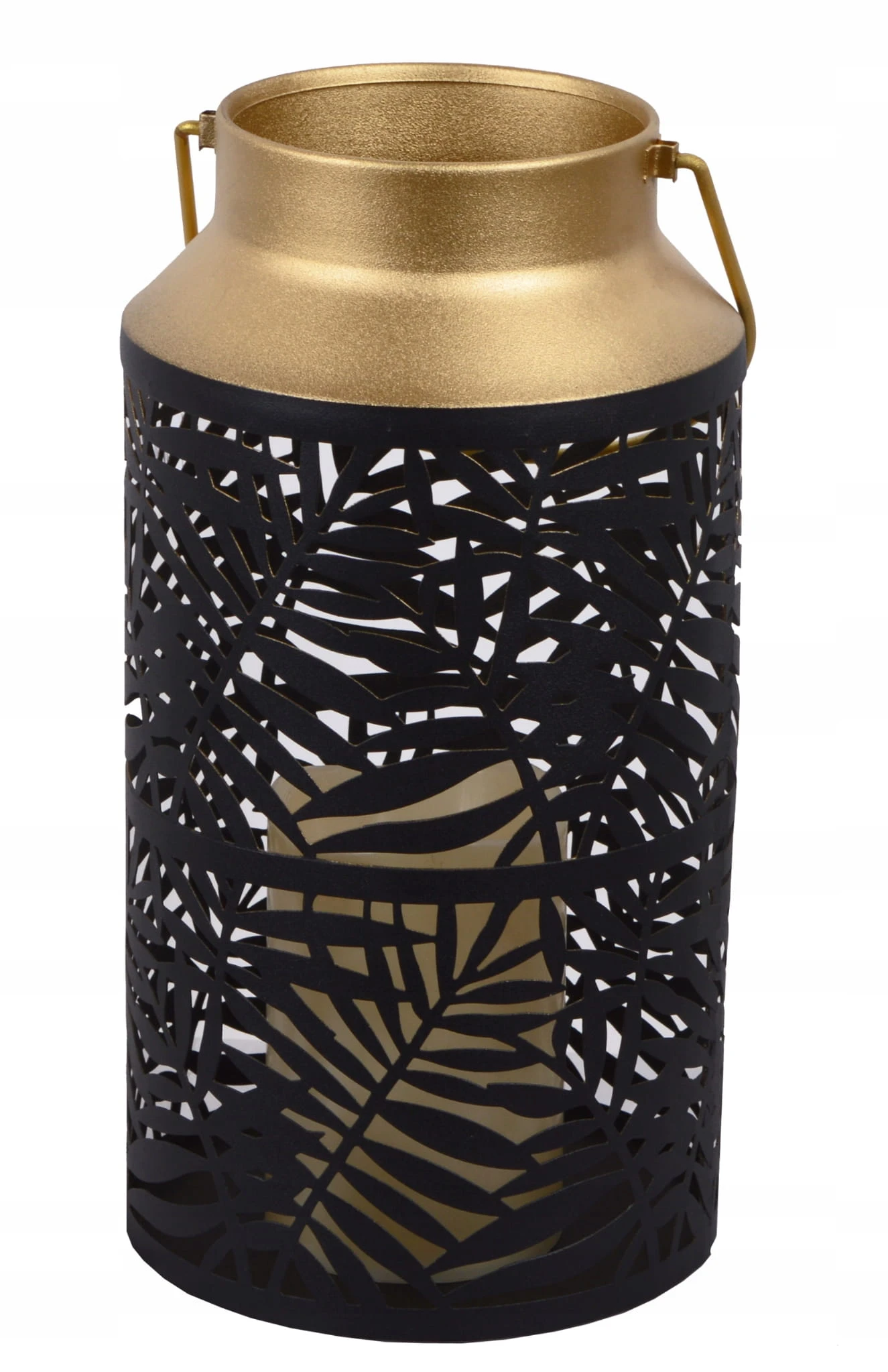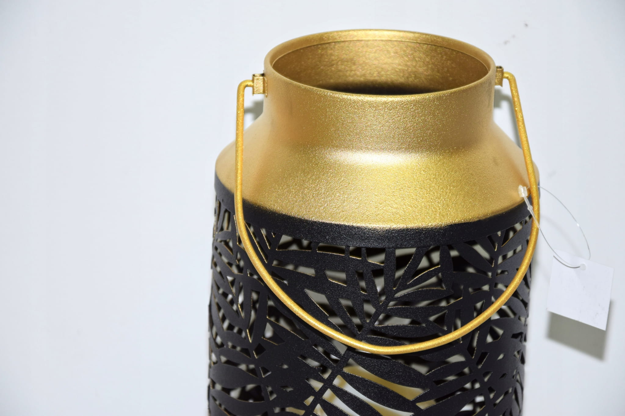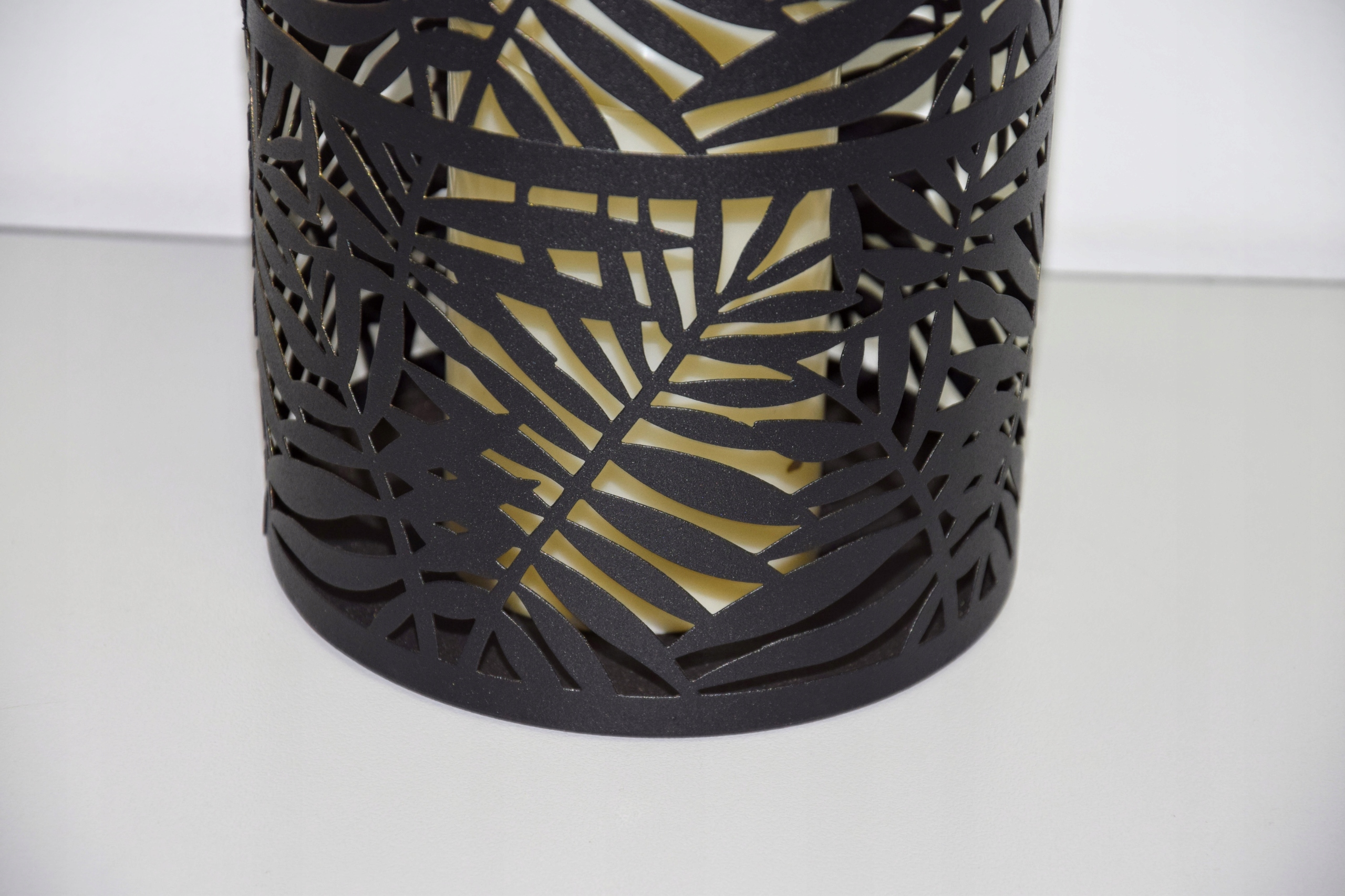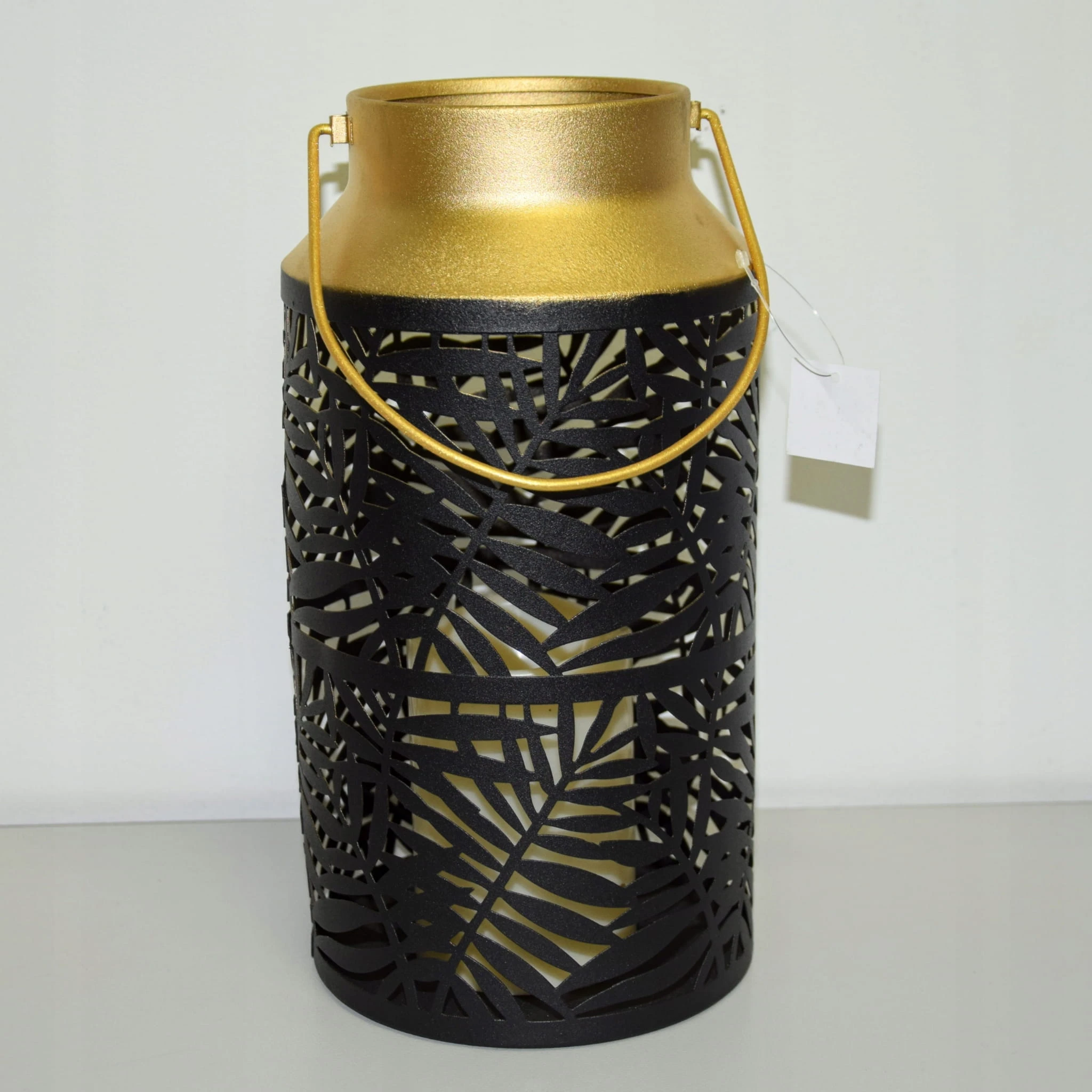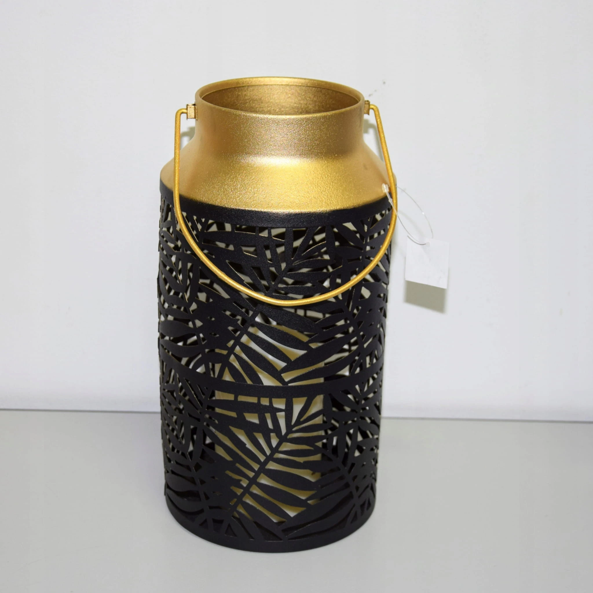 Matowy czarno-złoty lampion, z pięknym wycięciem przypominającym liść.