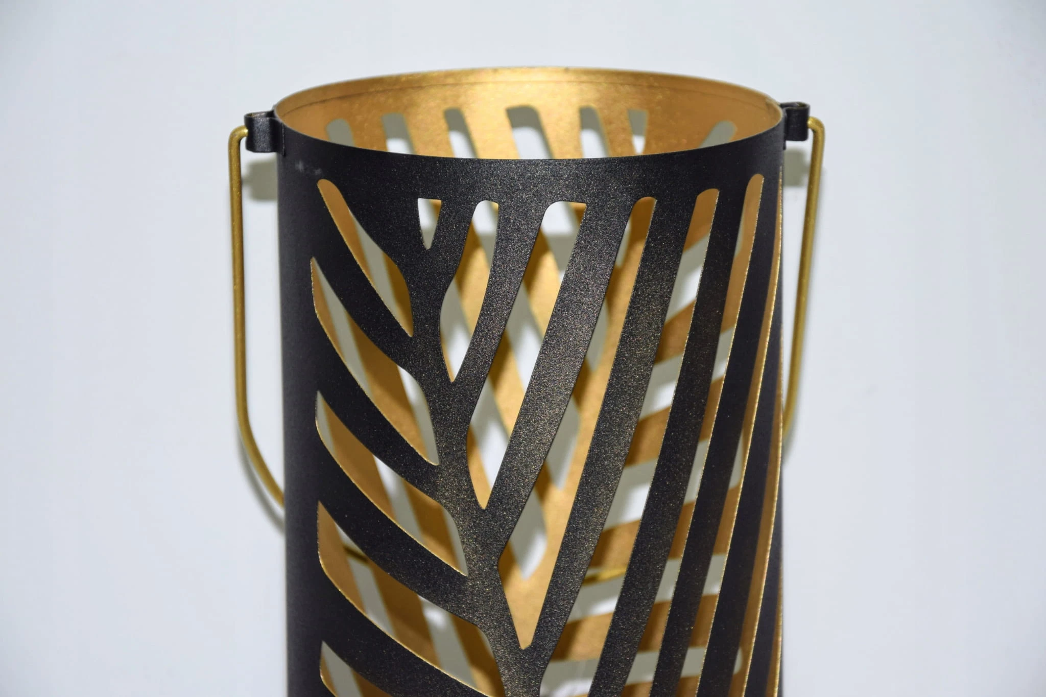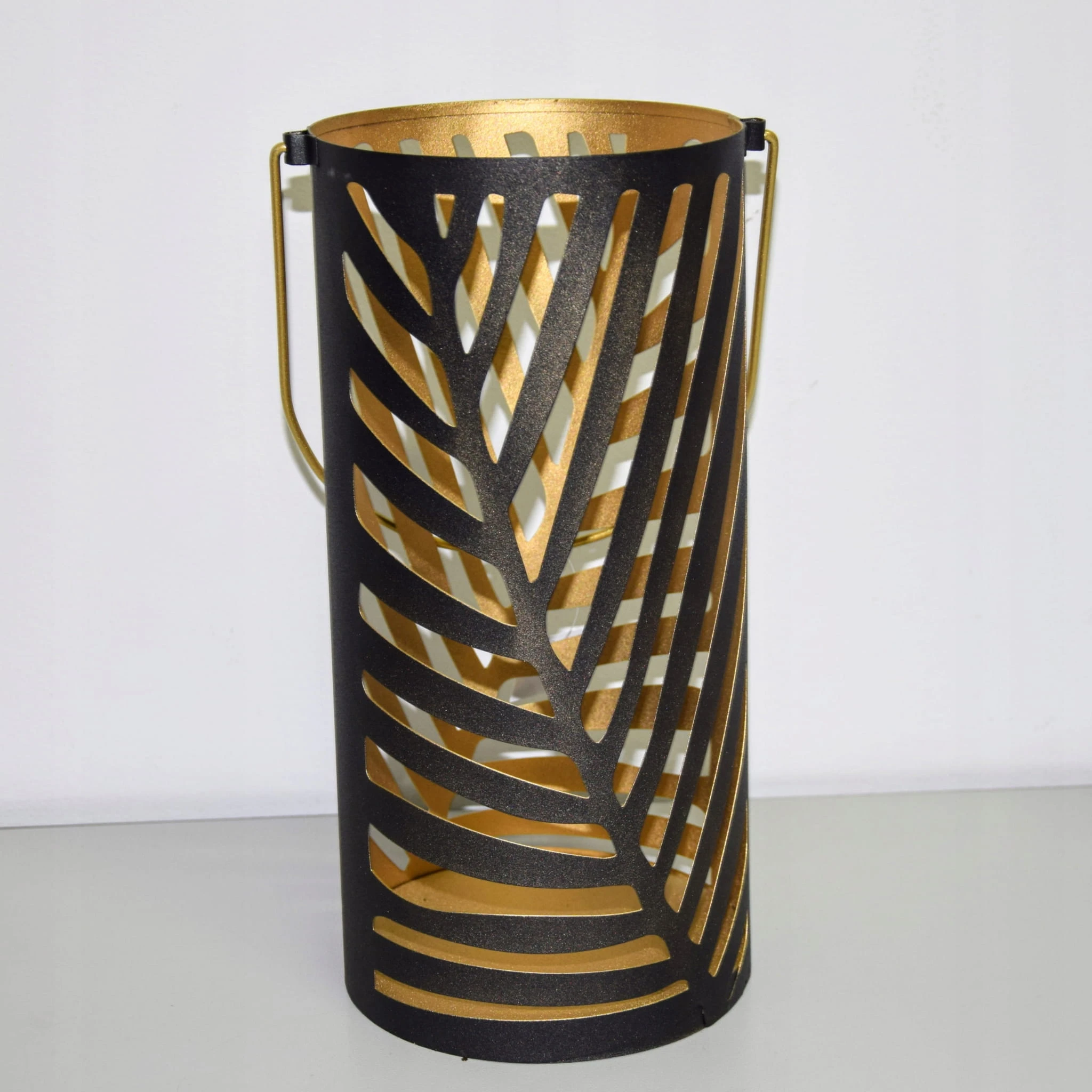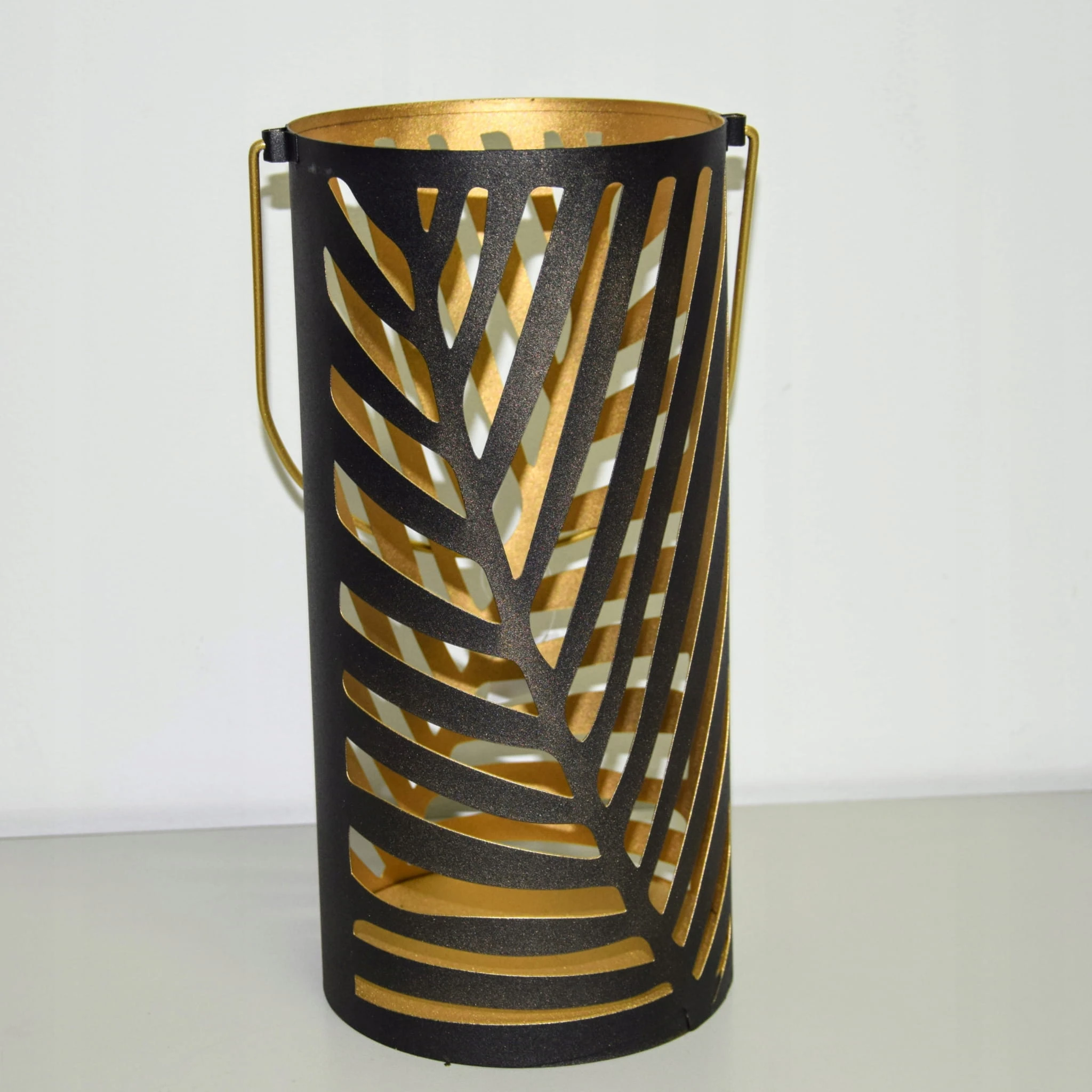 Ażurowa latarnia w czarnym kolorze, zdobiona motywem liści.