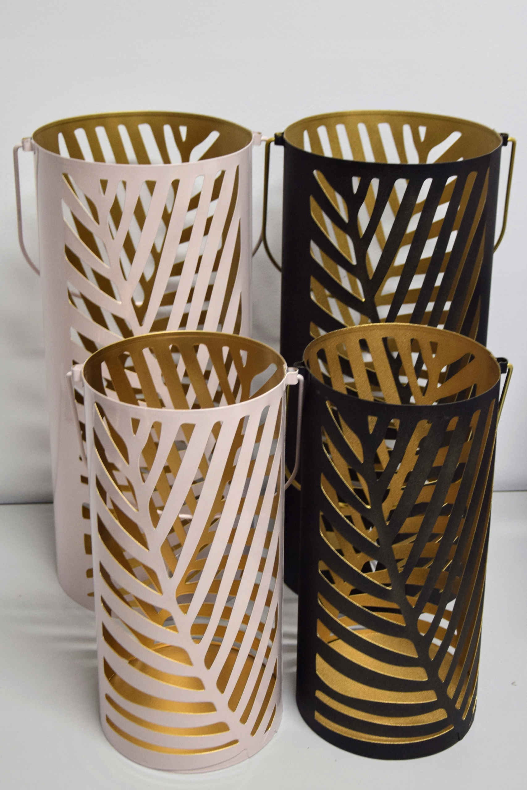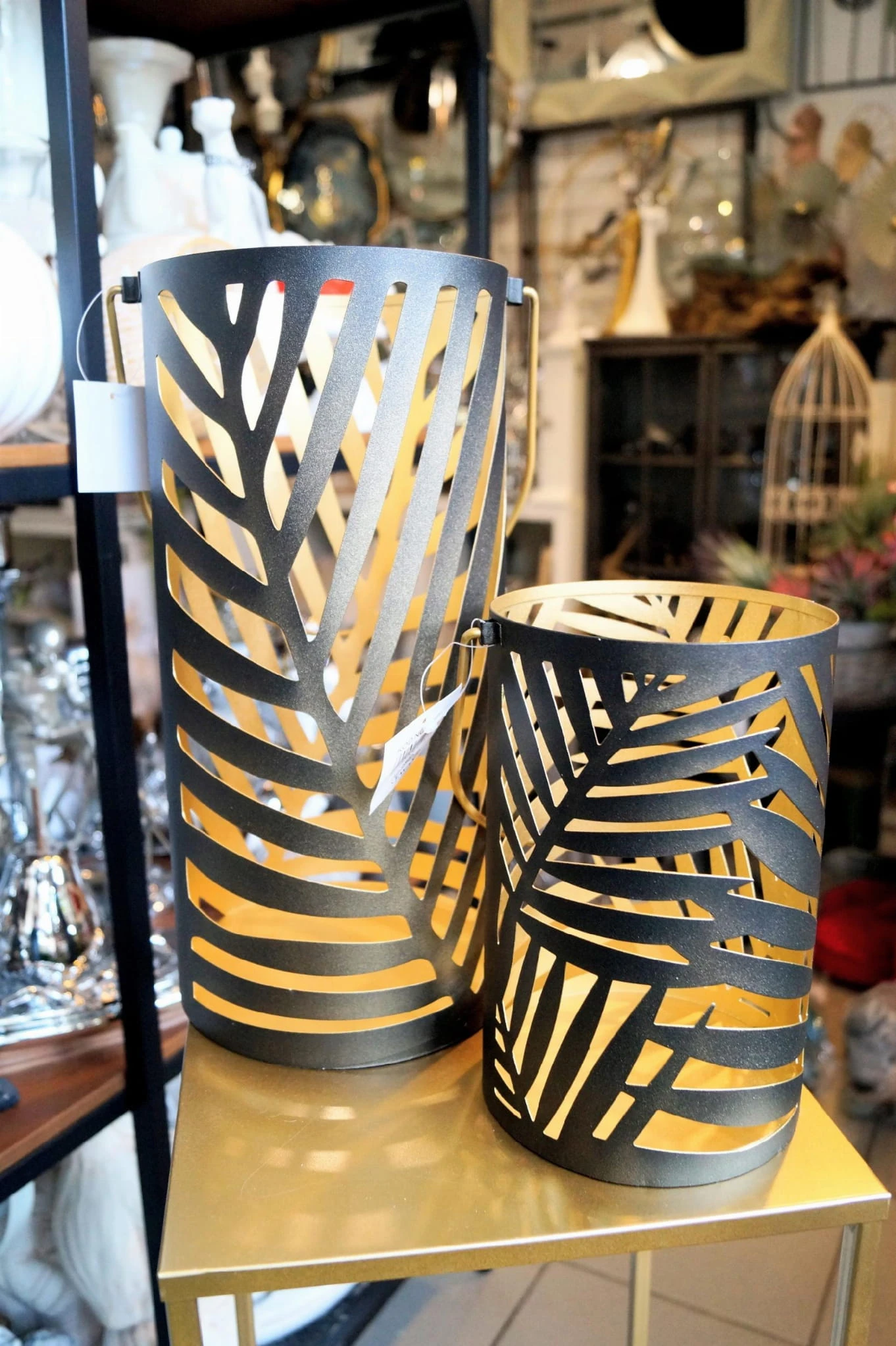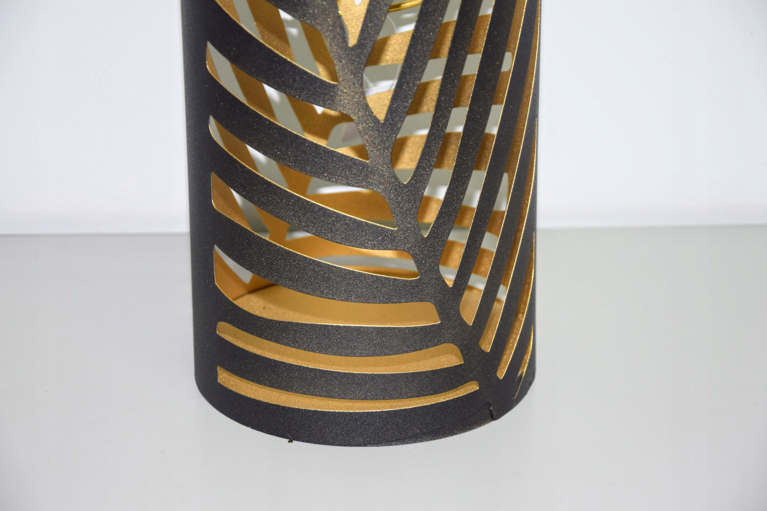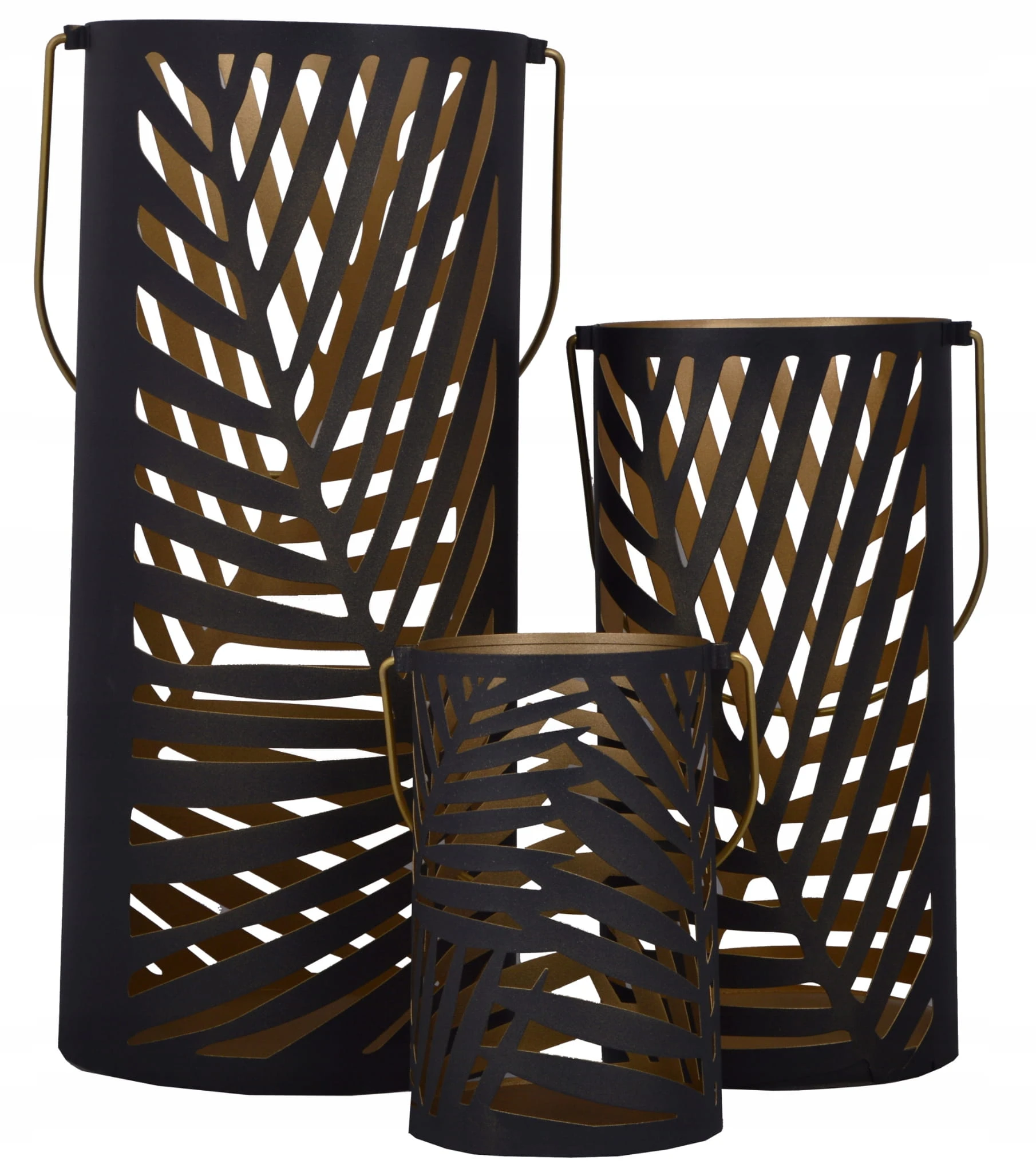 Ażurowa latarnia w czarnym kolorze, zdobiona motywem liści.