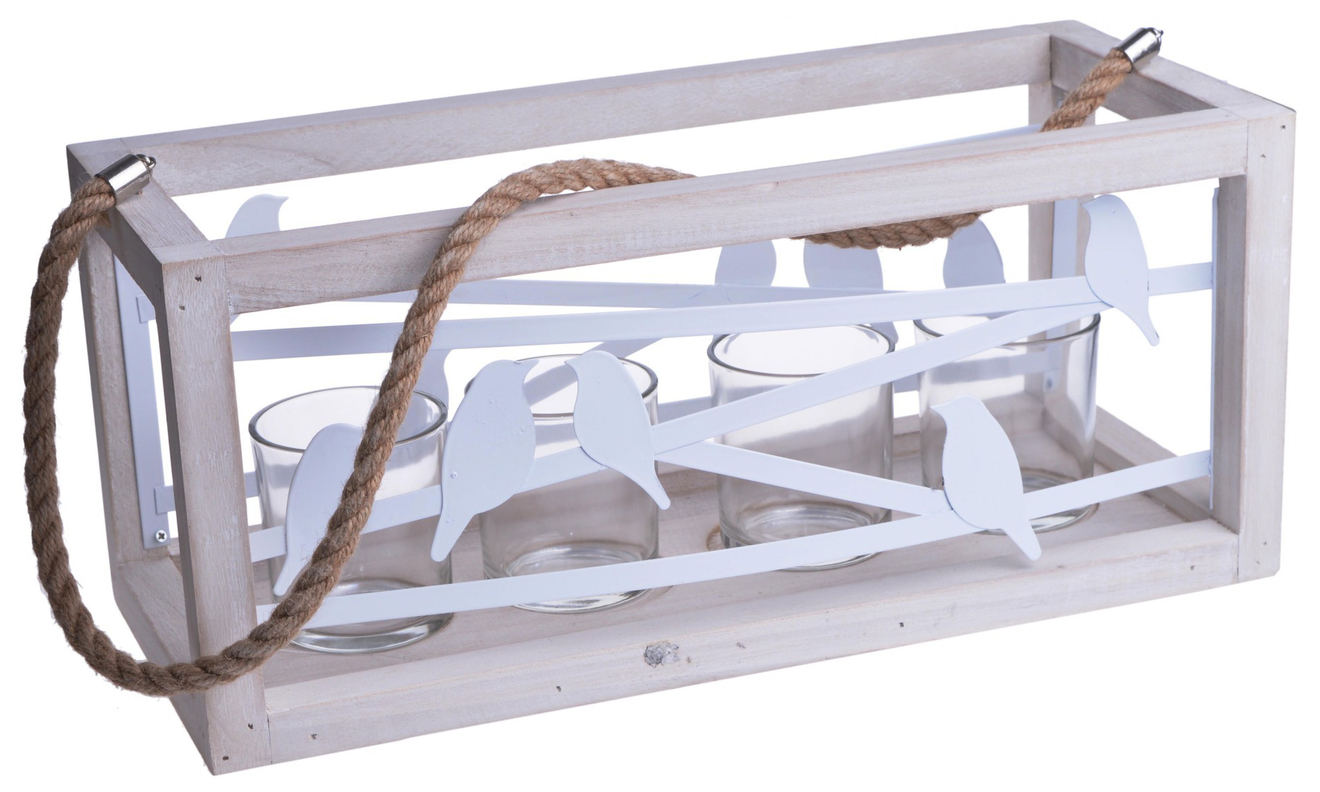 - materiał: drewno (rama) + metal (biała drkoracja ścianek) + szkło (kielich zabezpieczające przed przypadkowym zgaszeniem lub wylaniem świecy)