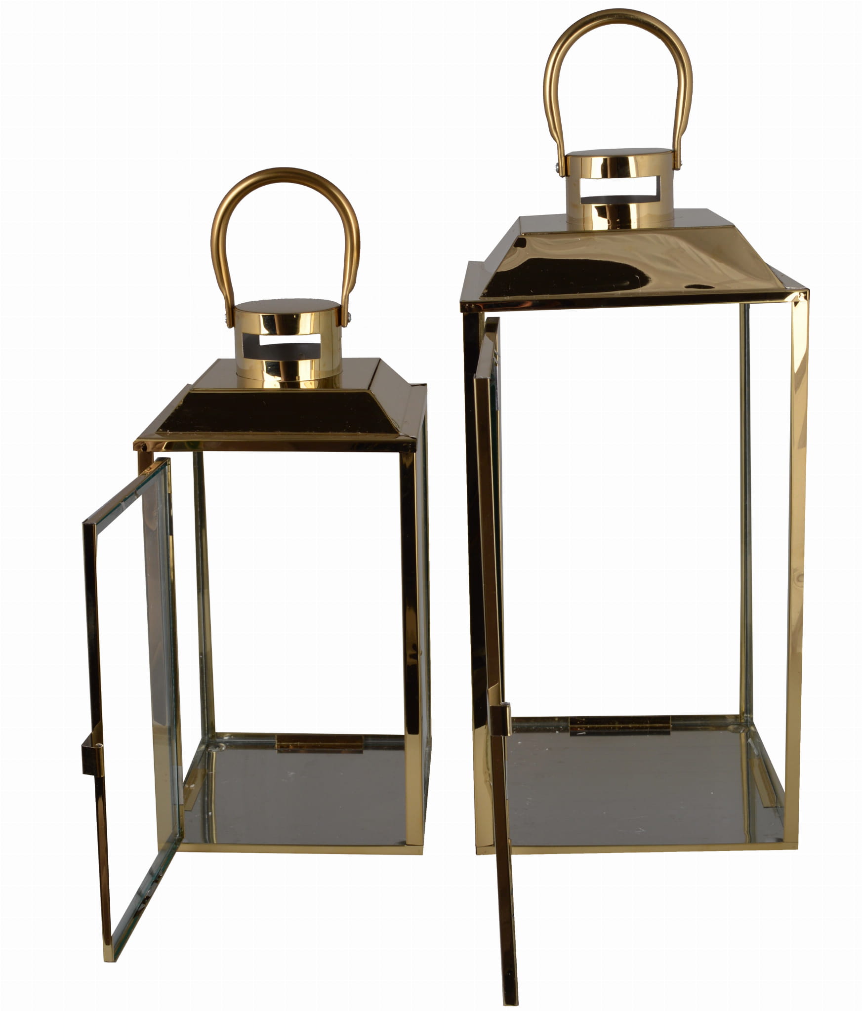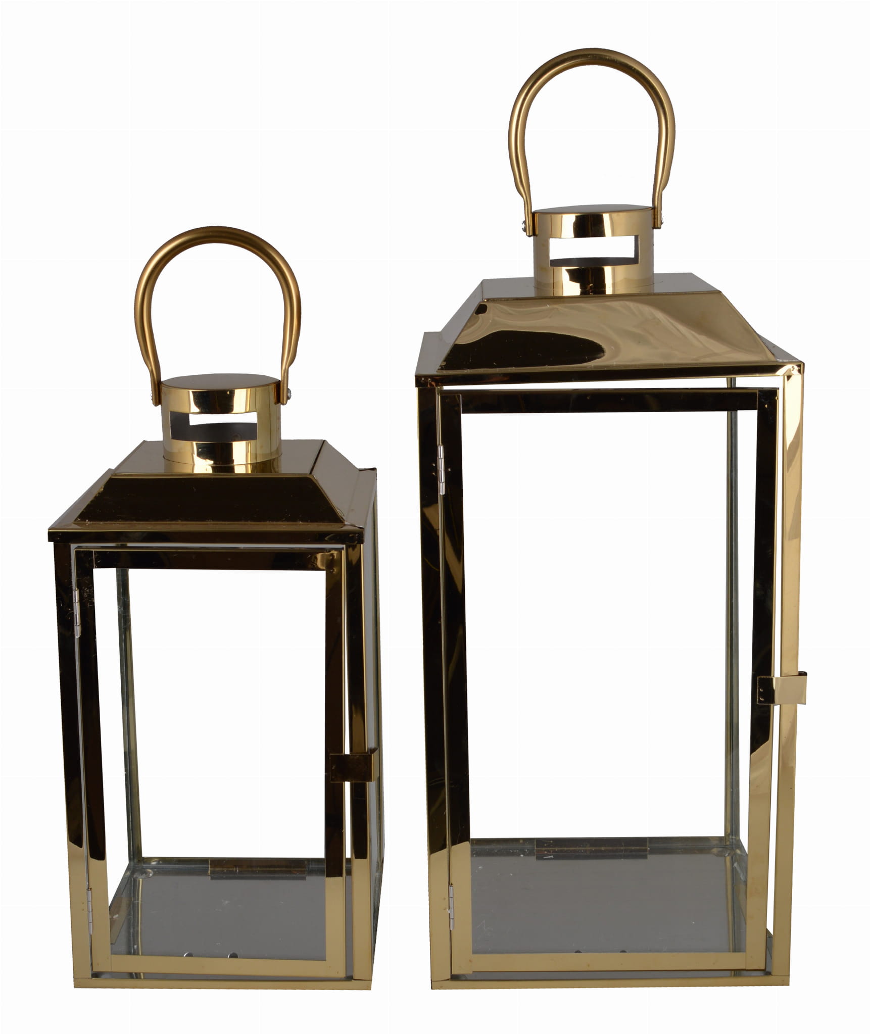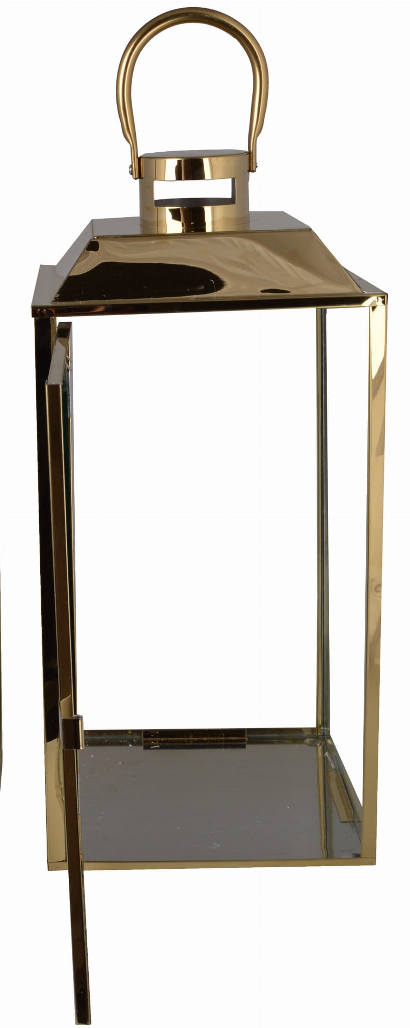 Złoty lampion wykonany z metalu ze szklanymi szybkami.