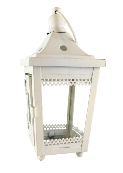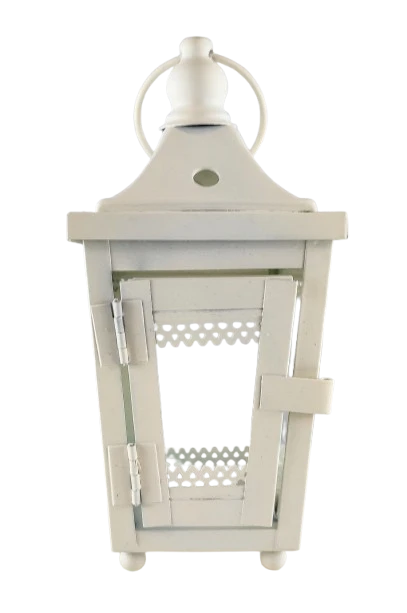 Biały metalowy lampion z szklanymi ściankami i zamykanymi drzwiczkami.