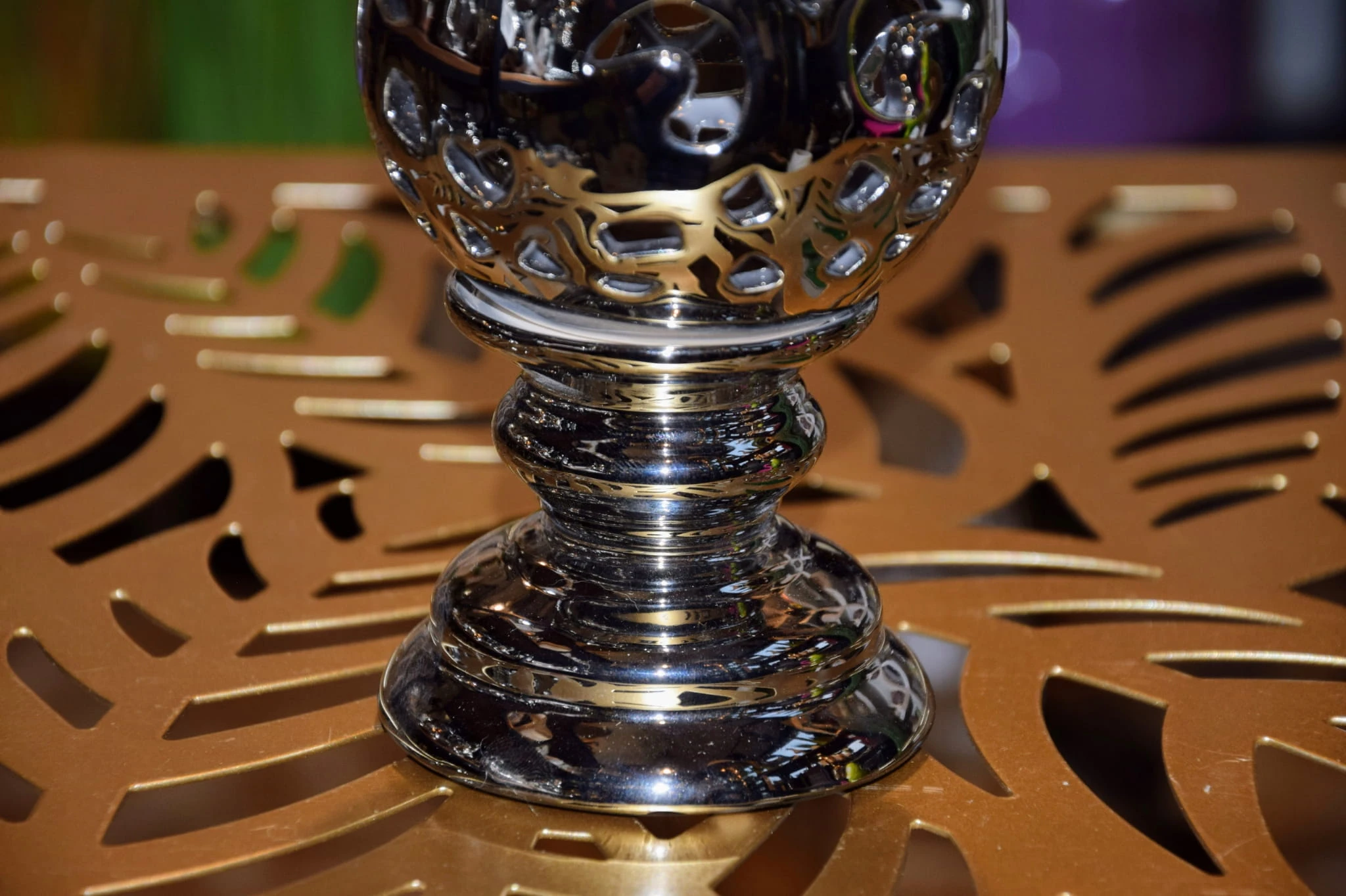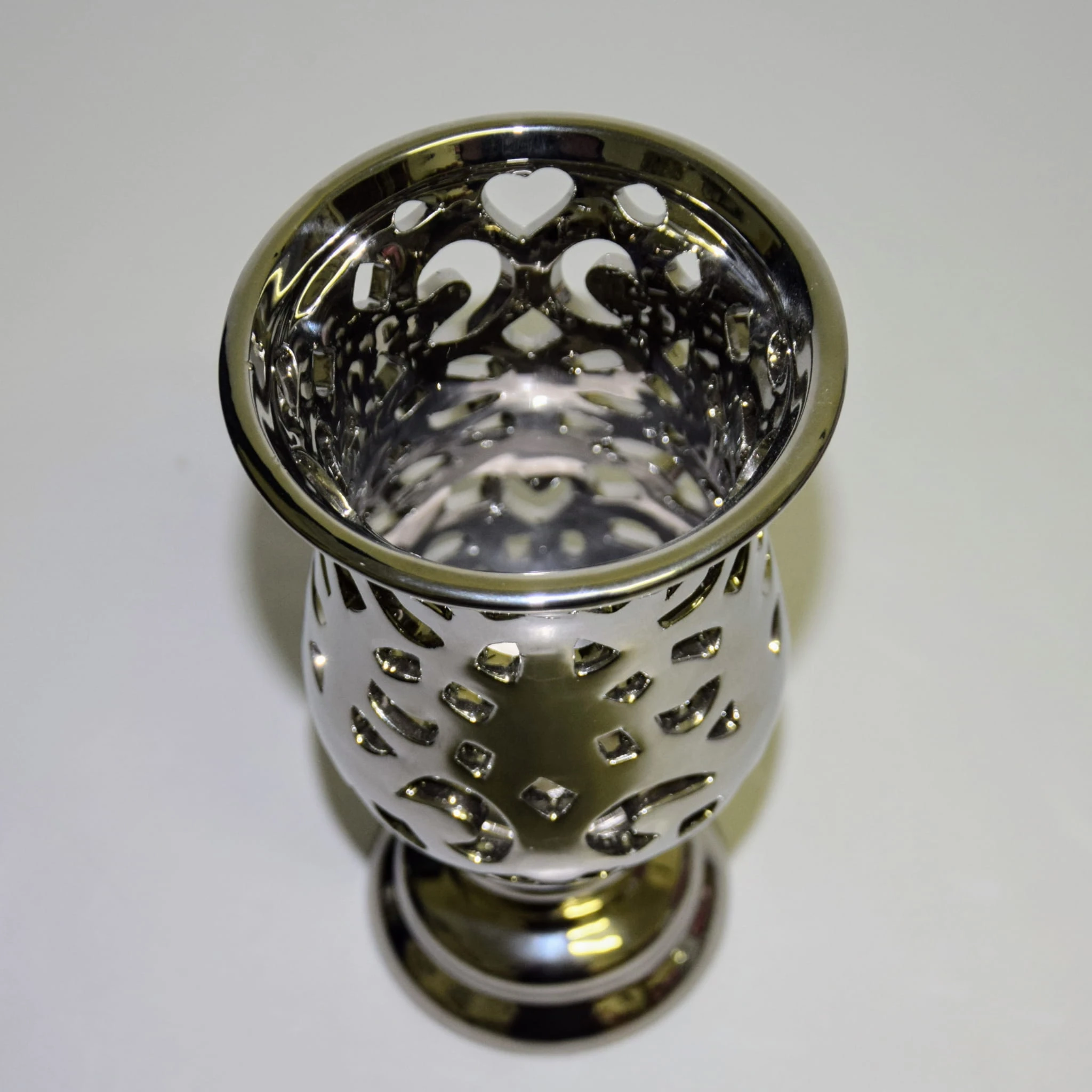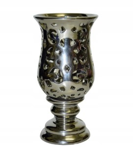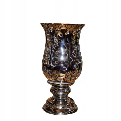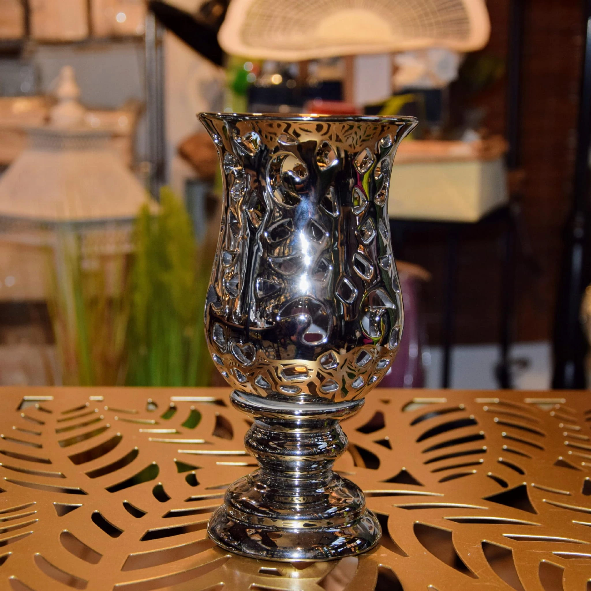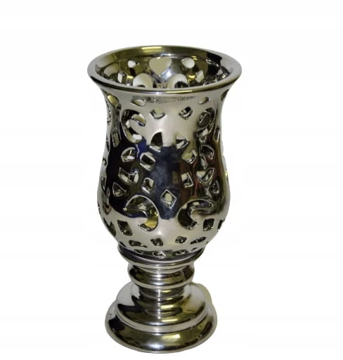 Ażurowy, lustrzany lampion wykonany z ceramiki. Dzięki swojej lustrzanej powłoce idealnie wpasuję się do każdego typu wnętrza.