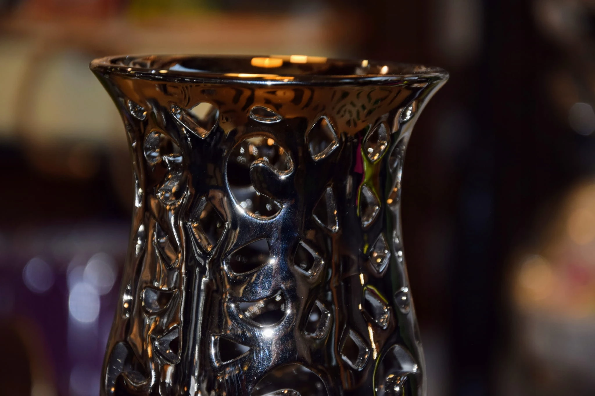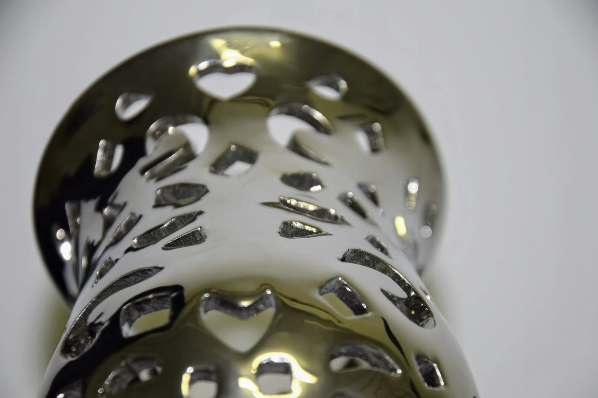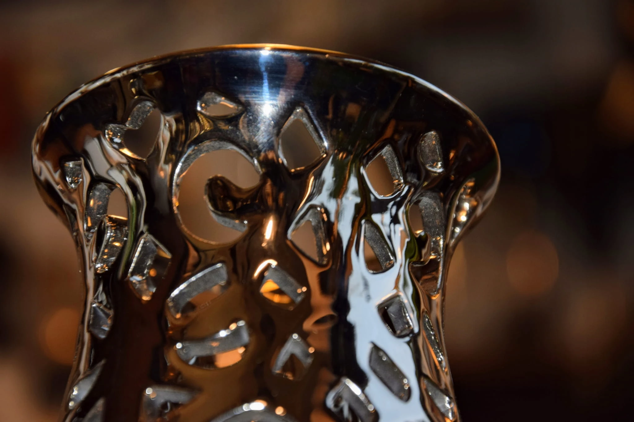 Ażurowy, lustrzany lampion wykonany z ceramiki. Dzięki swojej lustrzanej powłoce idealnie wpasuję się do każdego typu wnętrza.