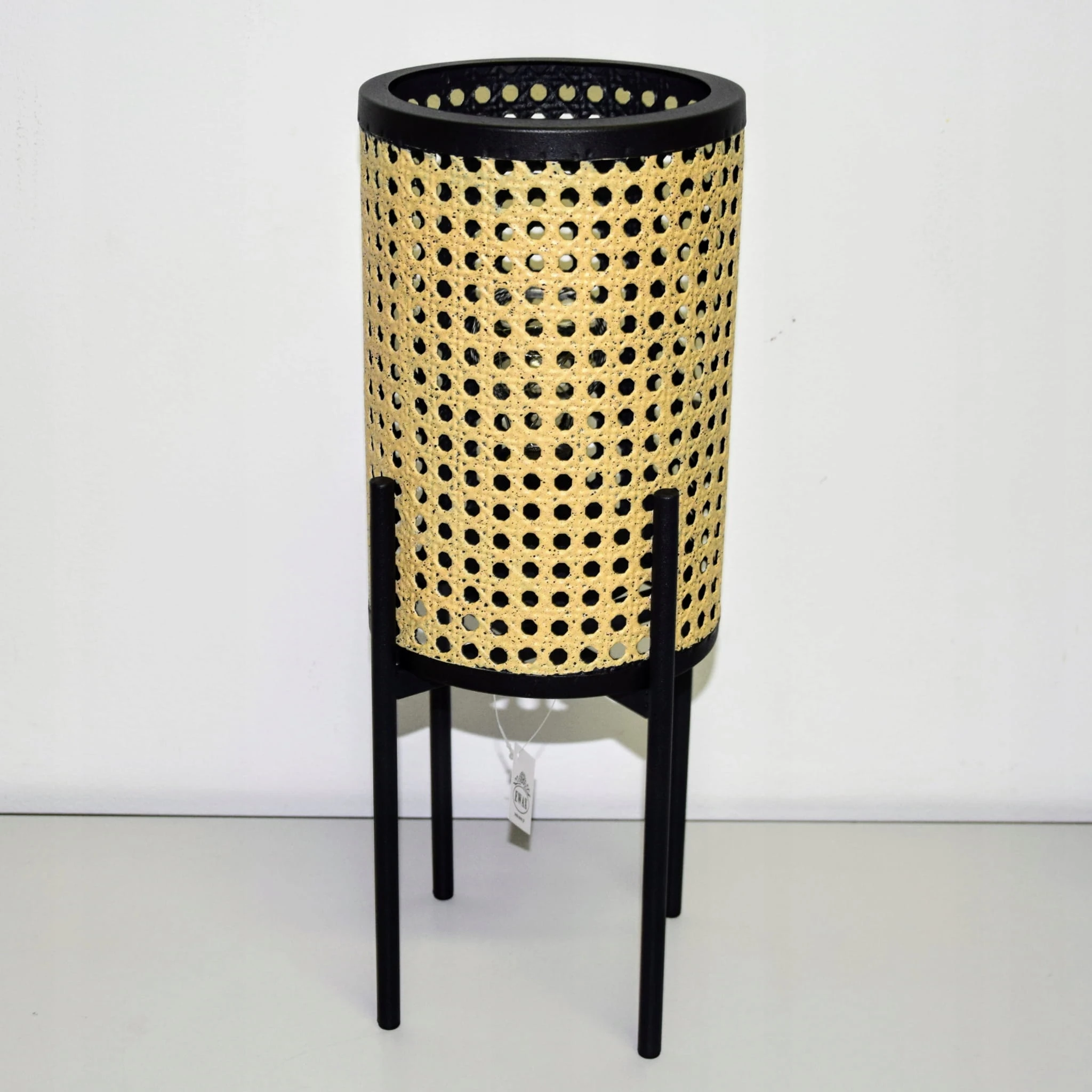 Matowy beżowo-czarny lampion z pięknym wycięciem przypominającym liść.