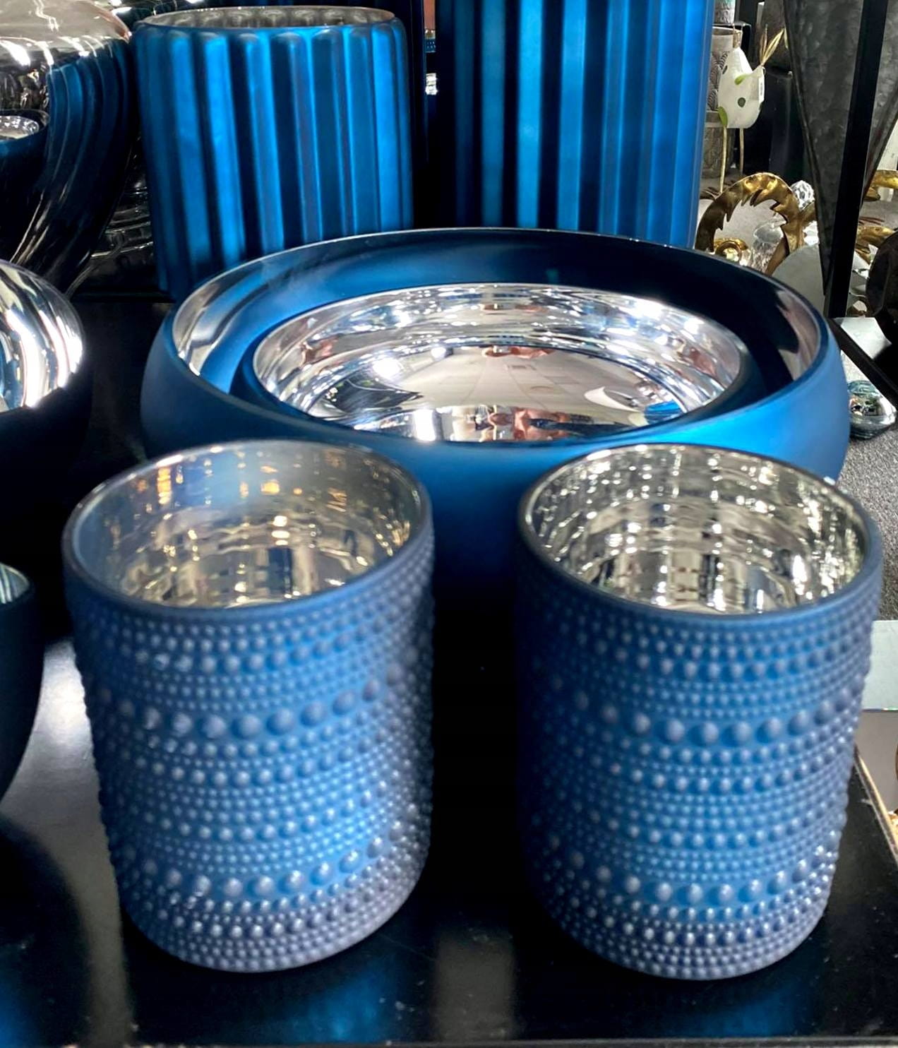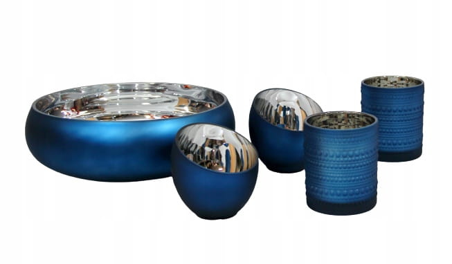 Niebieski mat na zewnątrz a wewnątrz błyszczące srebro.