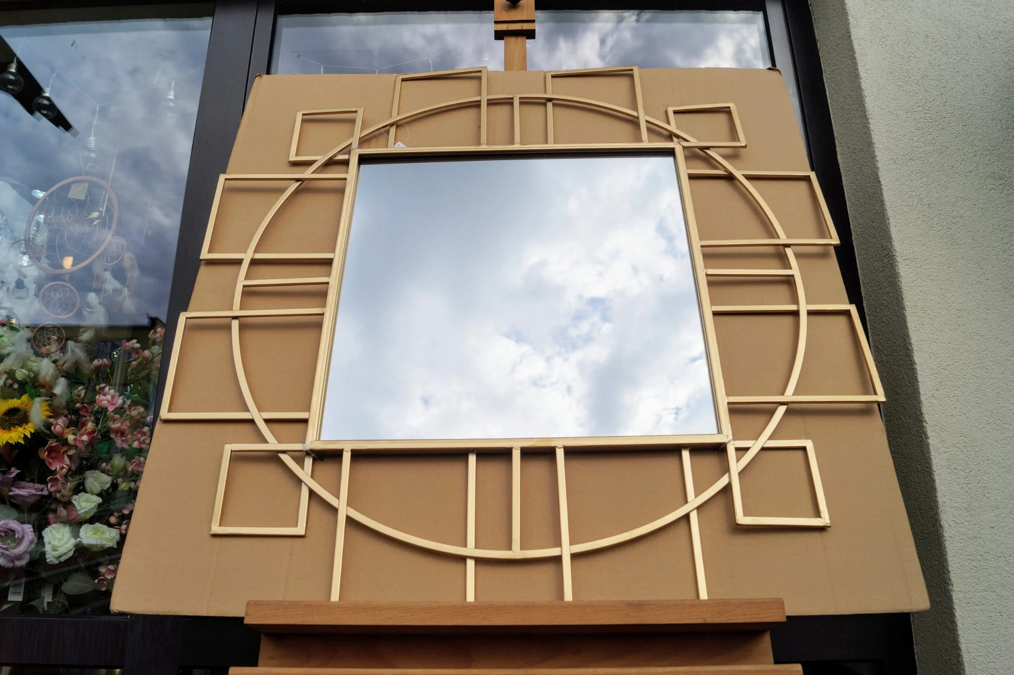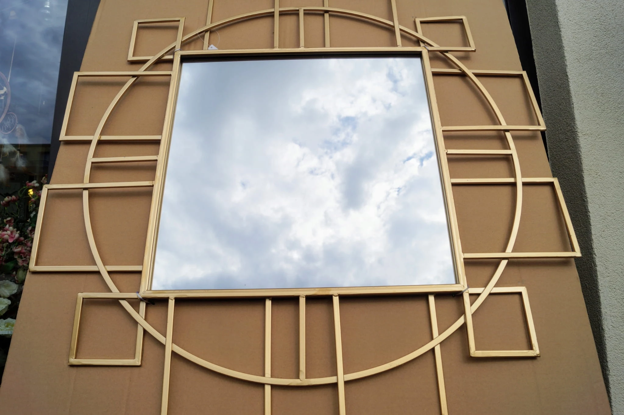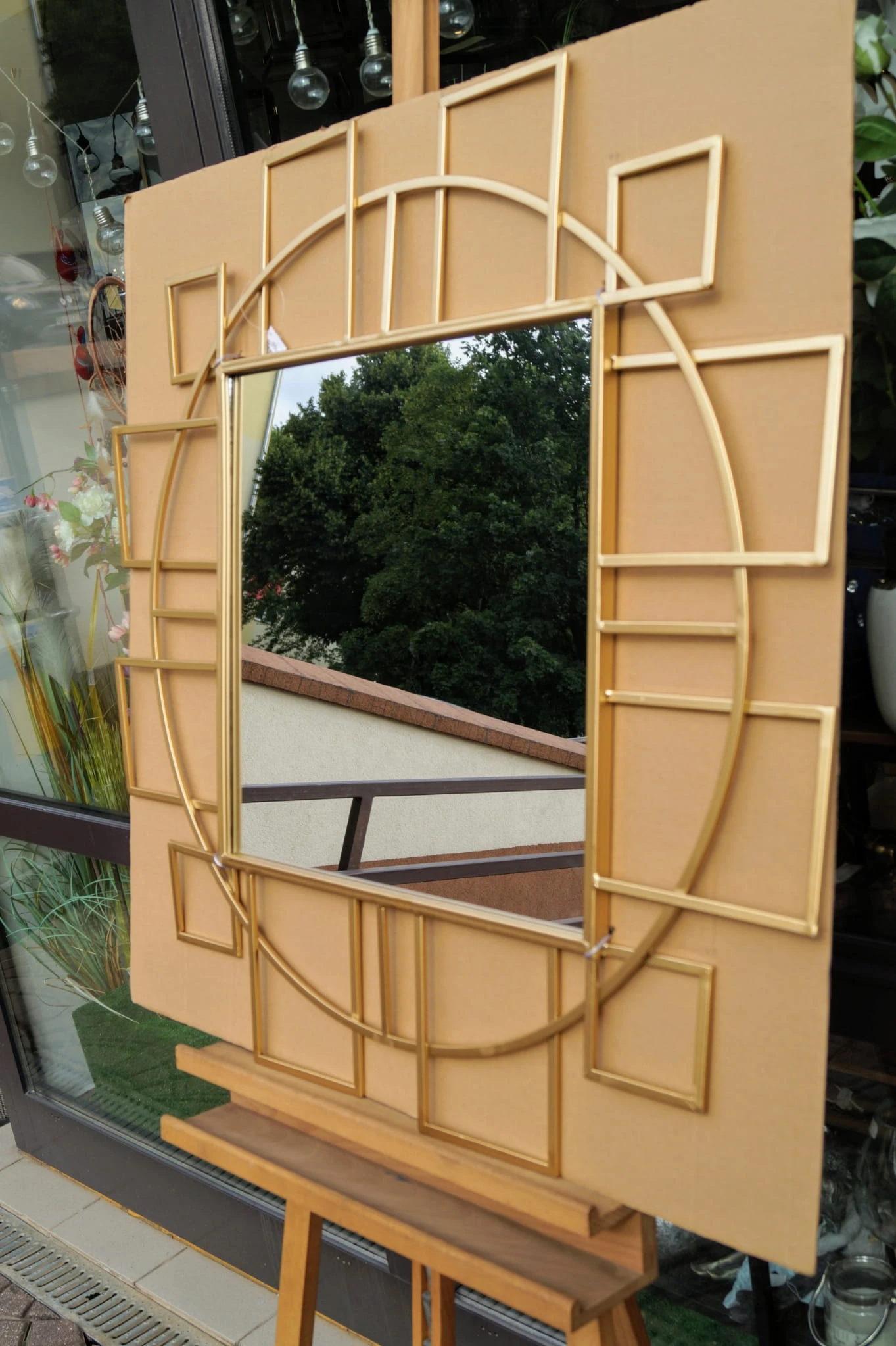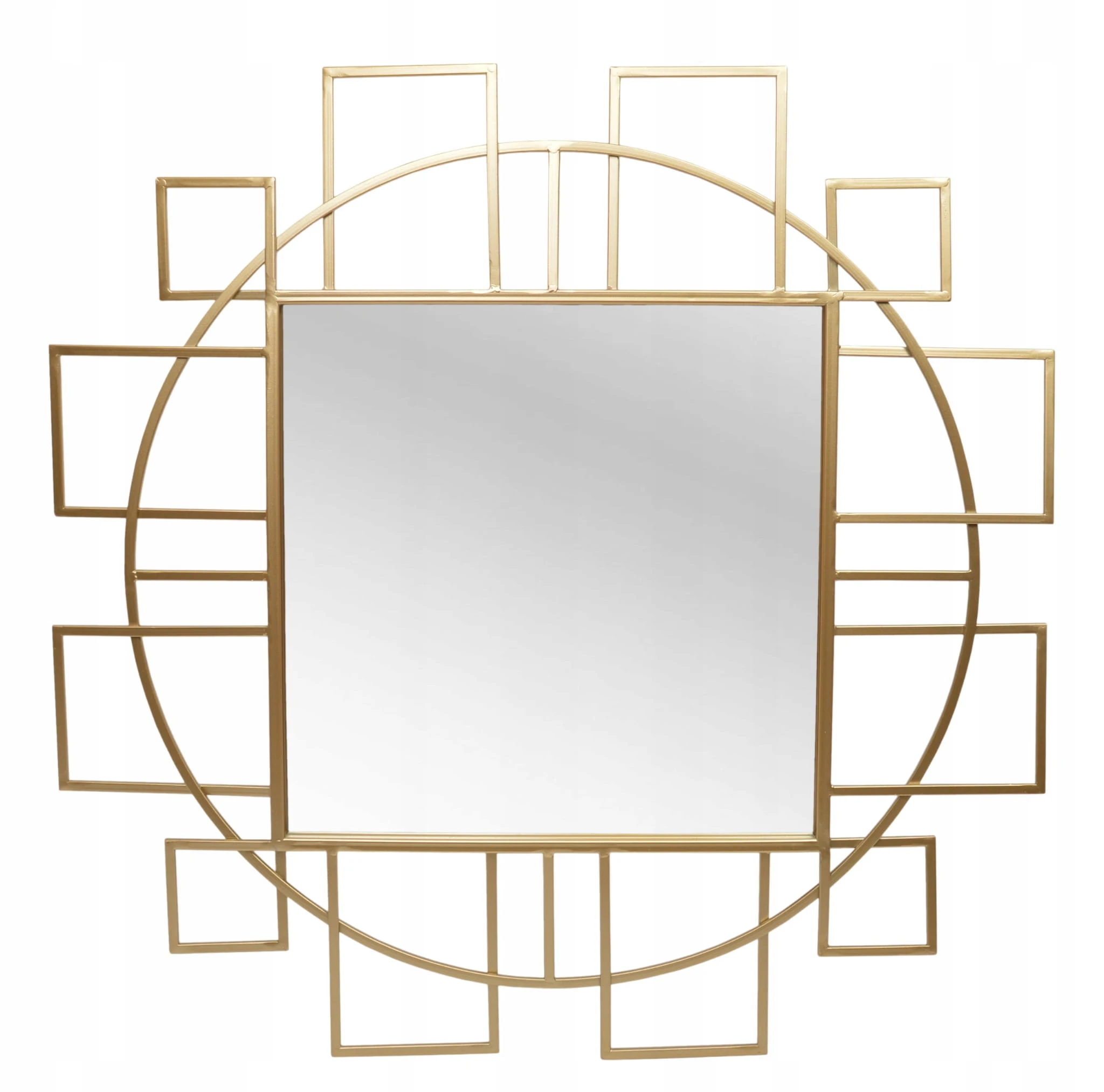 Metalowe, geometryczne lustro z wykończeniem w złotym kolorze.