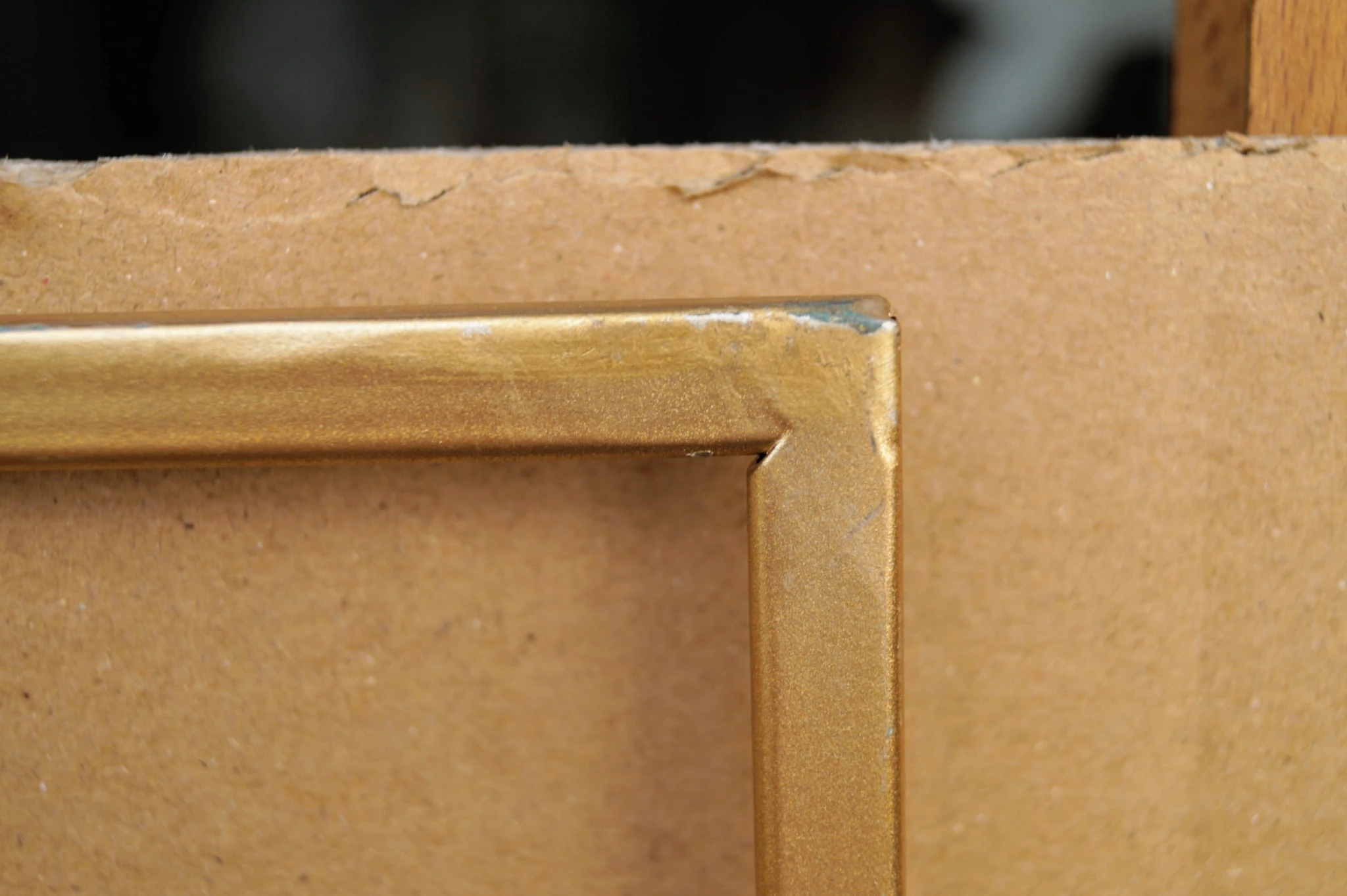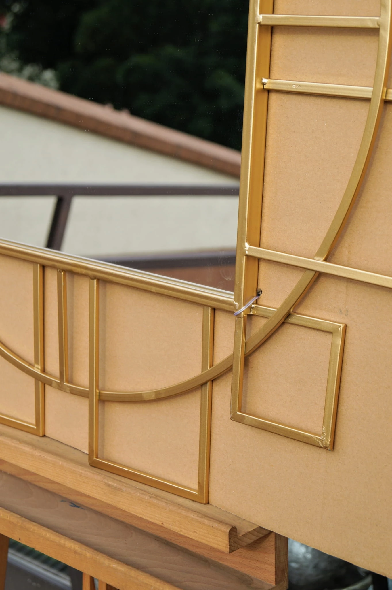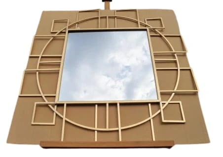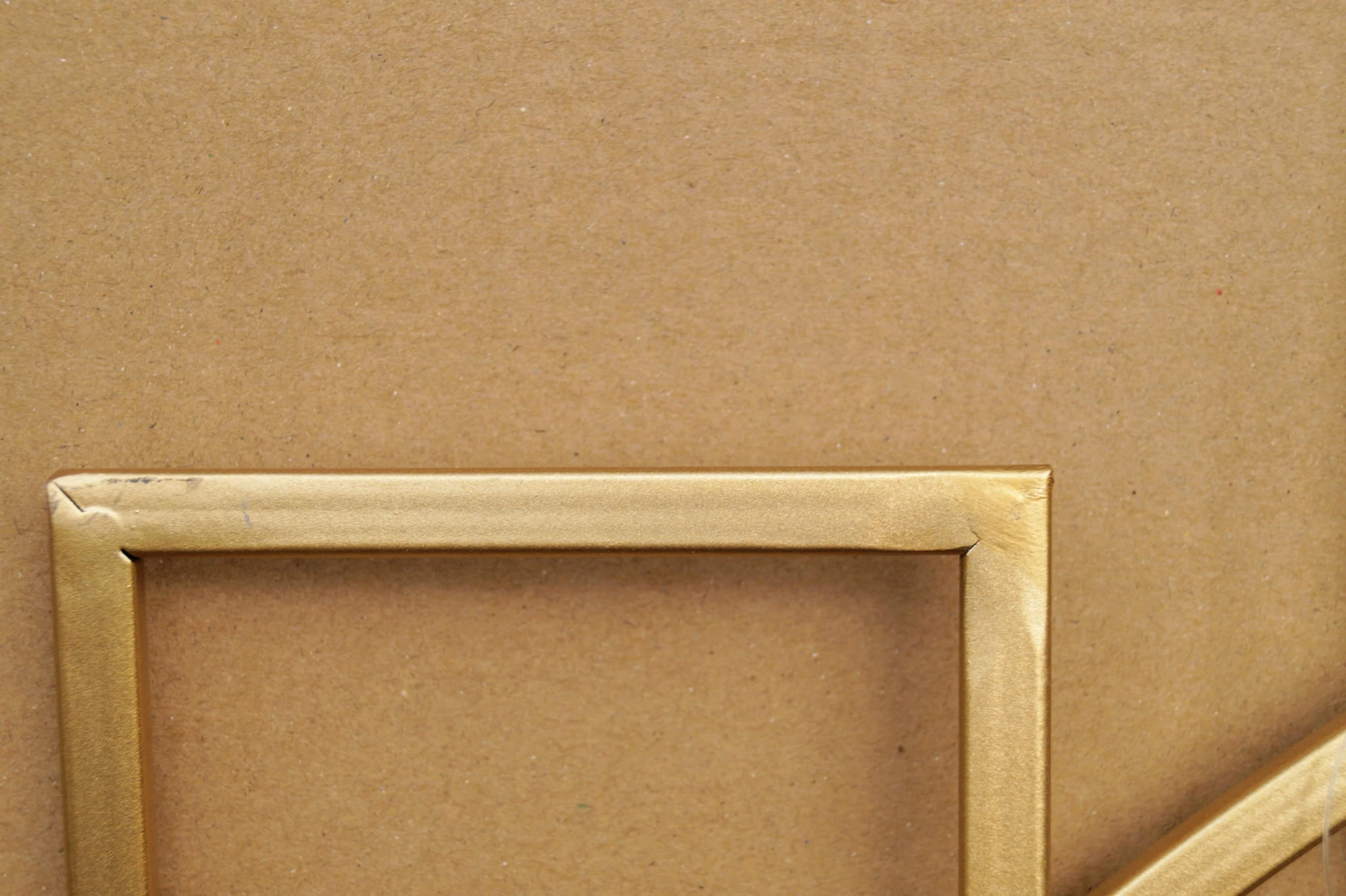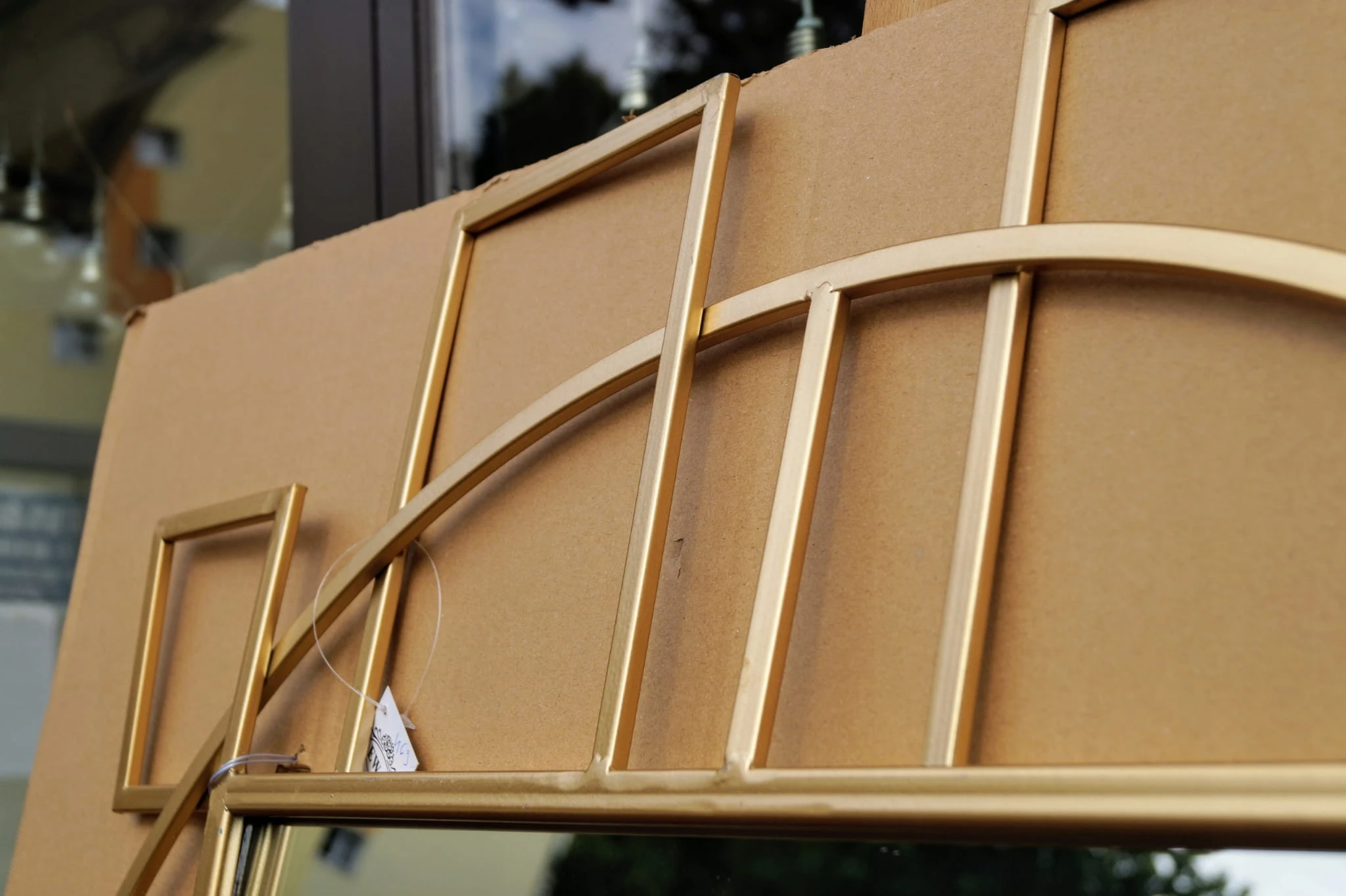 Metalowe, geometryczne lustro z wykończeniem w złotym kolorze.