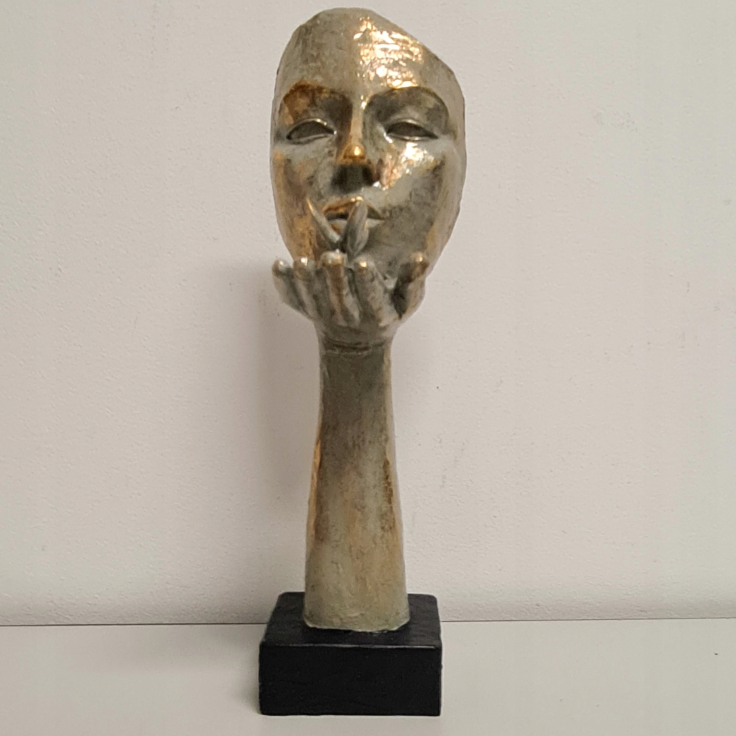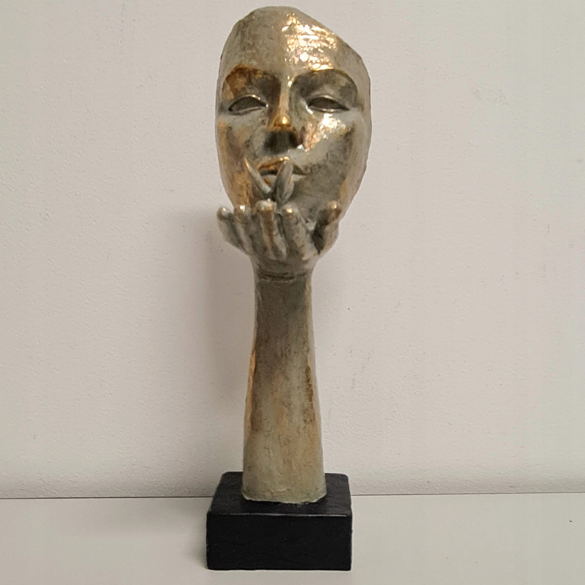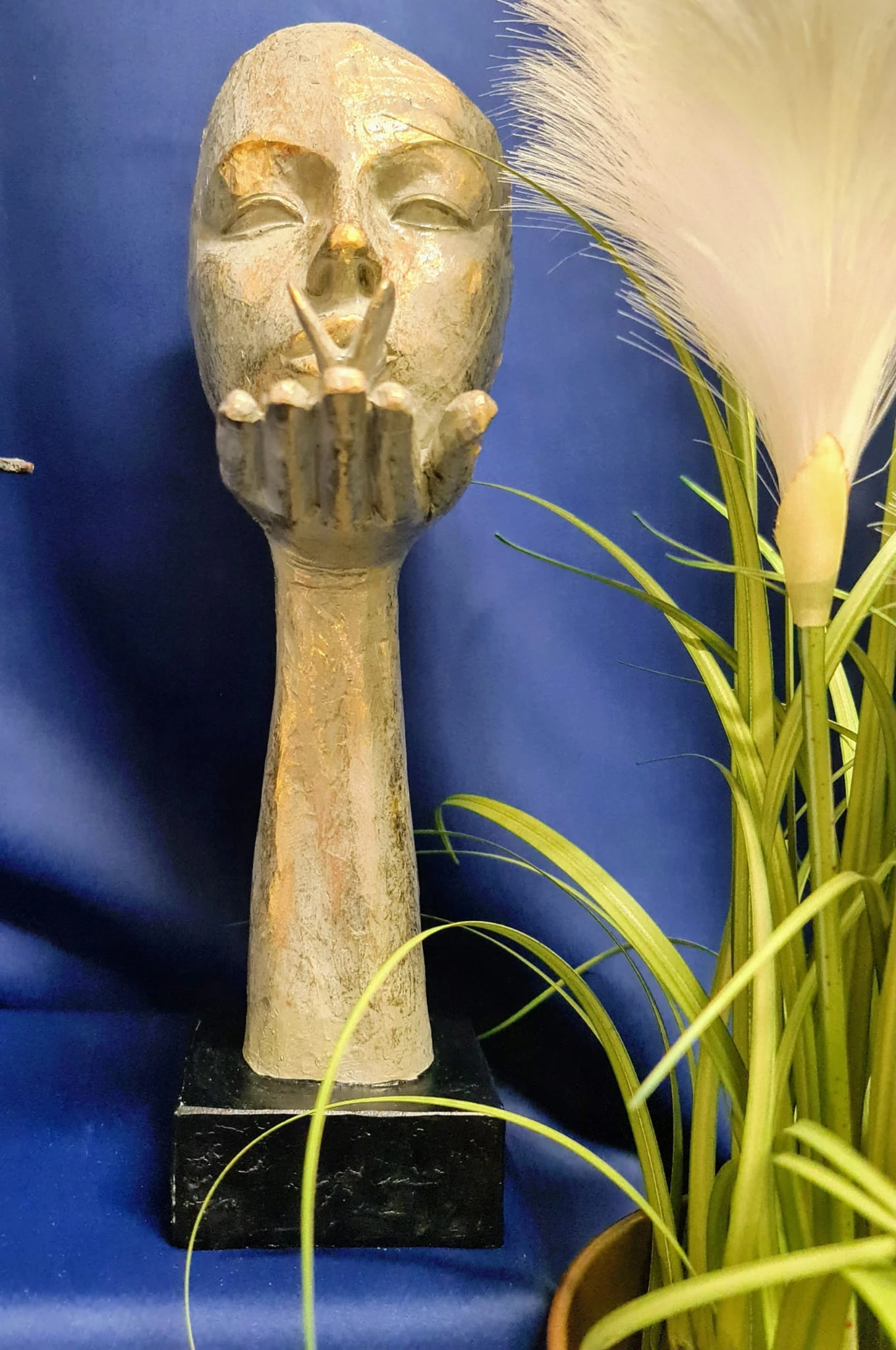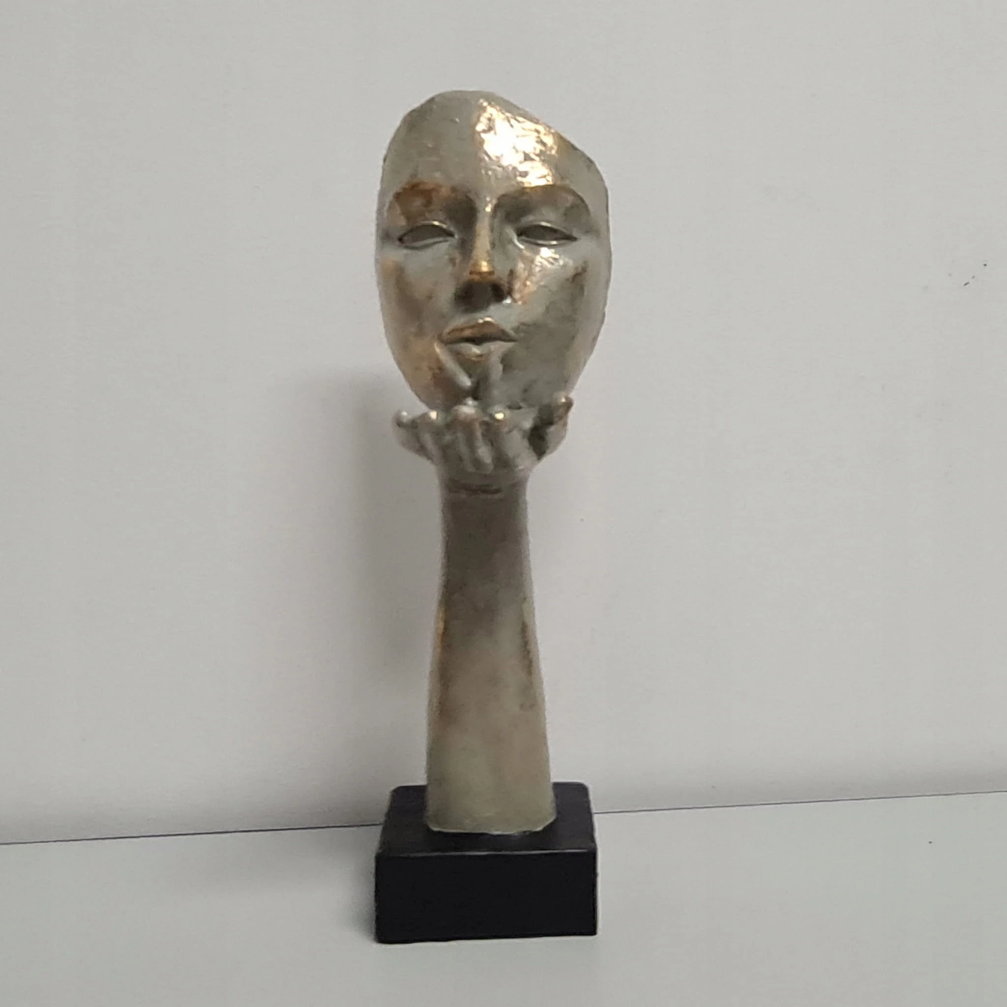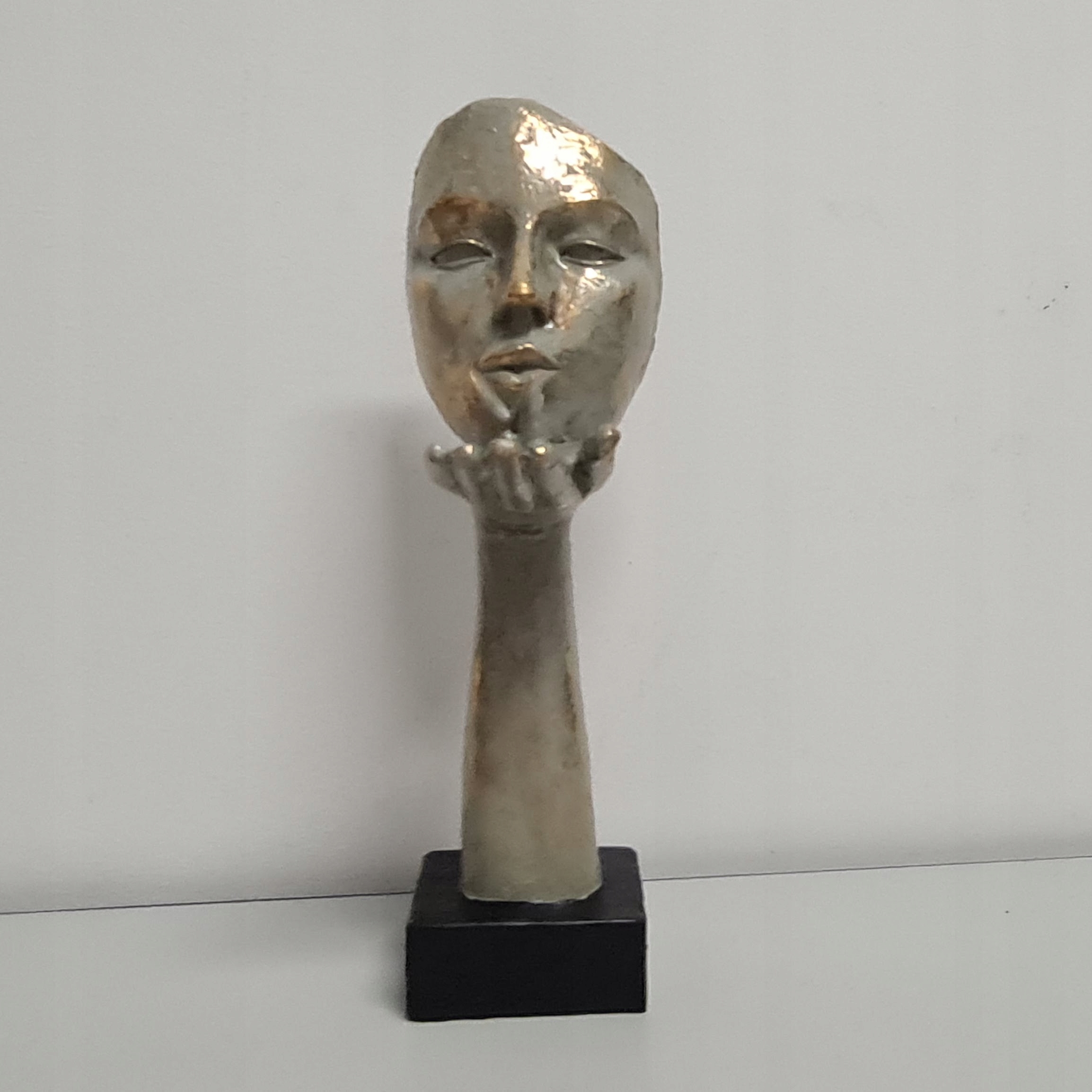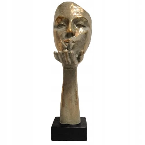 Dekoracja w kształcie maski, w złotym kolorze, na czarnej podstawie.