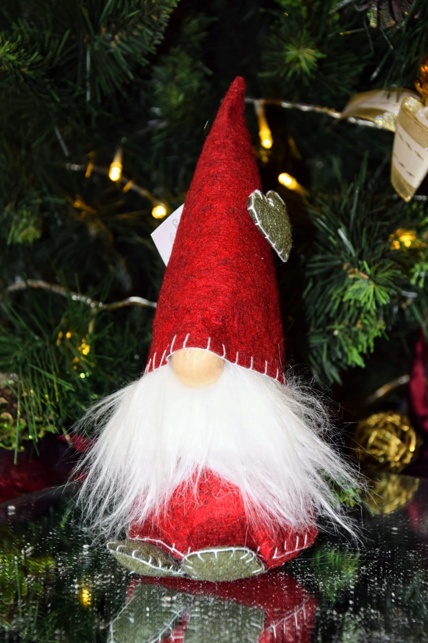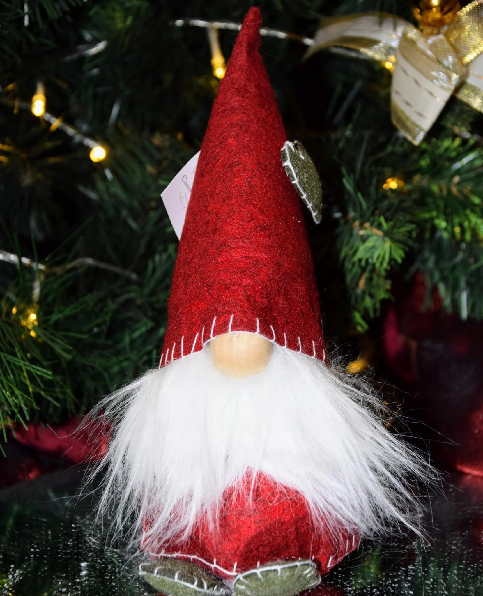 Uroczy skrzat z kędzierzawą brodą i zabawną czapką.