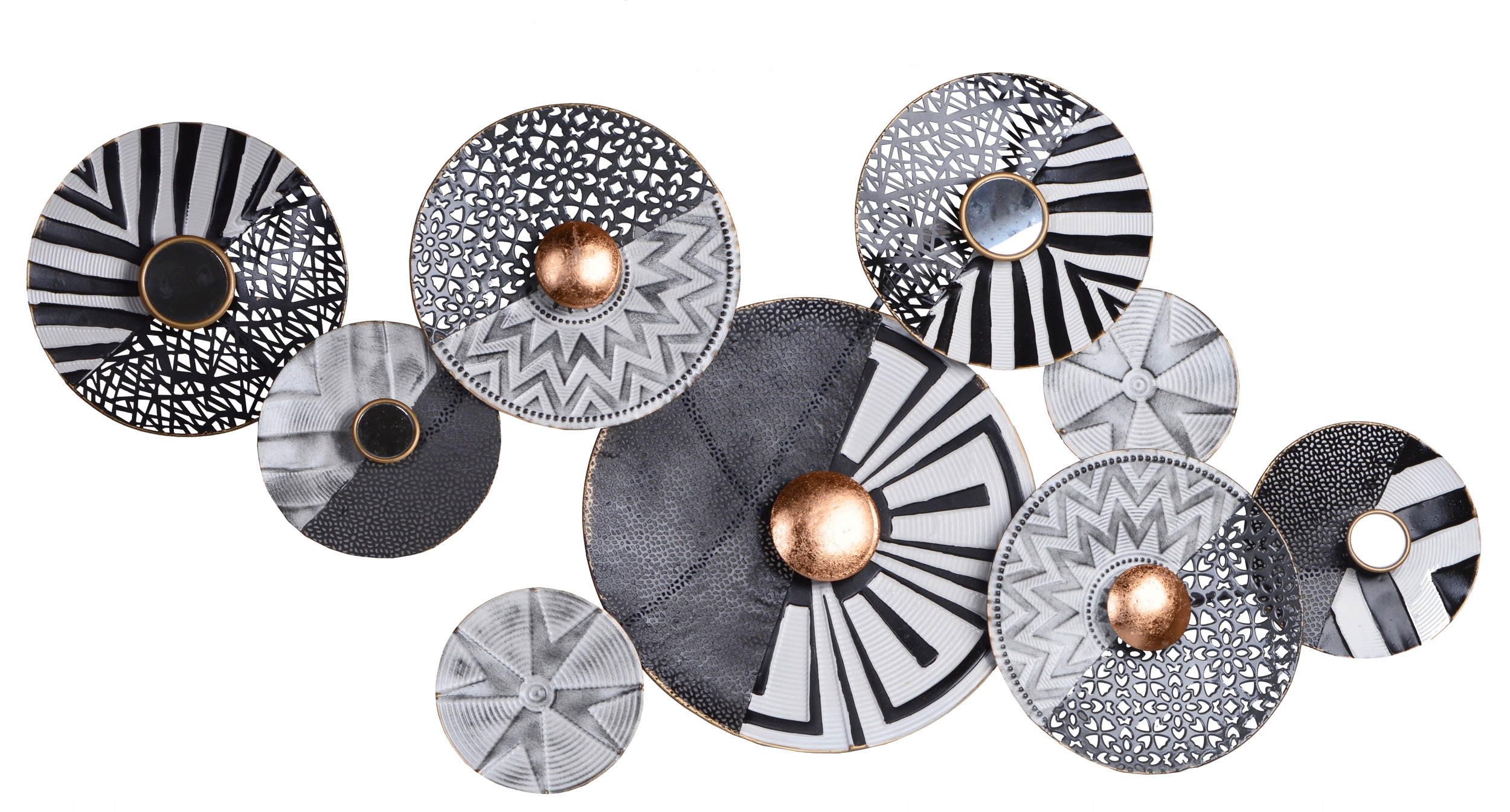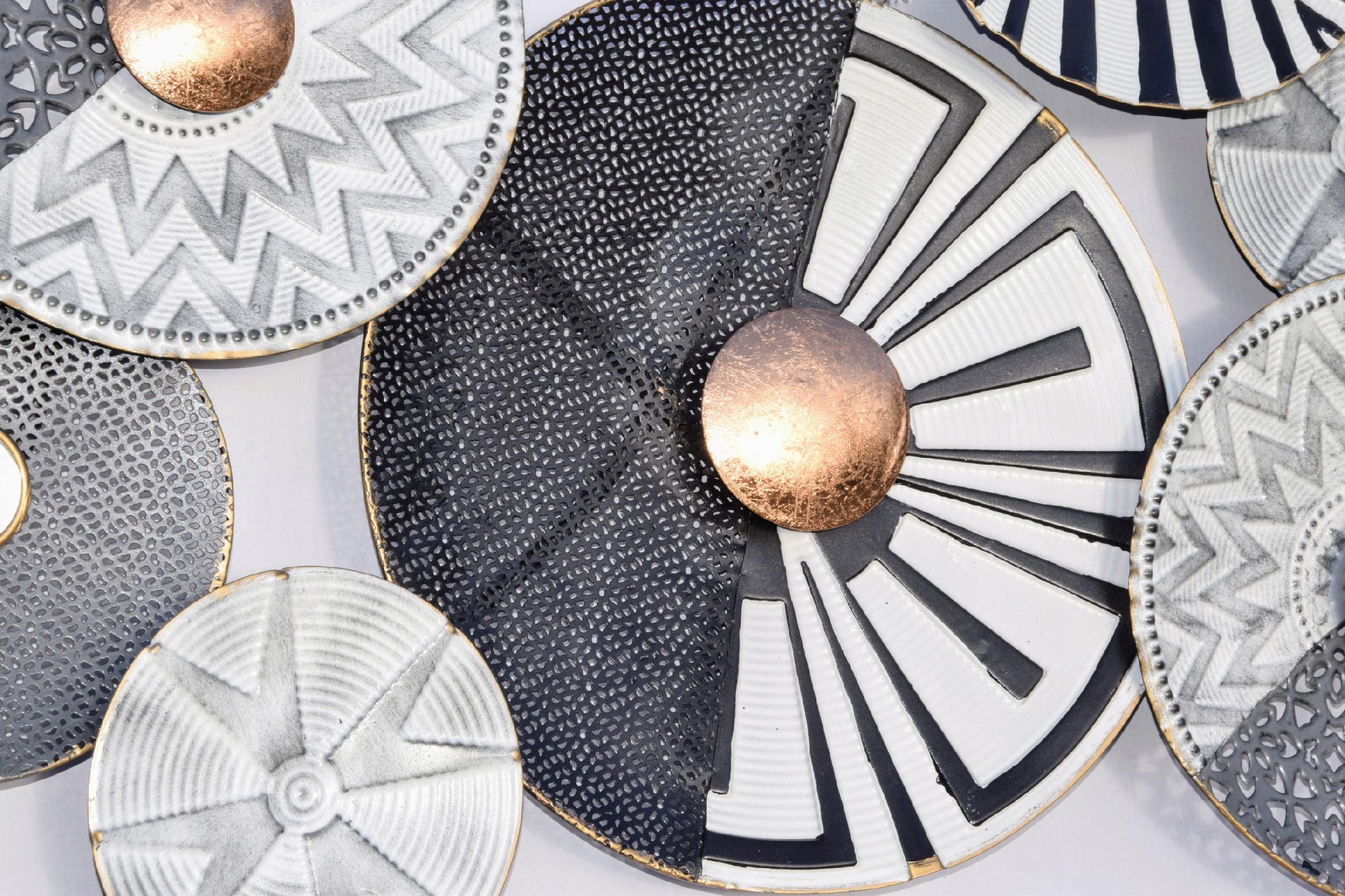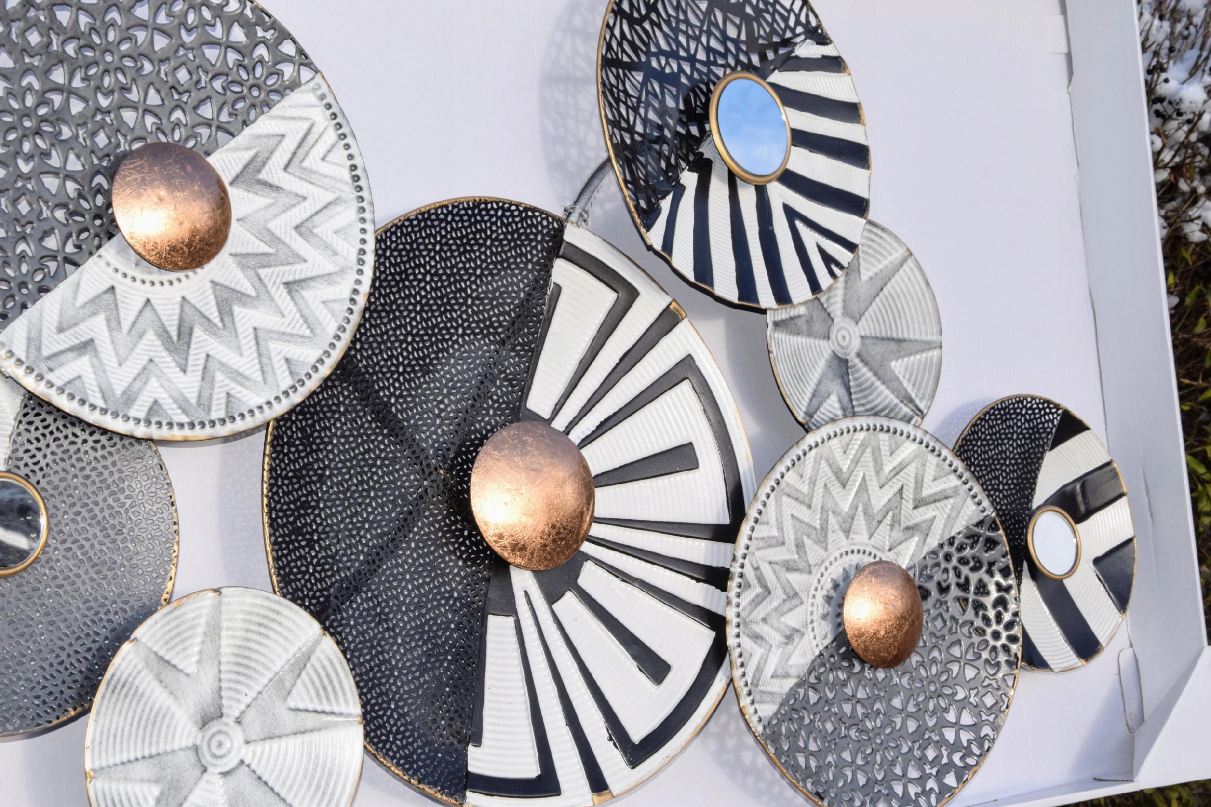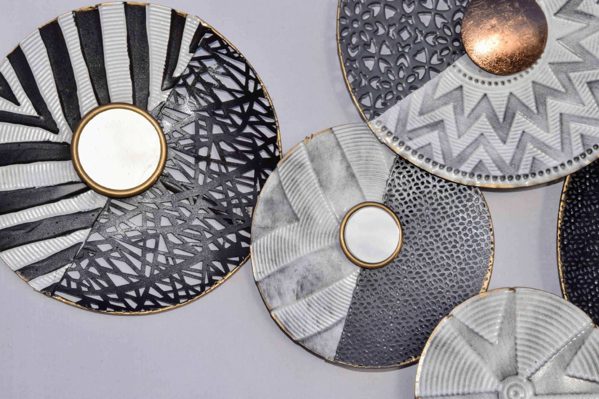 Metalowa dekoracja ścienna koła w kolorze szarości, bieli i czerni.