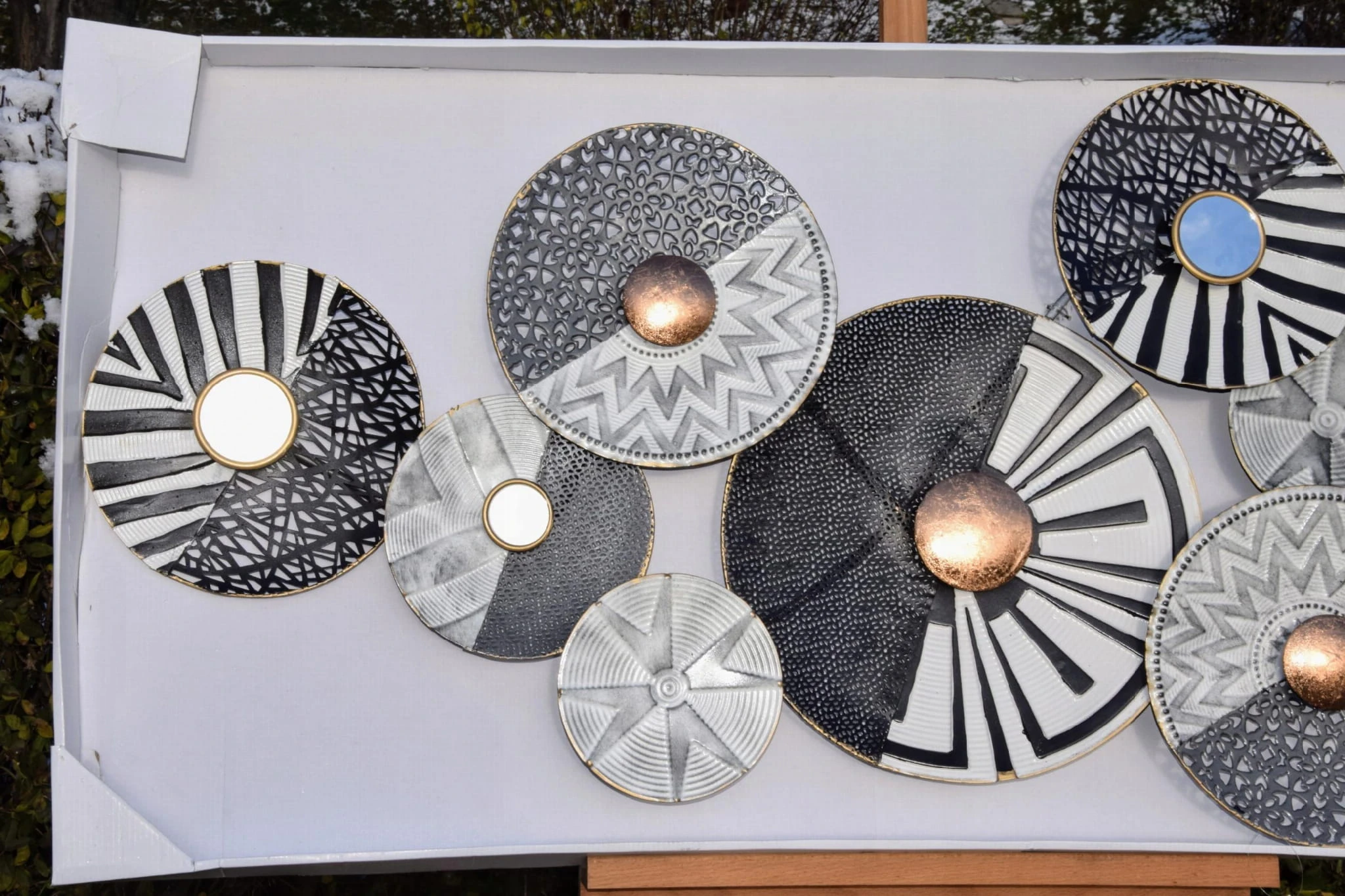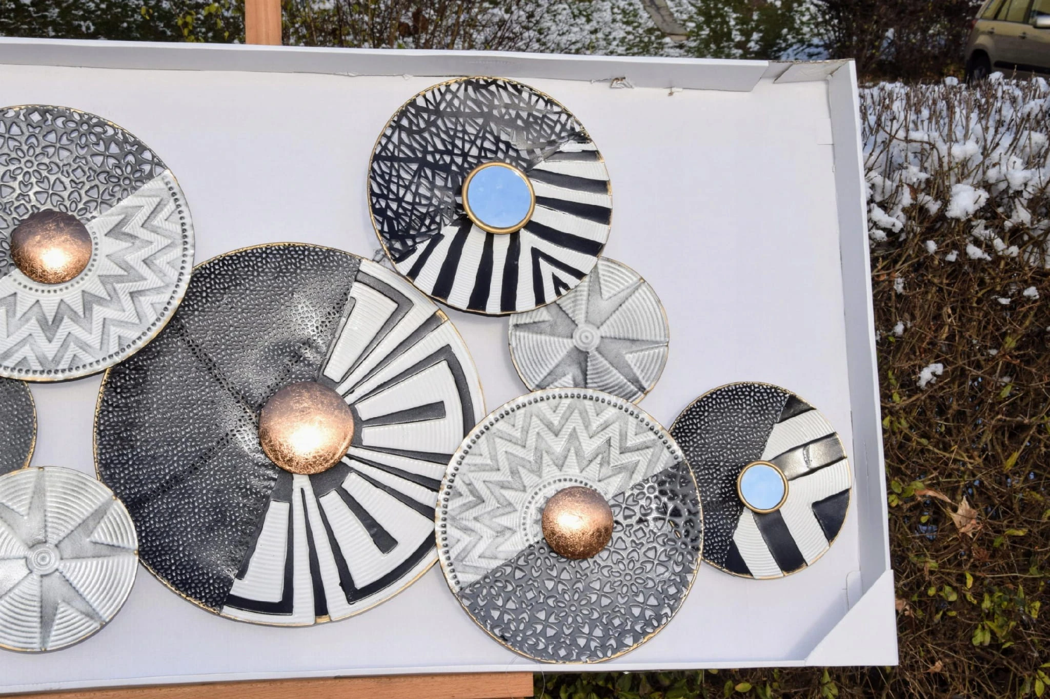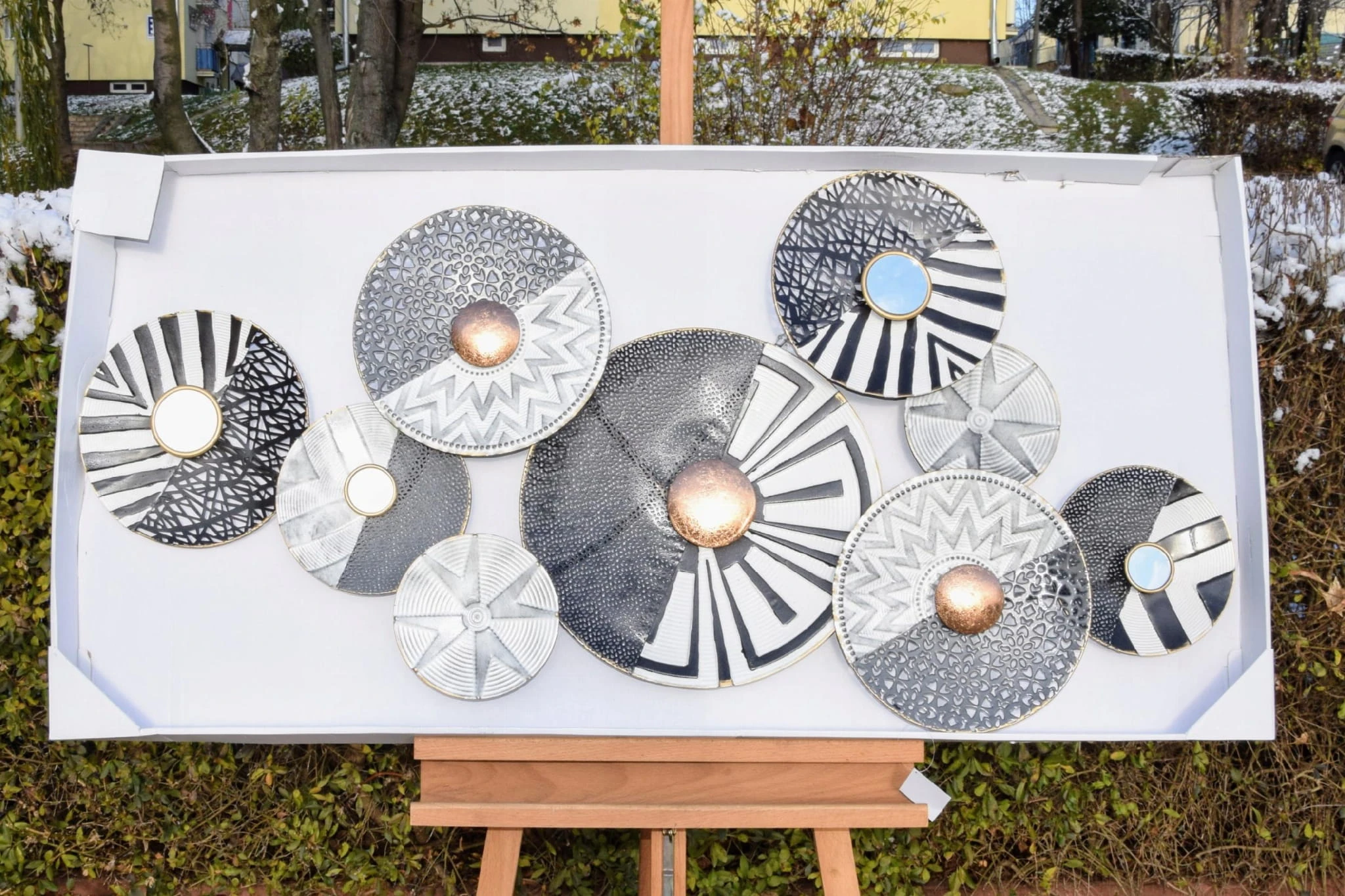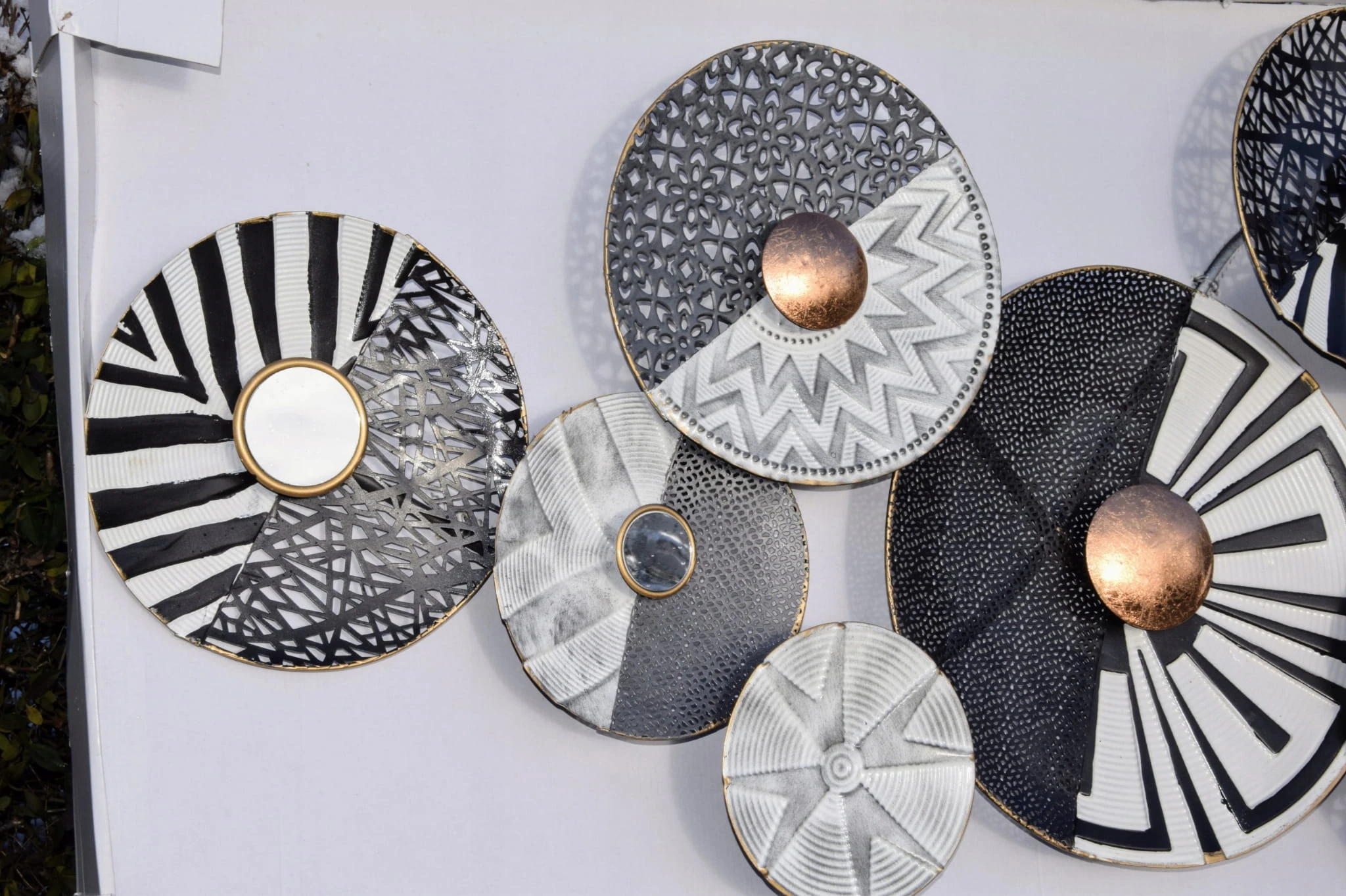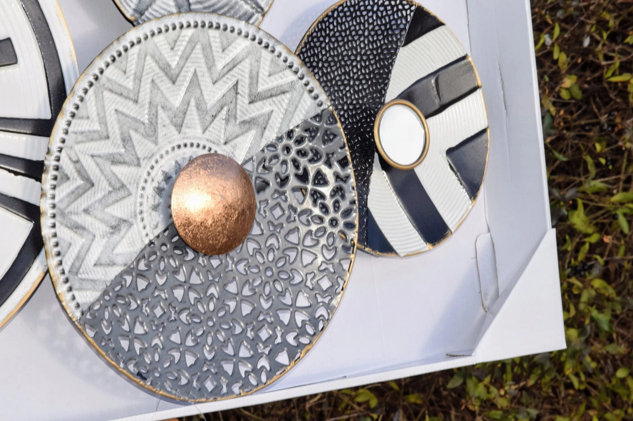 Metalowa dekoracja ścienna koła w kolorze szarości, bieli i czerni.