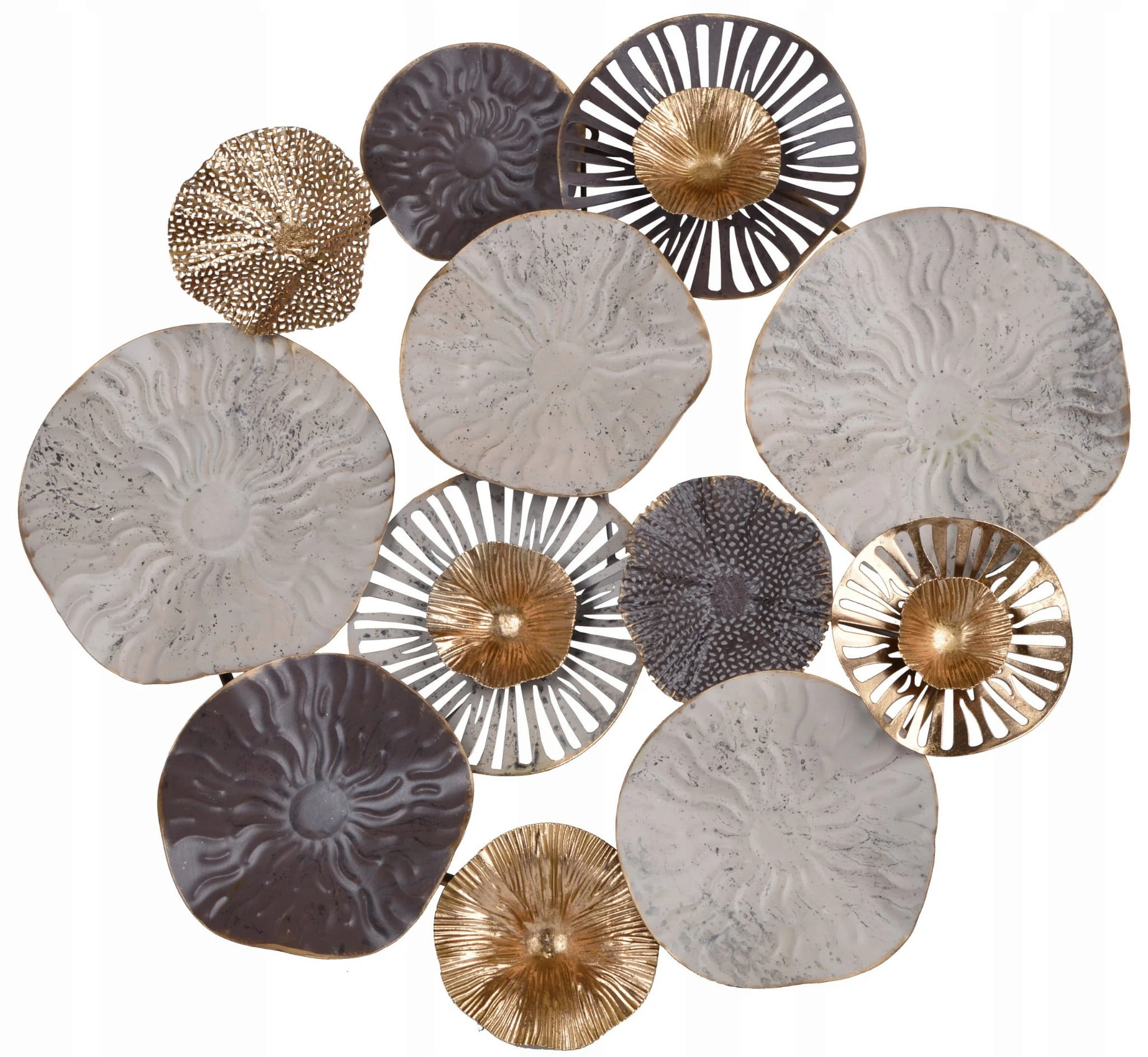 Metalowa dekoracja ścienna kwiaty w kolorze beżu, brązu i złota.