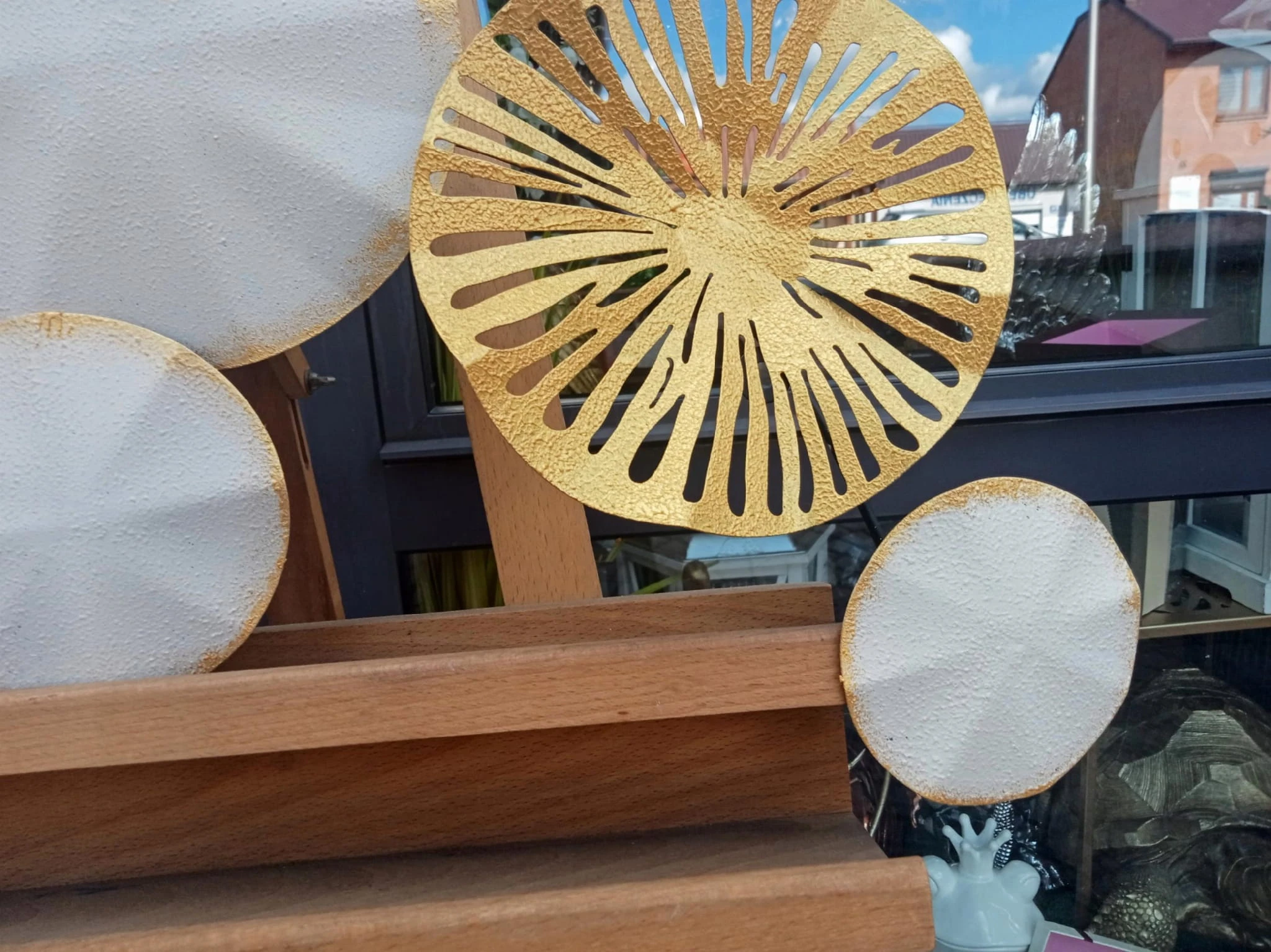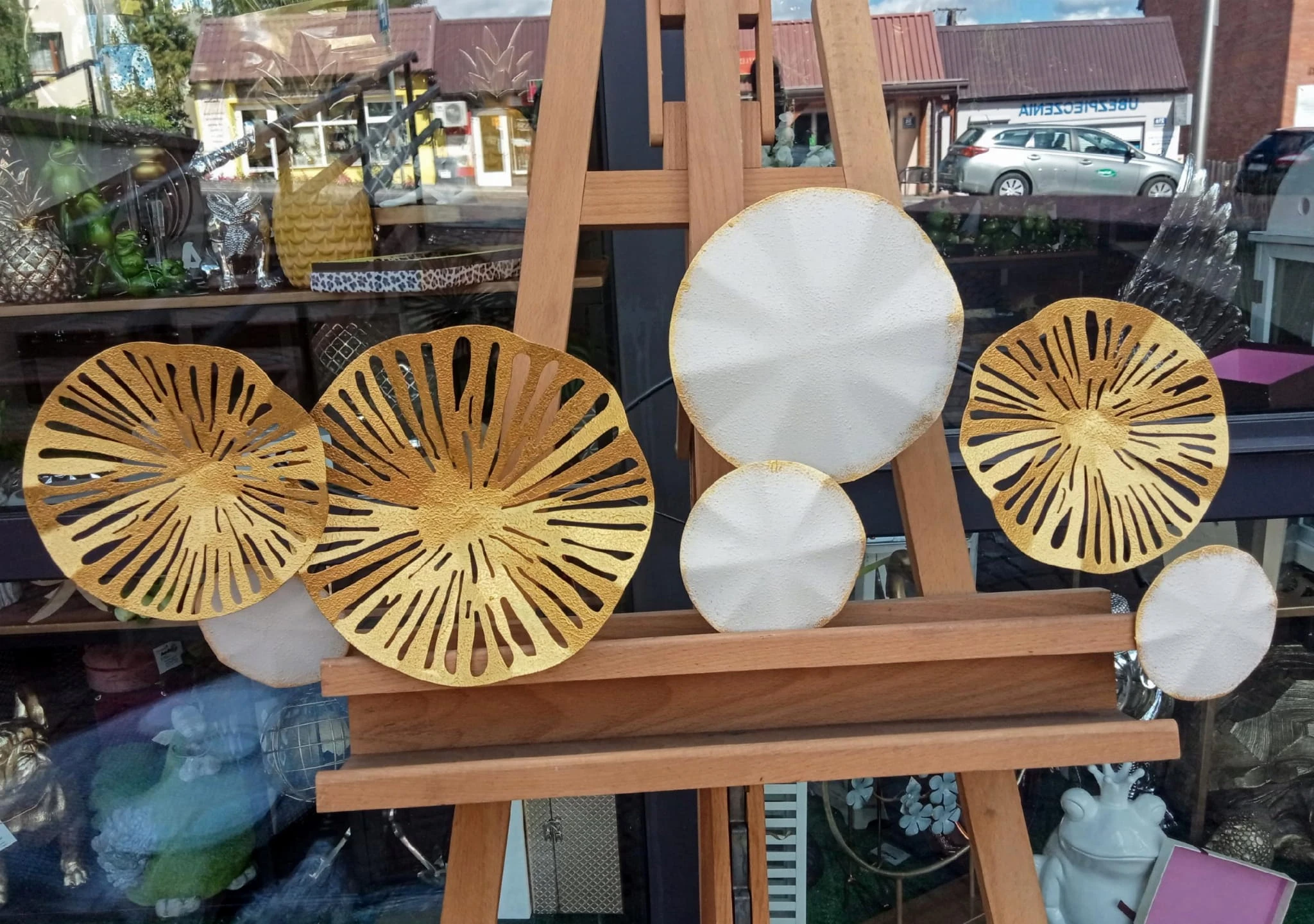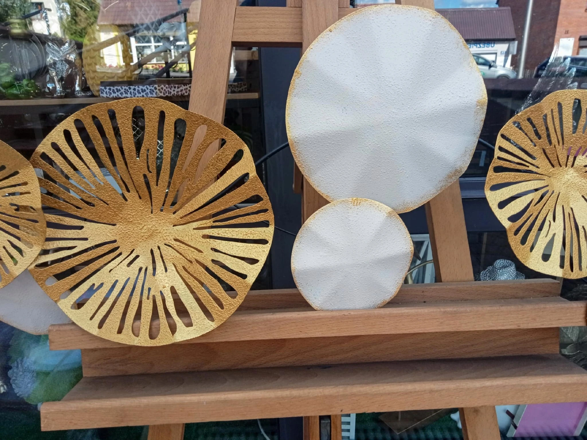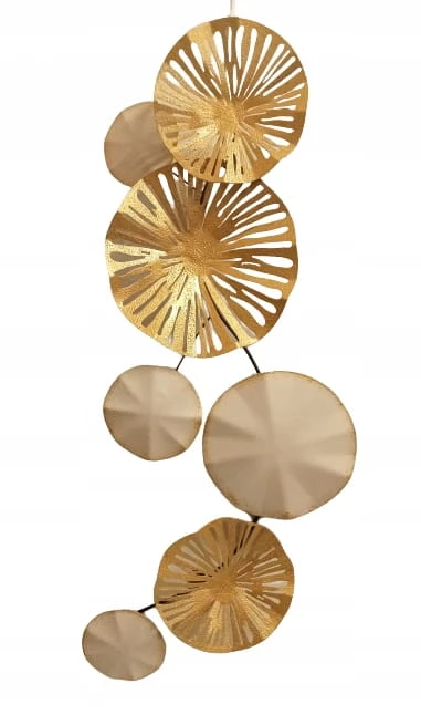 Metalowa dekoracja ścienna w kremowym i złotym kolorze.