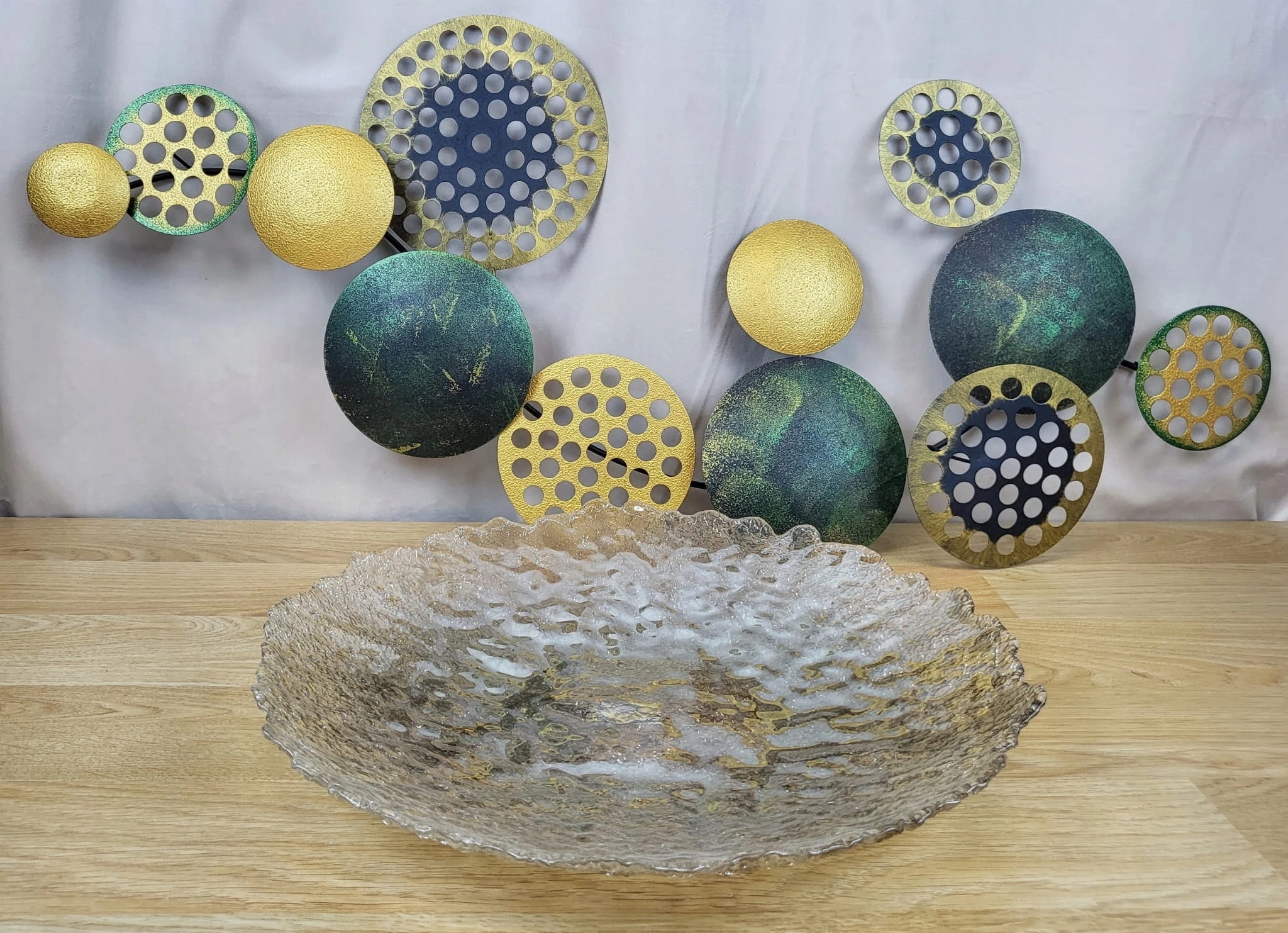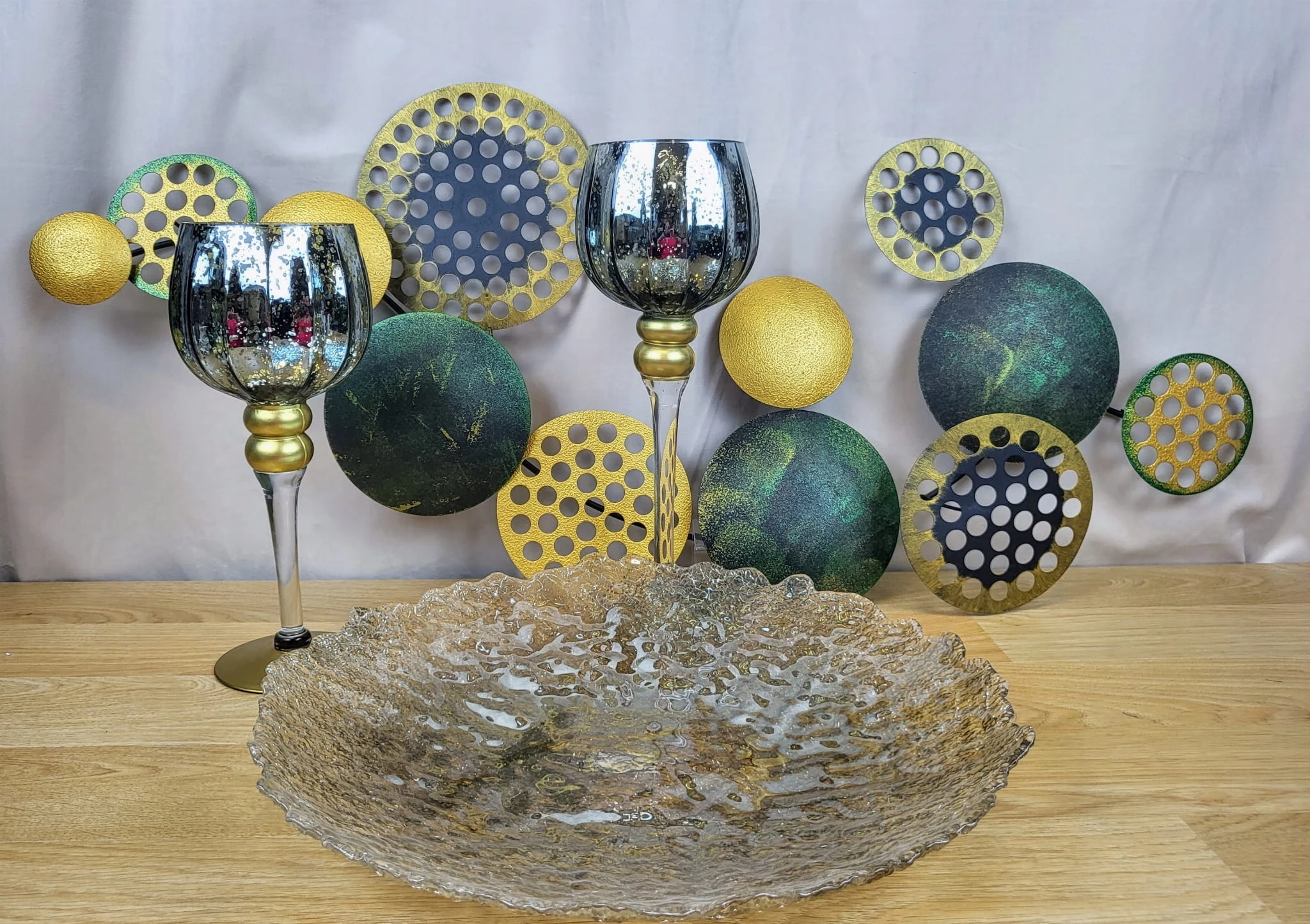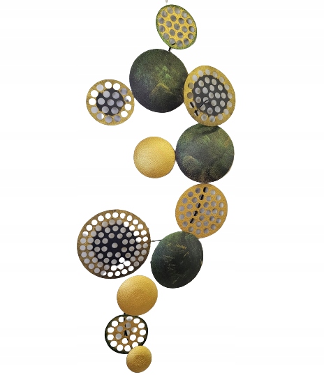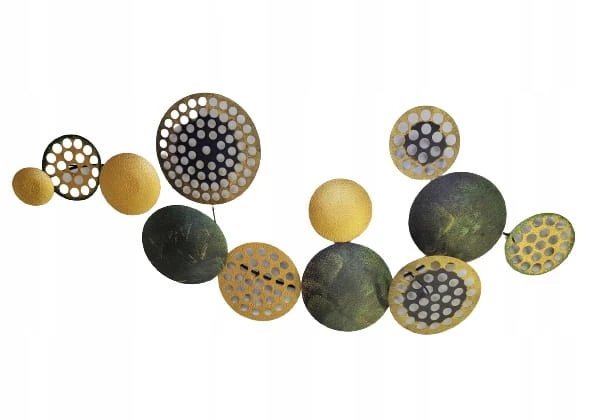 Metalowa dekoracja ścienna w zielonym i złotym.