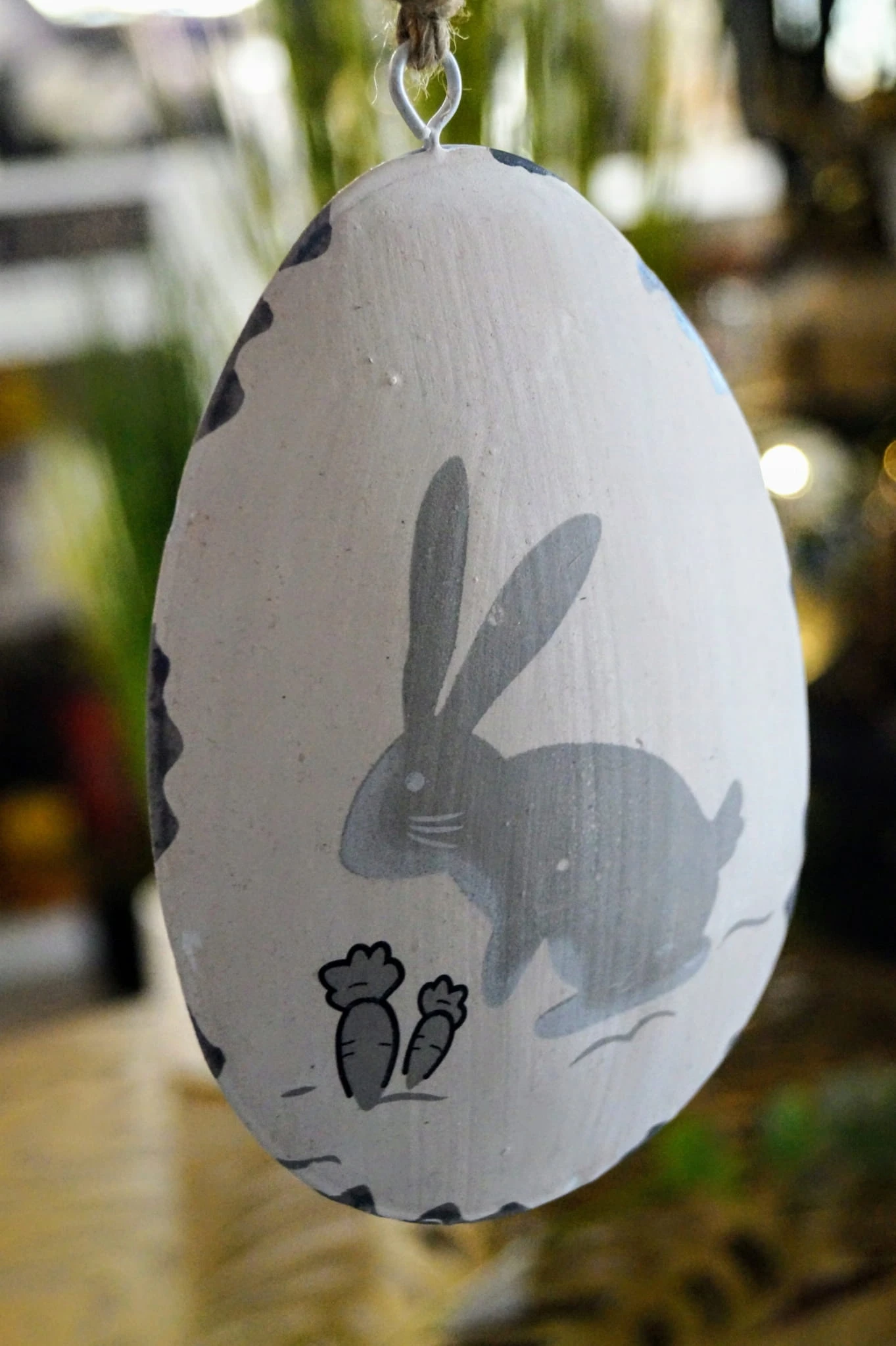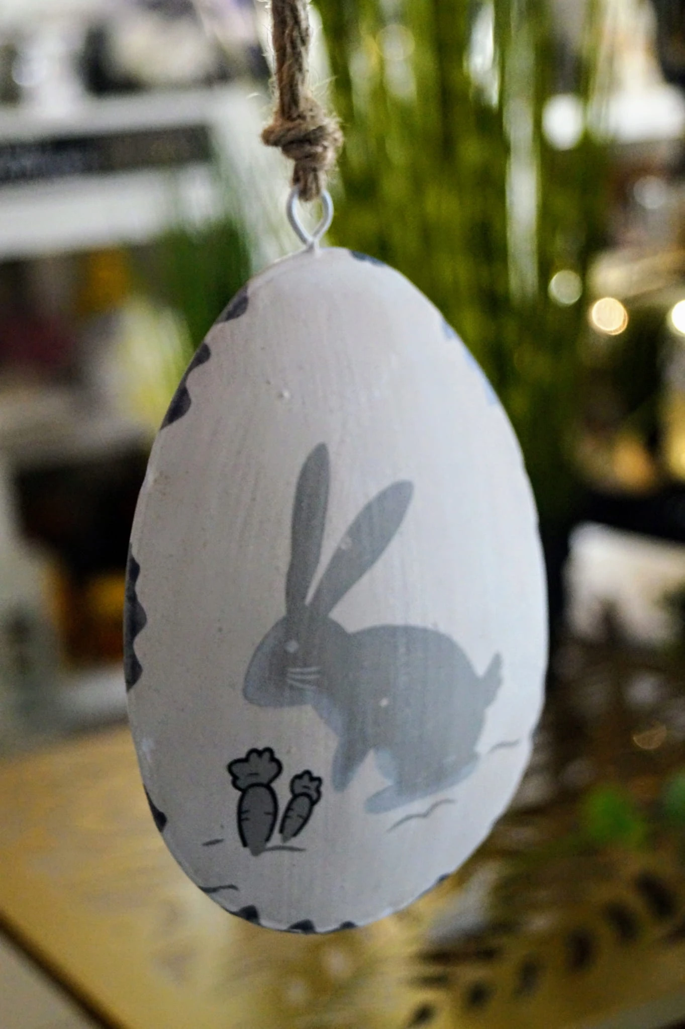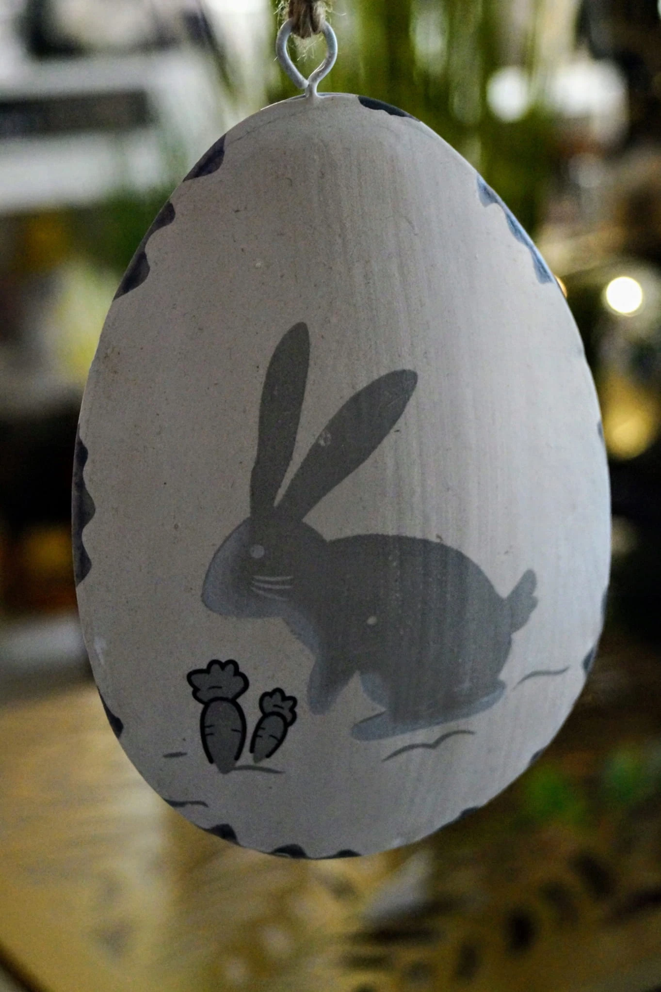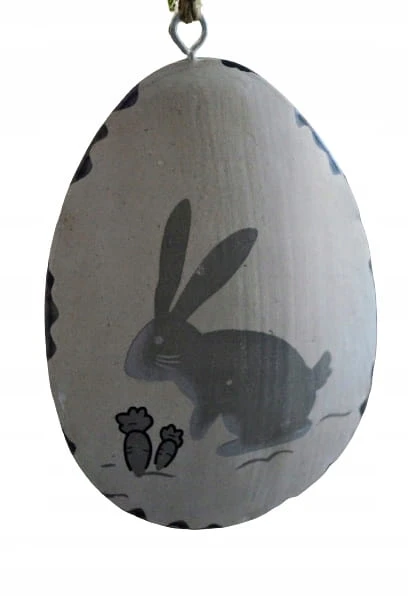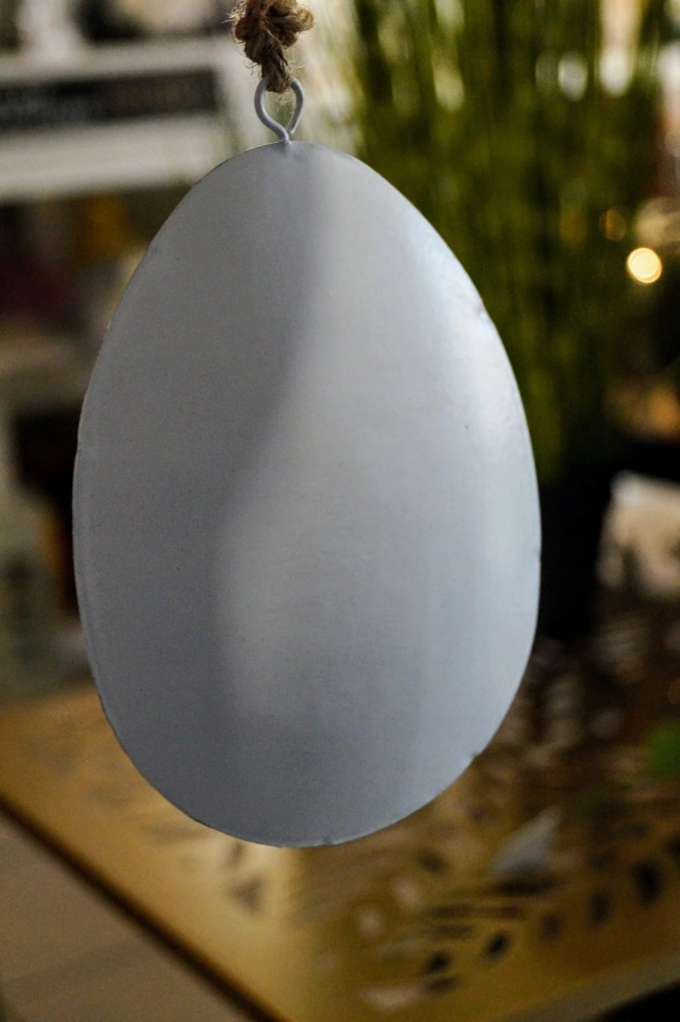 Zawieszka w kształcie jajka, wykonana z metalu, z delikatnym, świątecznym nadrukiem.