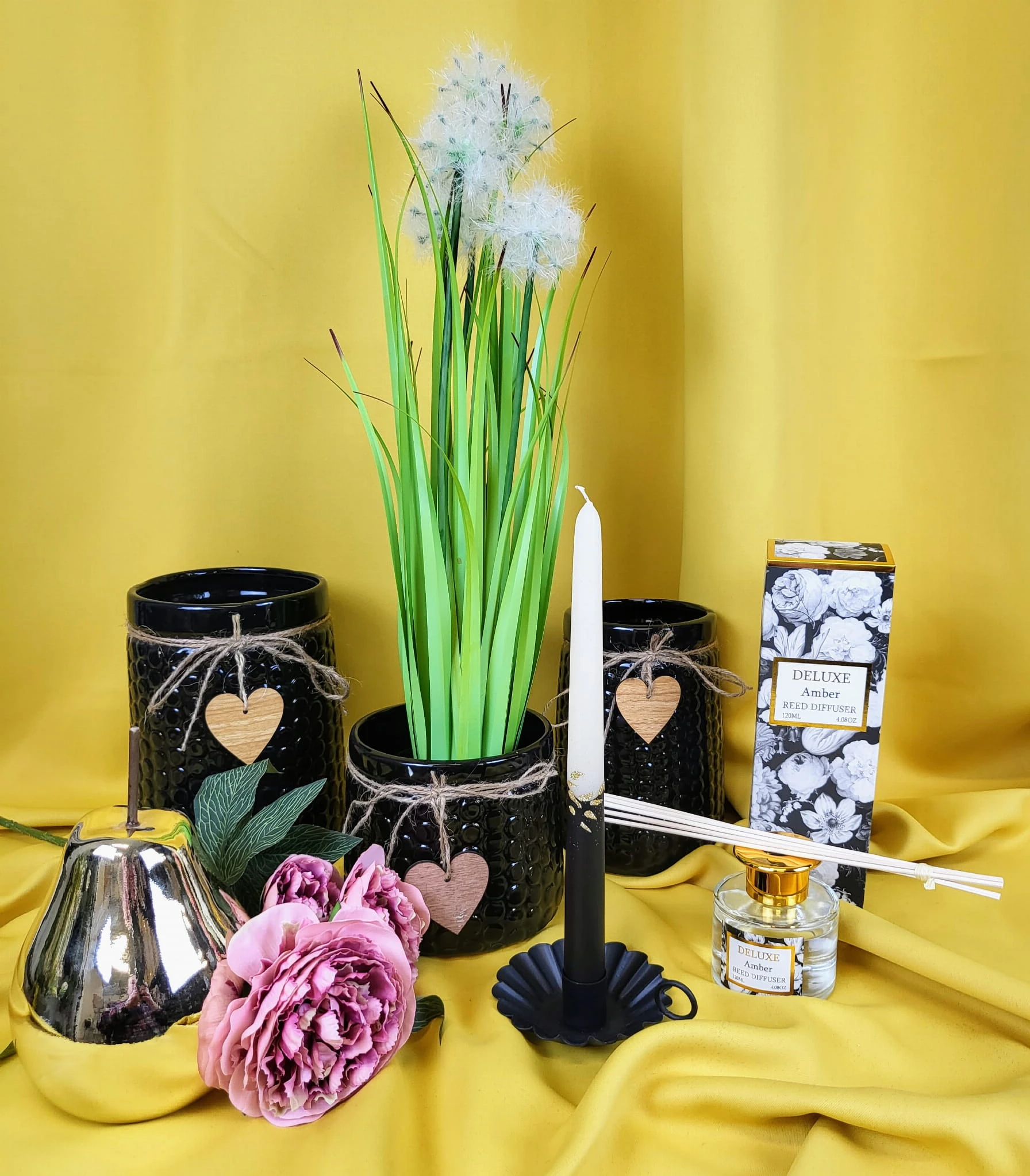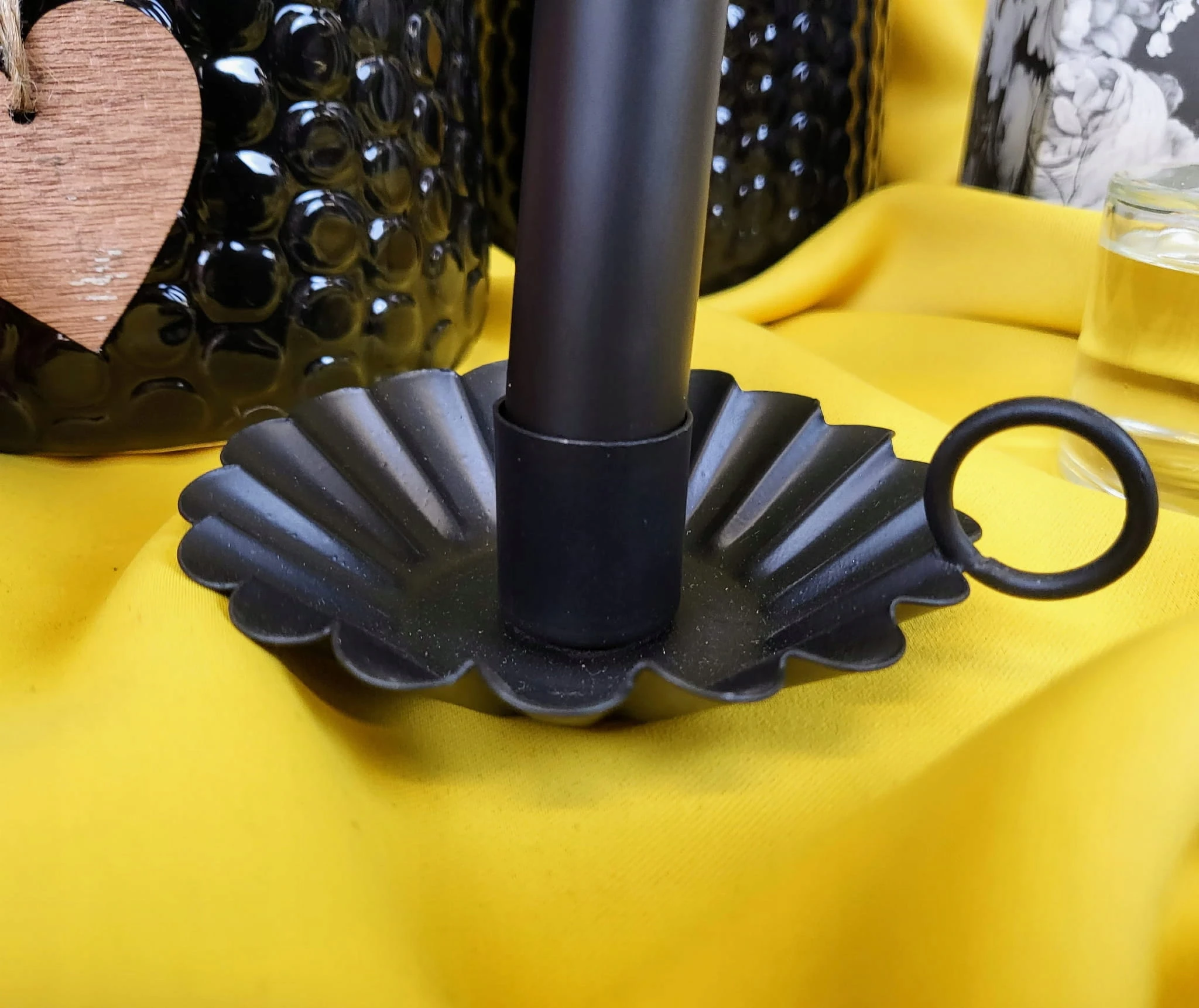 Metalowy świecznik w czarnym kolorze idealnie wpasuje się w każde wnętrze. Oświetlone w ten sposób pomieszczenie staje się niezwykle urokliwe, pełne romantycznego klimatu. Będzie również pięknie komponować się w różnorodnych kompozycjach.