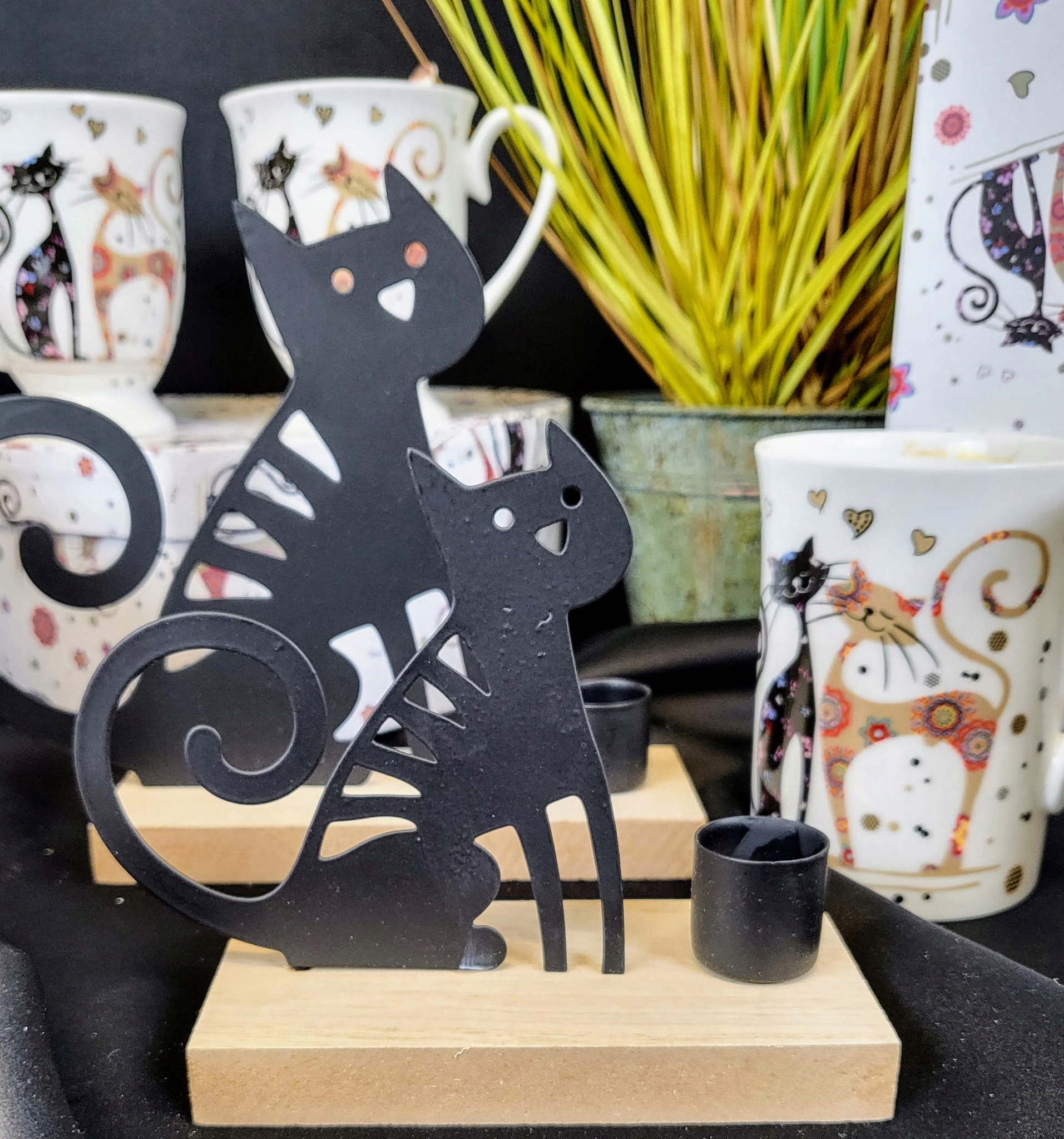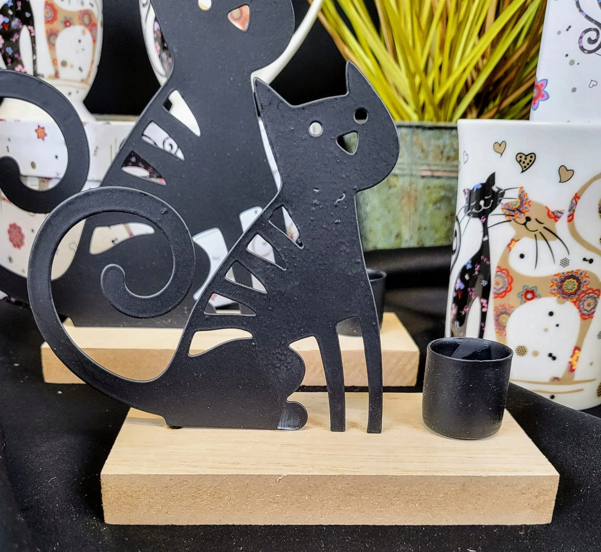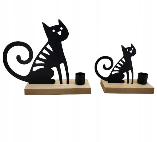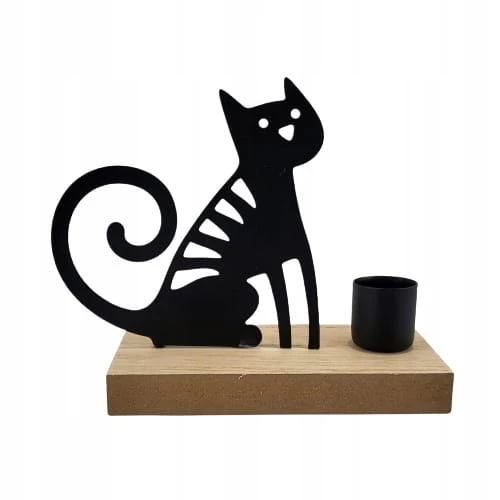 Metalowy świecznik z sympatycznym kotem. Idealnie wkomponuje się w różne wnętrza, można również udekorować nim balkon czy taras.