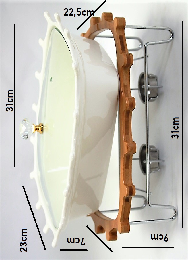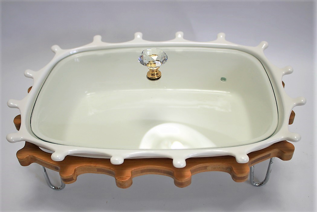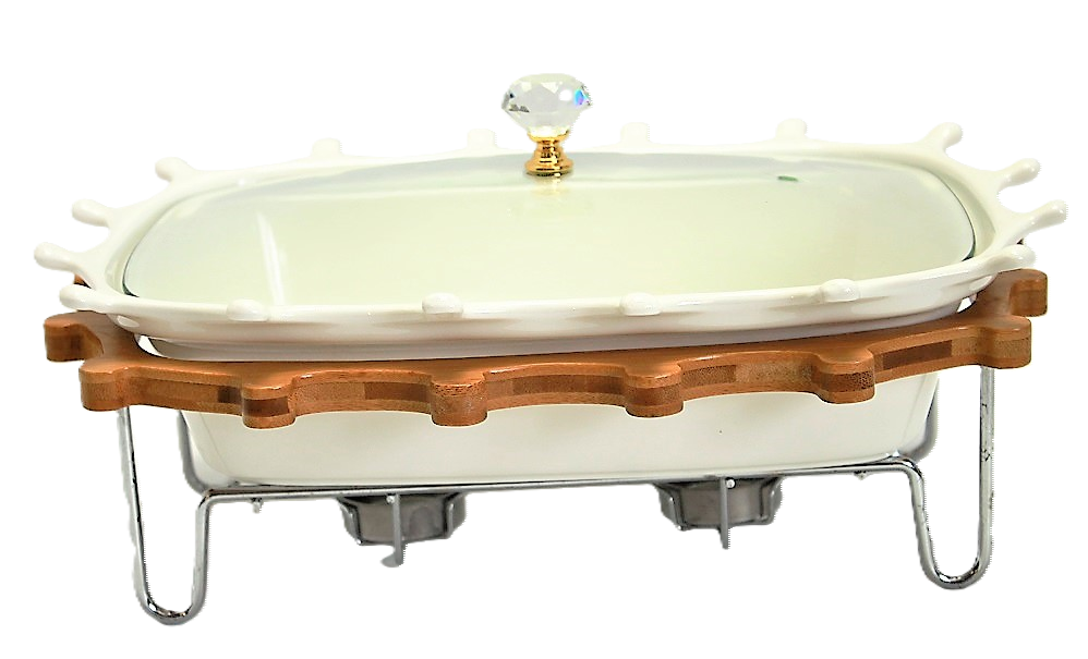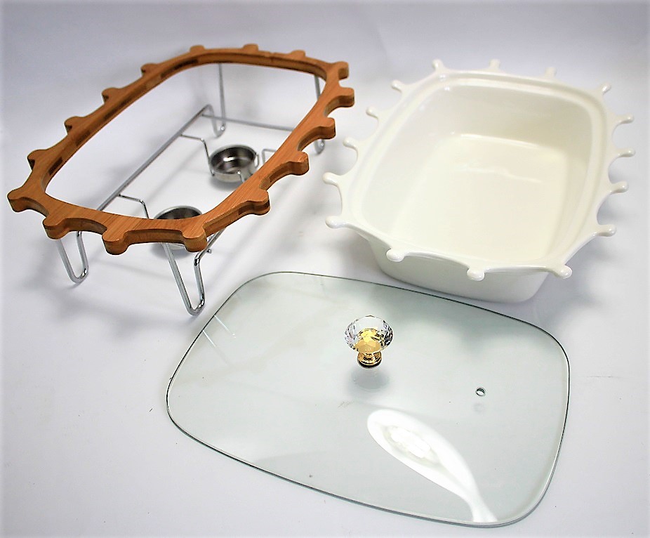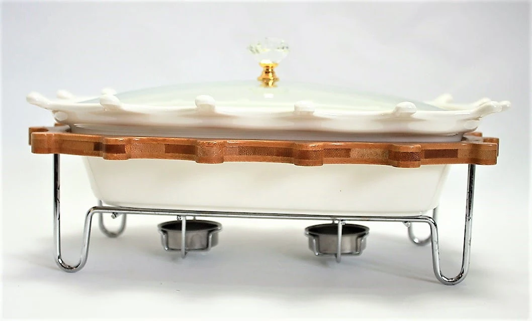 Elegancki zestaw w skład, którego wchodzi ceramiczny półmisek żaroodporny, pokrywka szklana oraz stojak ze stali nierdzewnej i drewna. Bardzo praktyczny na przyjęcie lub spotkanie rodzinne, gdyż dzięki stelażowi na świeczki utrzymuję ciepło naszych potraw. Zarówno ceramika jak i doskonałej jakości stal nierdzewna to materiały bardzo higieniczne. łatwo utrzymać je w czystości.