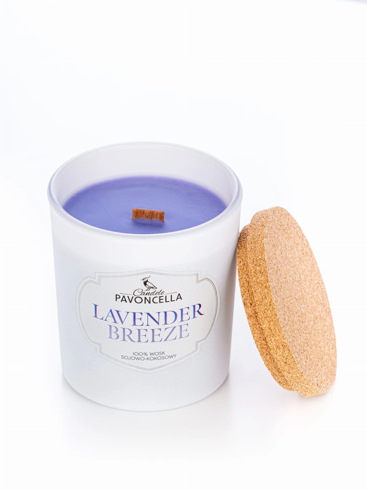 Świeca z wosku sojowo-kokosowego z drewnianym knotem o zapachu Lavender Breeze.