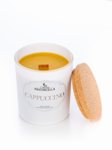 Świeca z wosku sojowo-kokosowego z drewnianym knotem o zapachu Cappuccino.