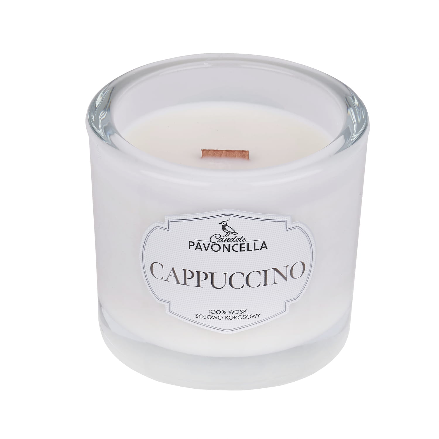 Świeca z wosku sojowo-kokosowego z drewnianym knotem o zapachu Cappuccino.