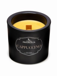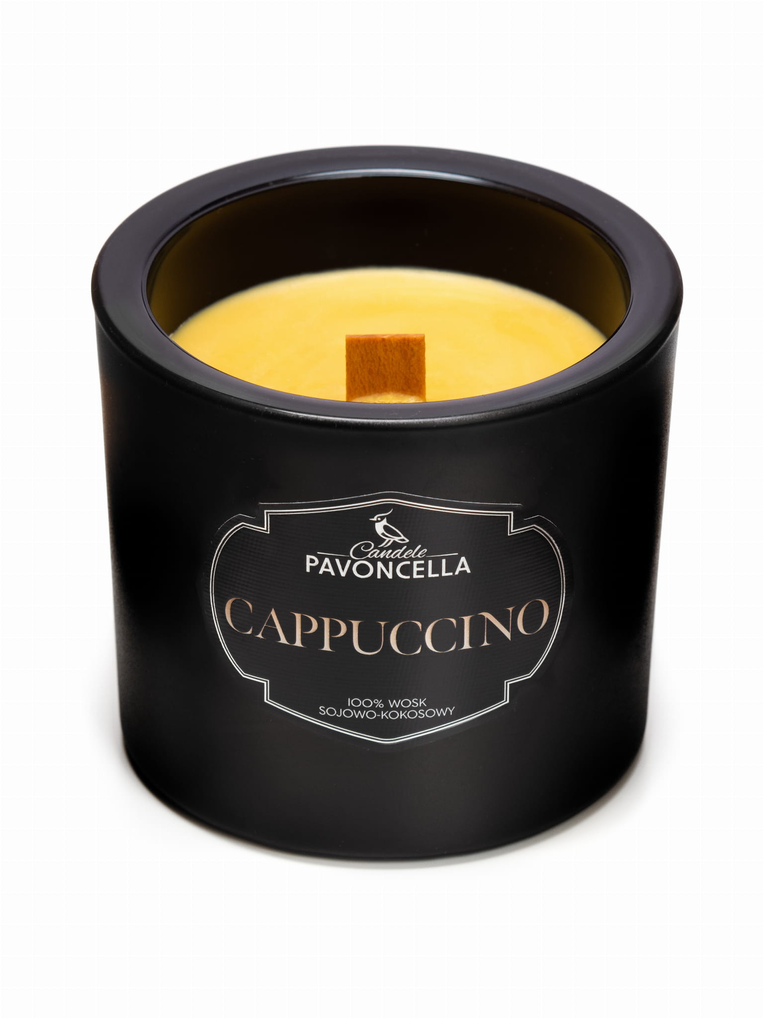 Świeca z wosku sojowo-kokosowego z drewnianym knotem o zapachu Cappuccino.