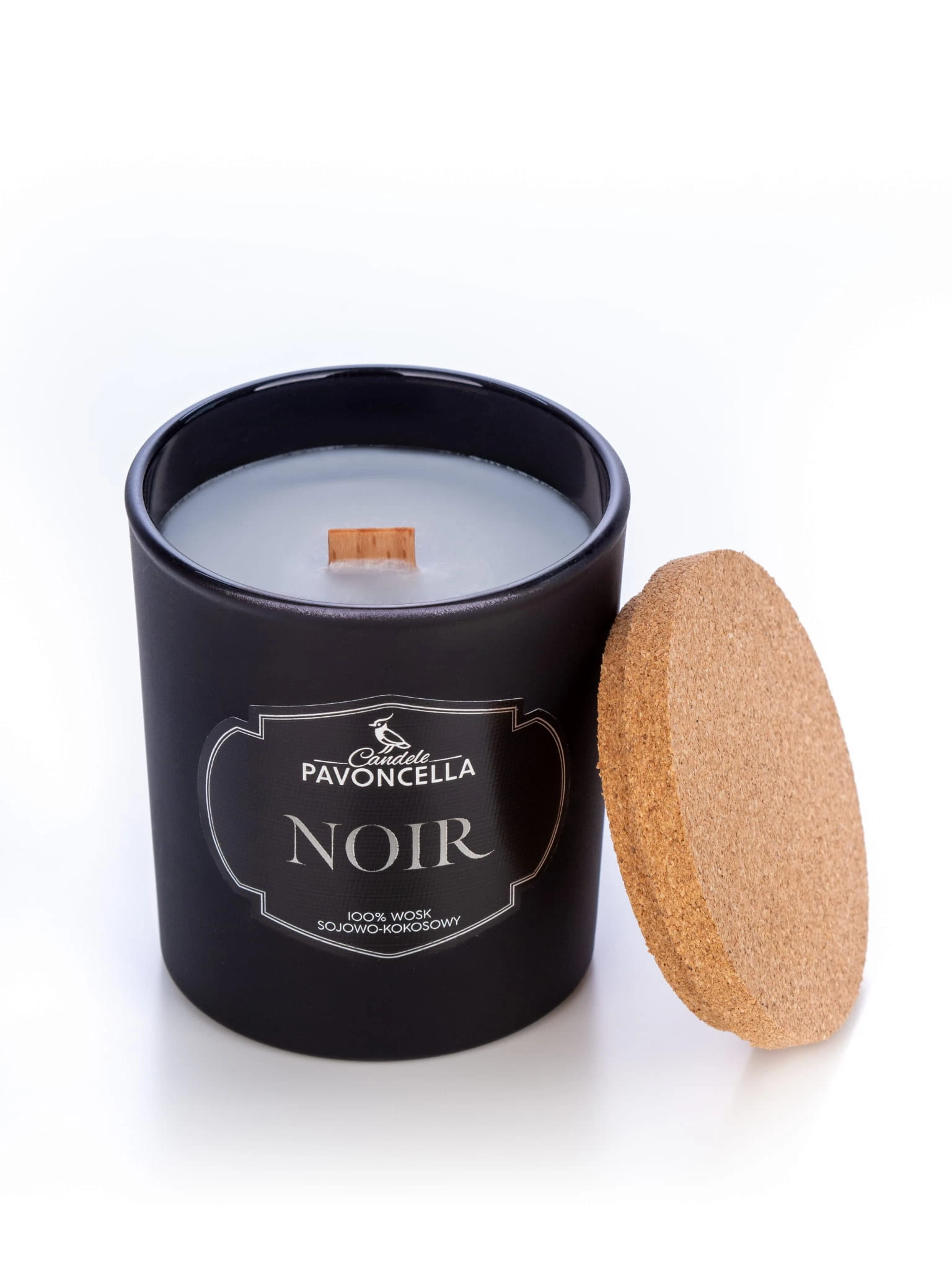 Świeca z wosku sojowo-kokosowego z drewnianym knotem o zapachu Noir.