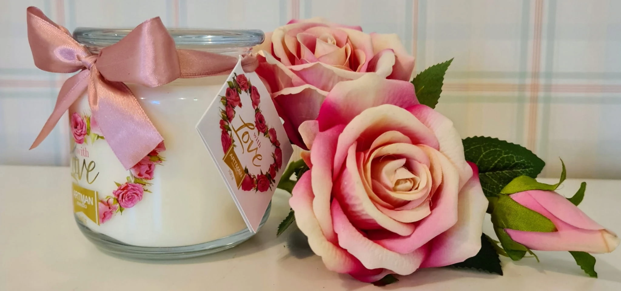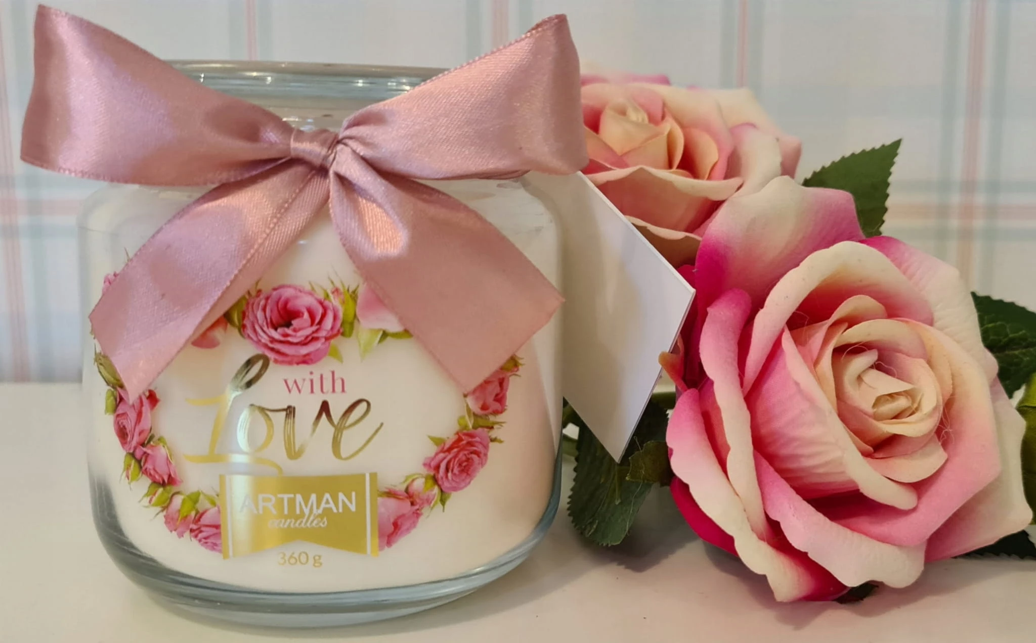 Ozdobna, aromatyczna świeczka w kolorze BIAŁYM z różową wstążką.