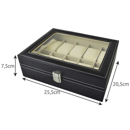 - SPECYFIKACJA - materiał: pokrycie zewnętrze: poliuretan + szkło, konstrukcja: płyta pilśniowa średniej gęstości, pozostałe: nylon, włóknina, flanela, polipropylen, pianka, papier, karton, metalowe elementy; ilość przegródek: 10, kolor: czarny, wymiary: 20,5x25,5x7,5cm; wymiary przegródki (dł. x szer.): 9 x 4,5 cm; waga: 0,724kg; waga w opakowaniu:1,3kg