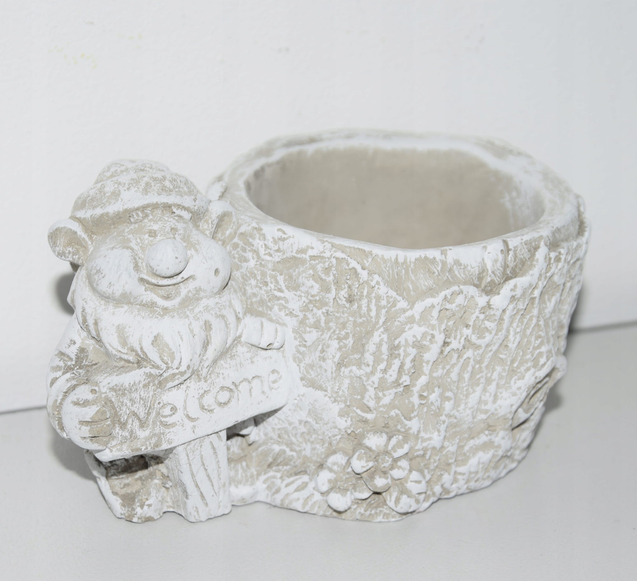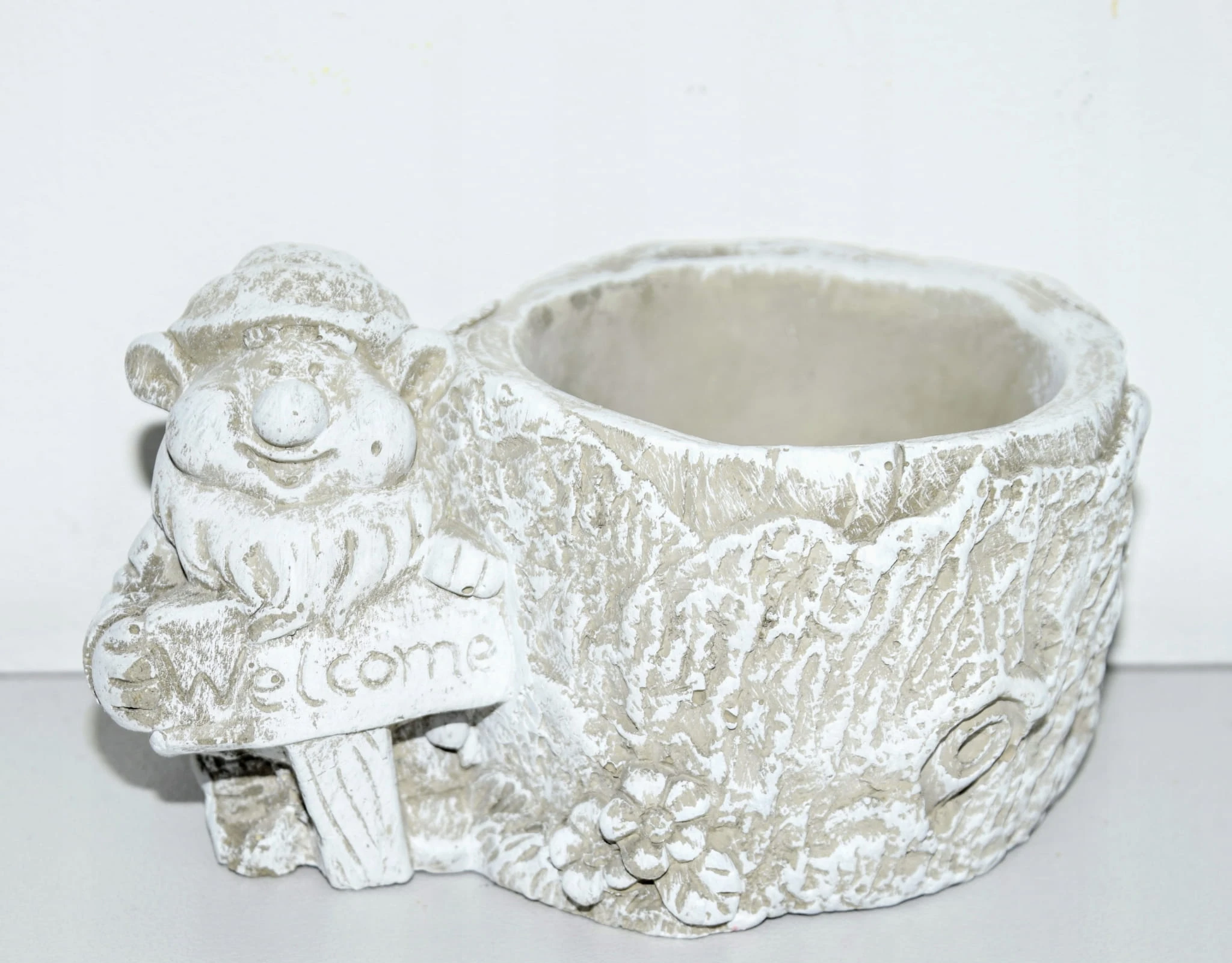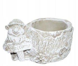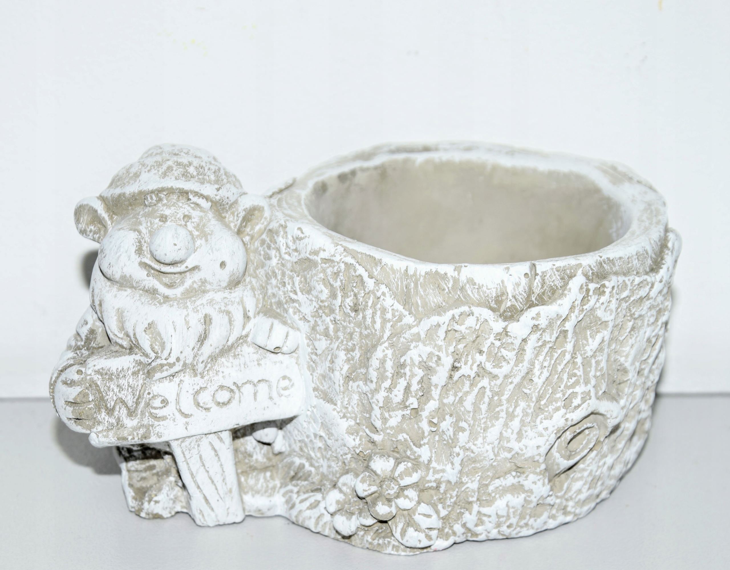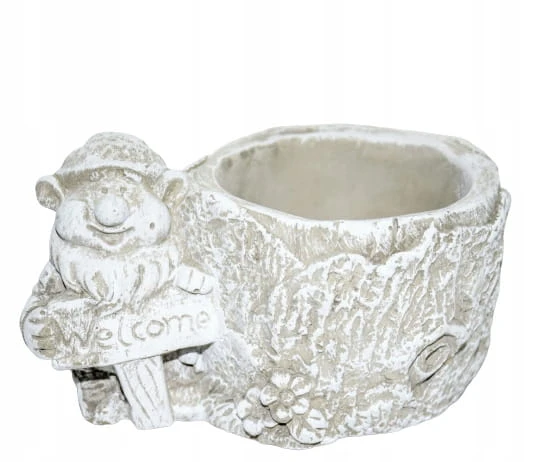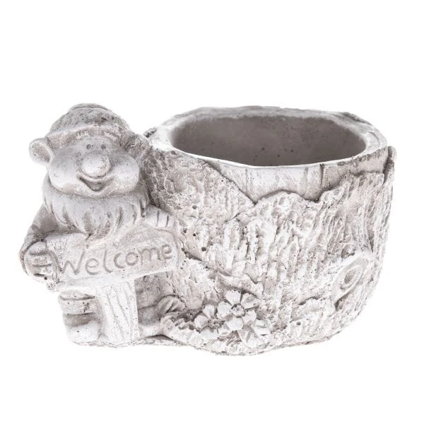 CIĘŻKA OSŁONKA BETONOWA Z KRASNALEM TRZYMAJĄCYM NAPIS "WELCOME"