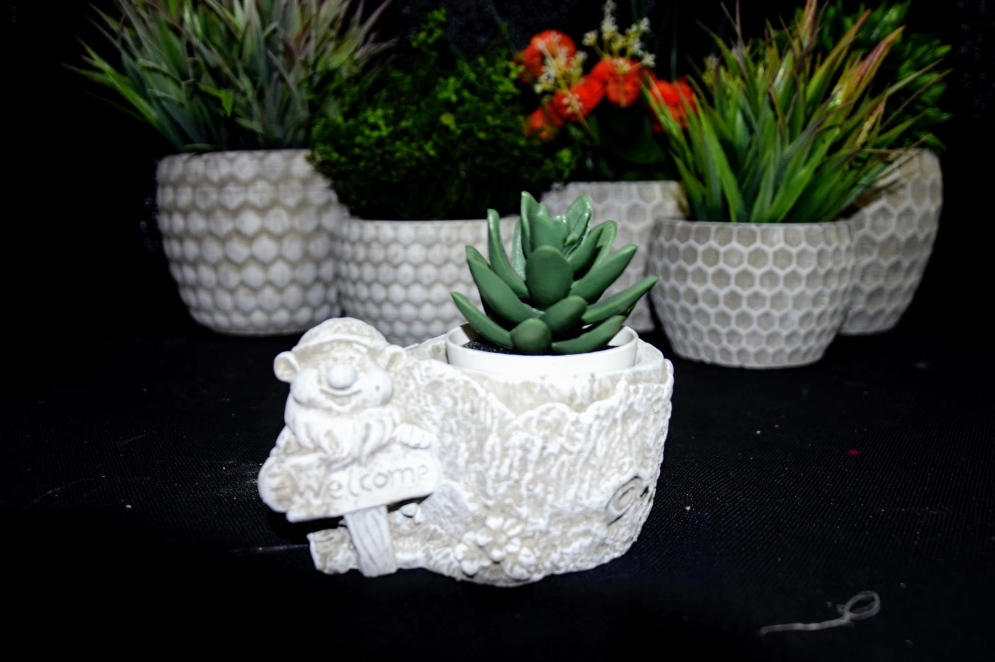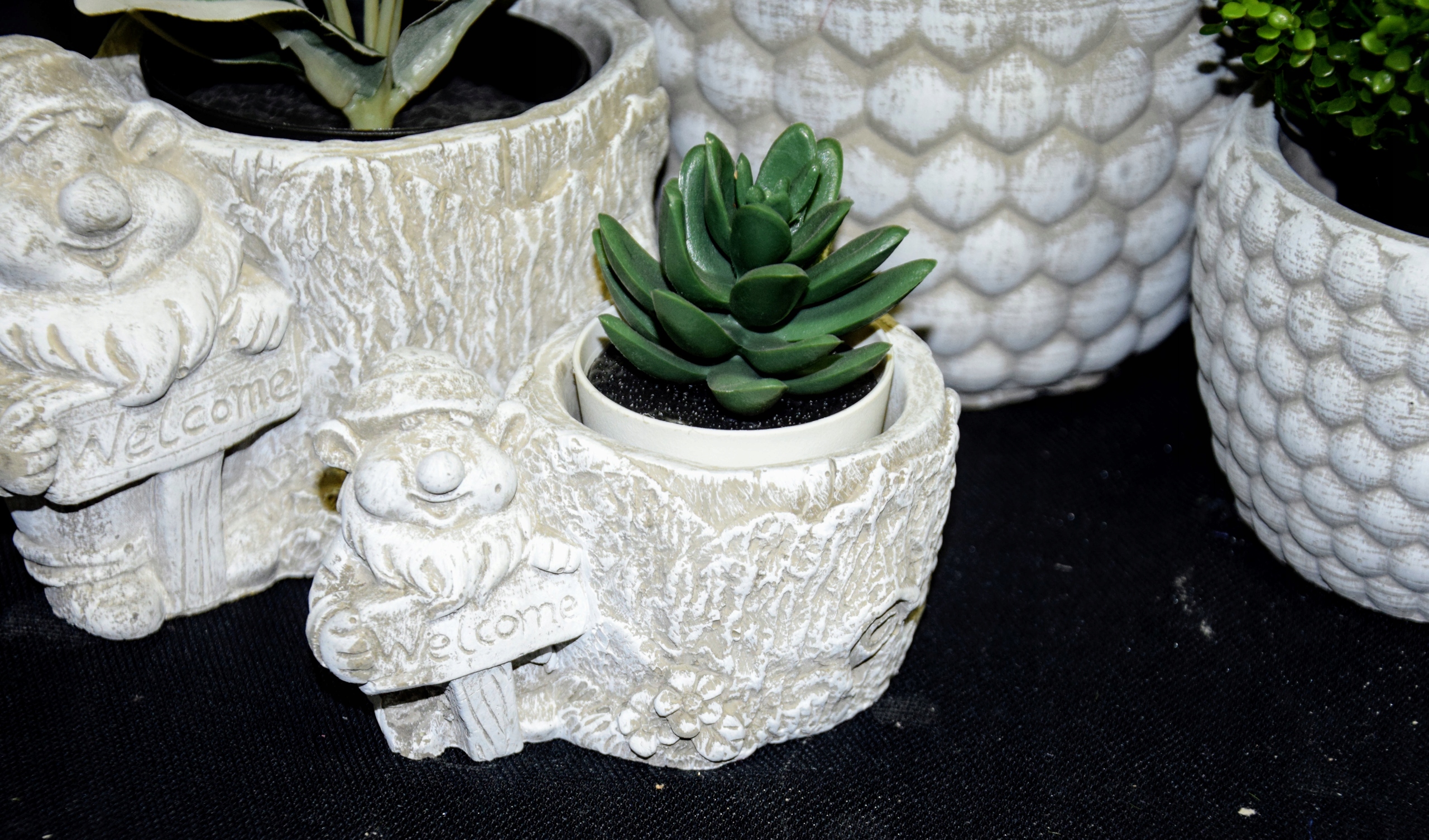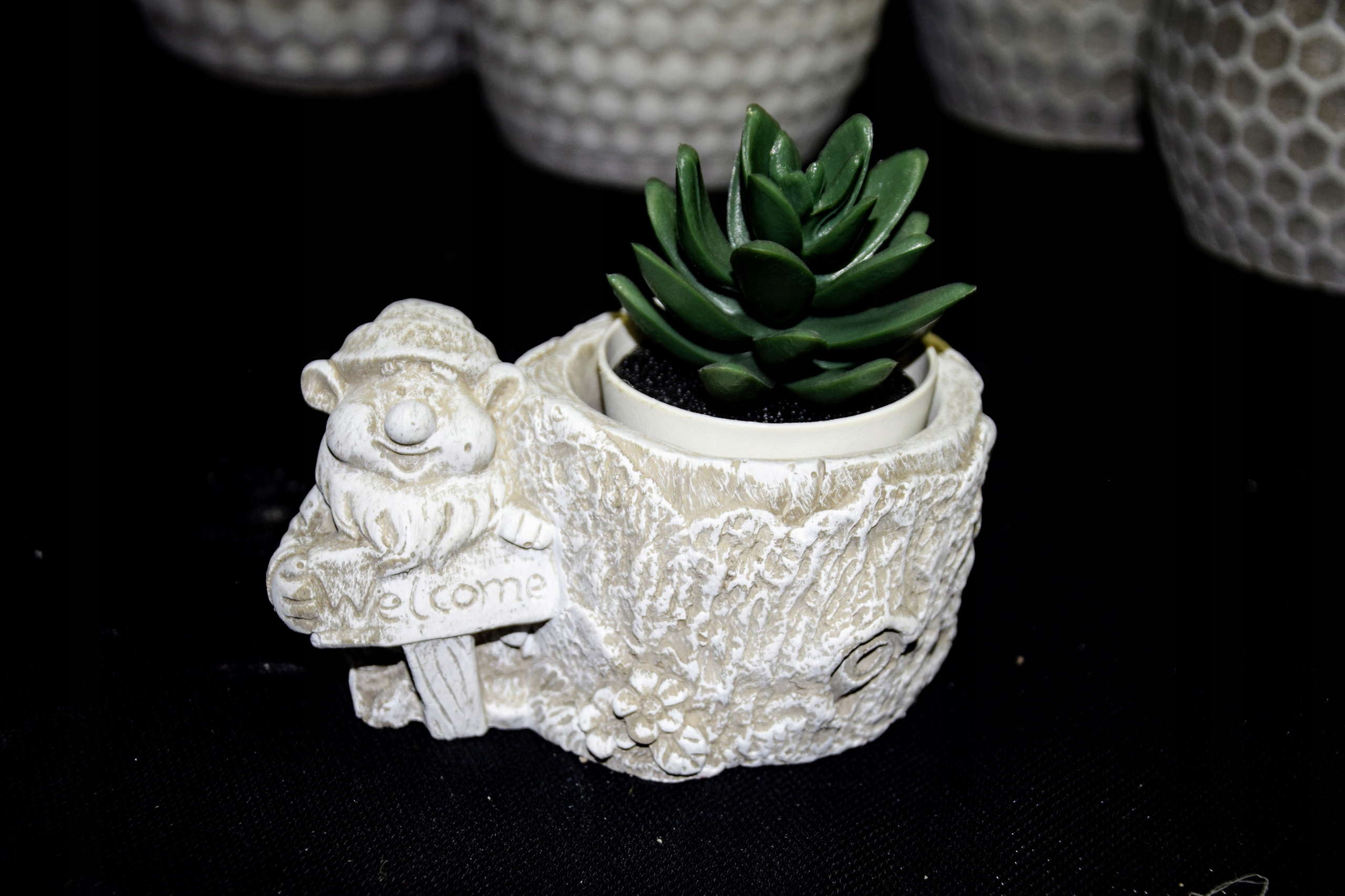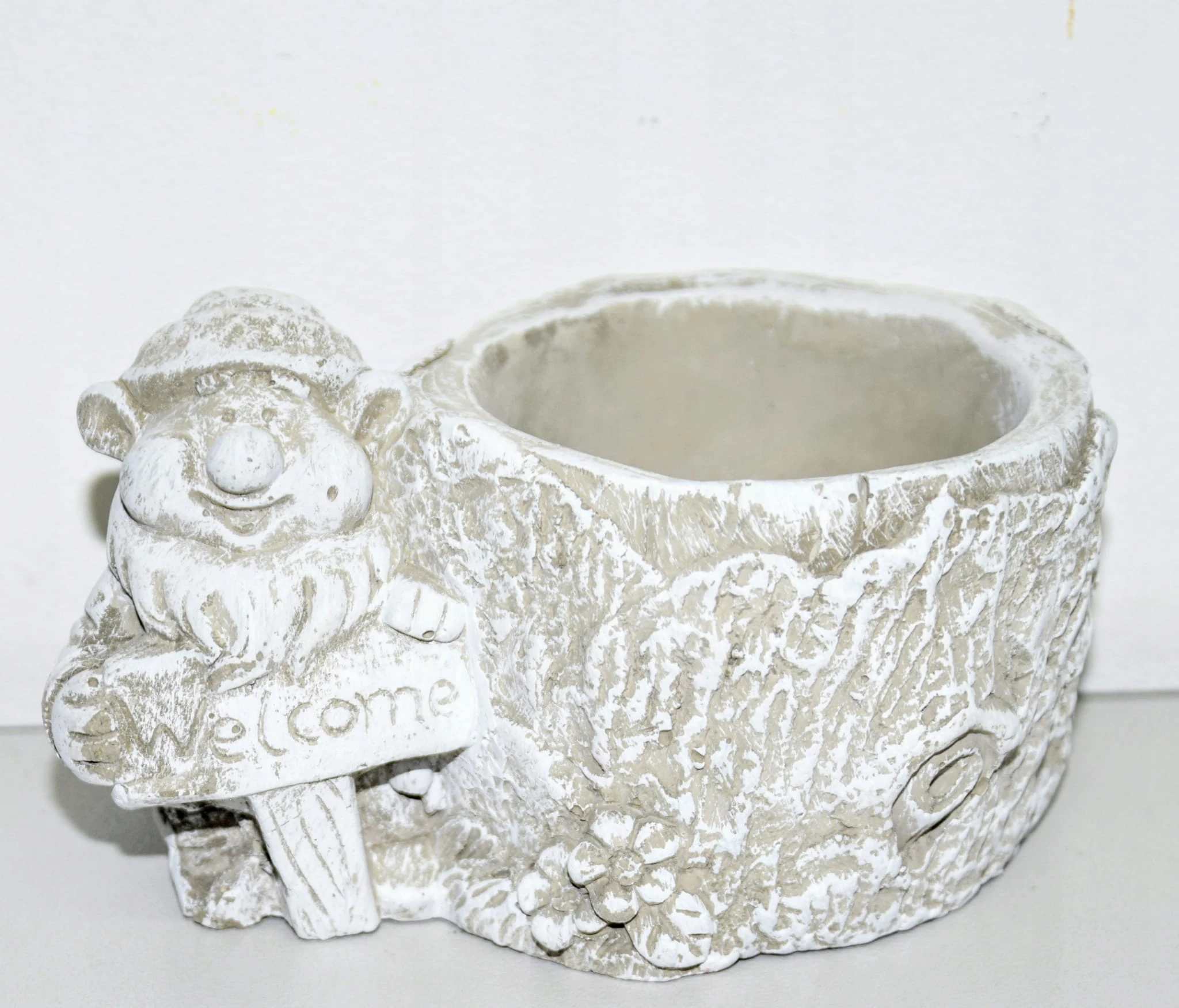 CIĘŻKA OSŁONKA BETONOWA Z KRASNALEM TRZYMAJĄCYM NAPIS "WELCOME"
