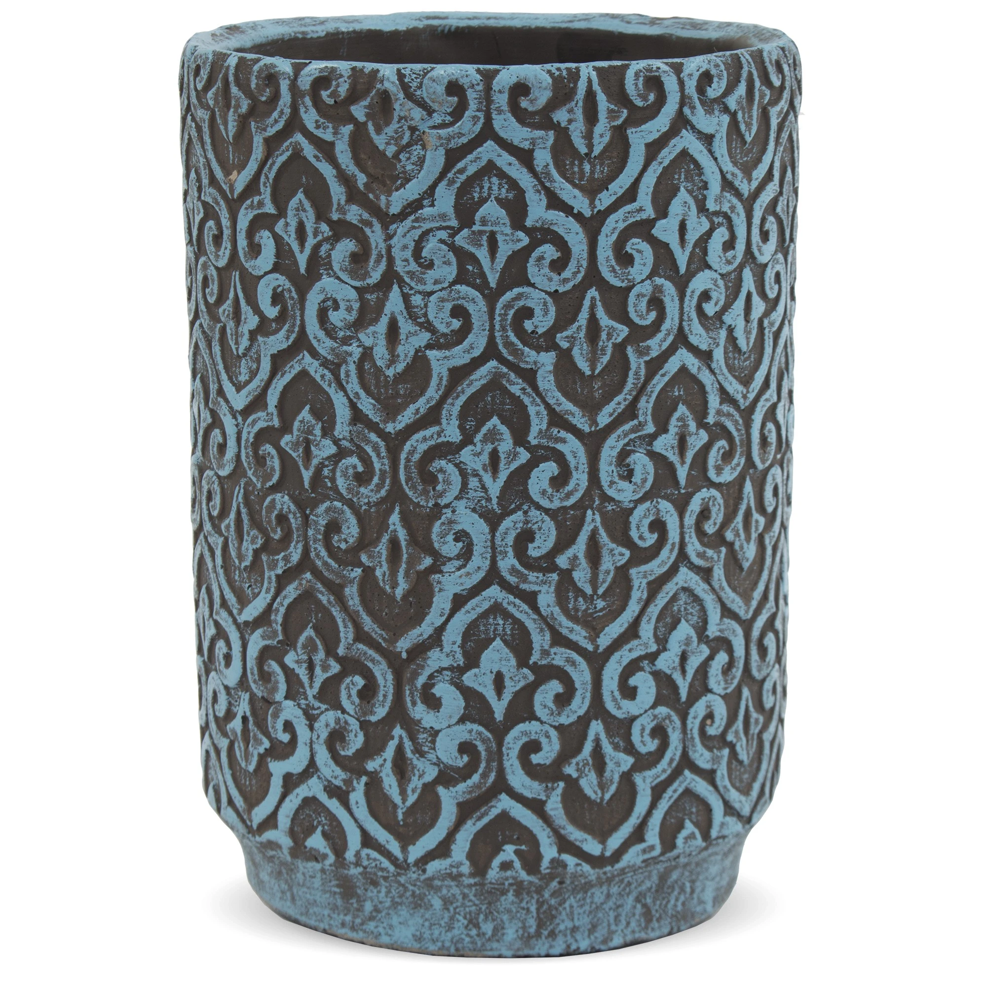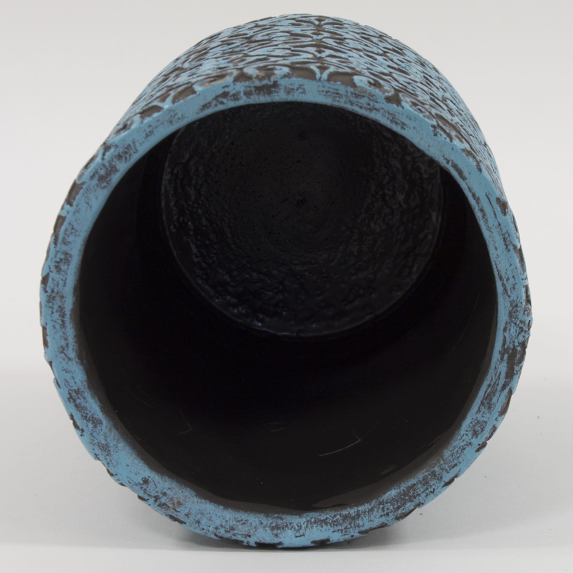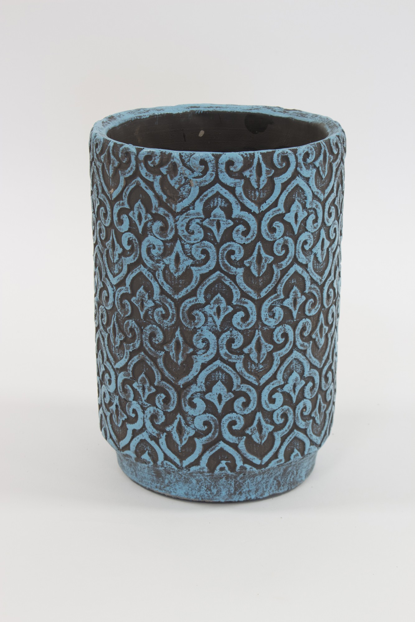 Piękna okrągła ceramiczna osłonka w kształcie wysokiego walca. Ścianki boczne zdobione oryginalnym wzorem.