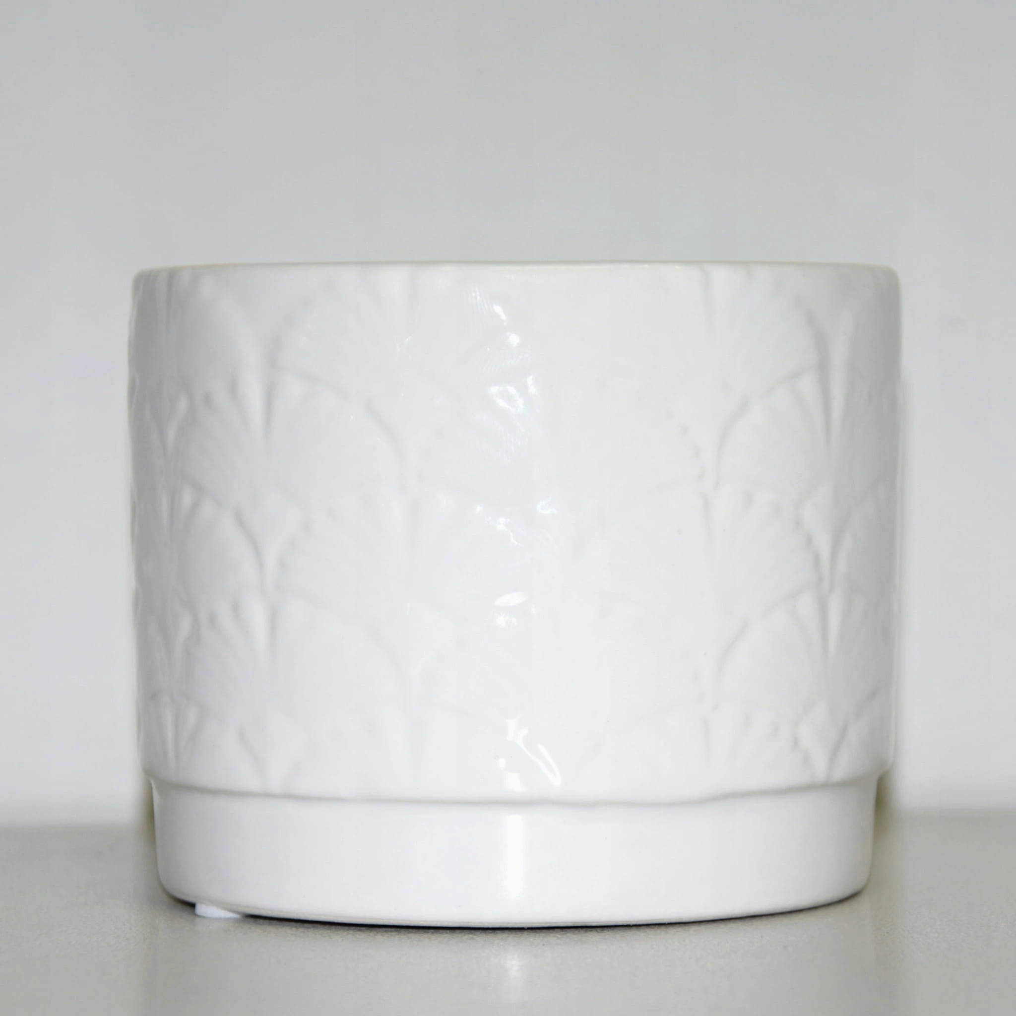 Ceramiczna osłonka w BIAŁYM kolorze, ozdobiona wzorem przypominającym miłorząb.