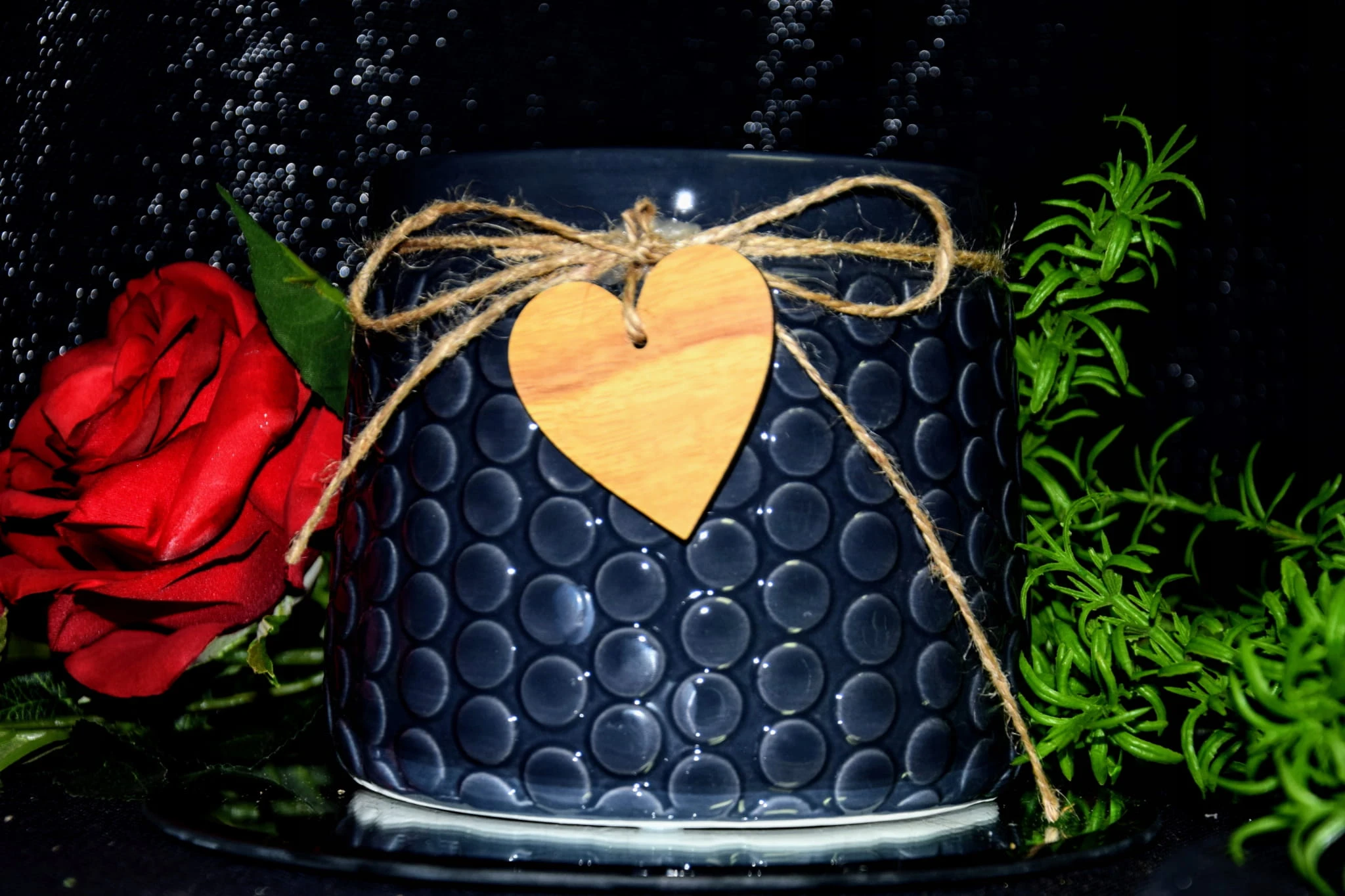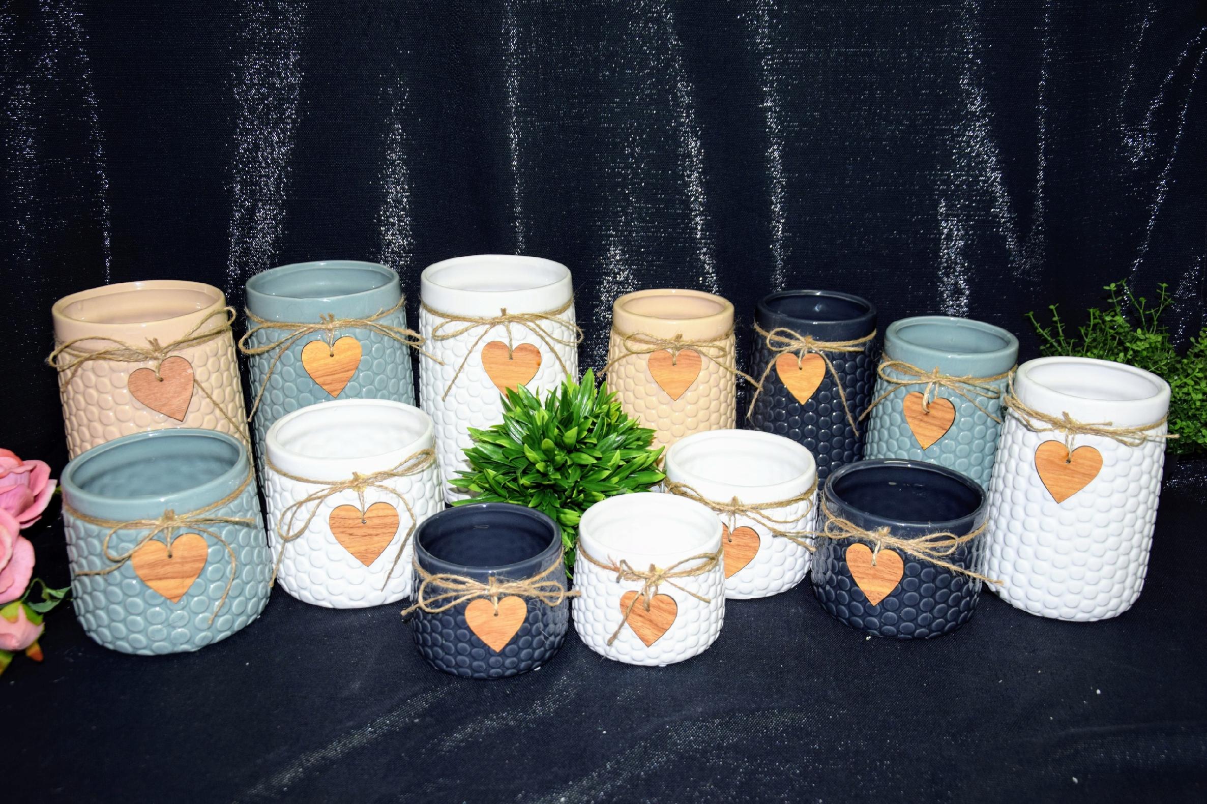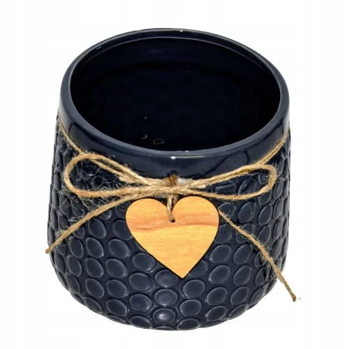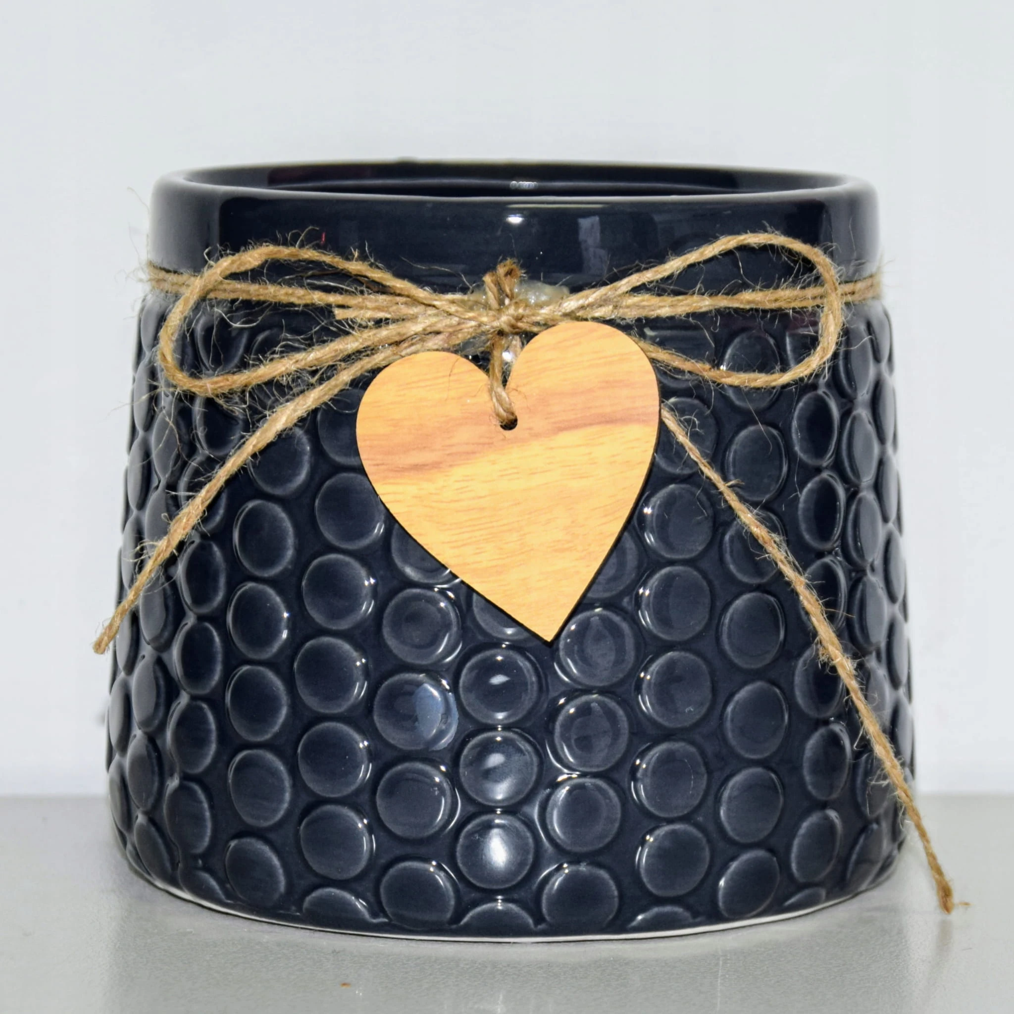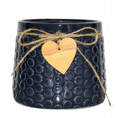 Ceramiczna osłonka w granatowym kolorze, ozdobiona sznurkiem jutowym i drewnianą przywieszką w kształcie serca