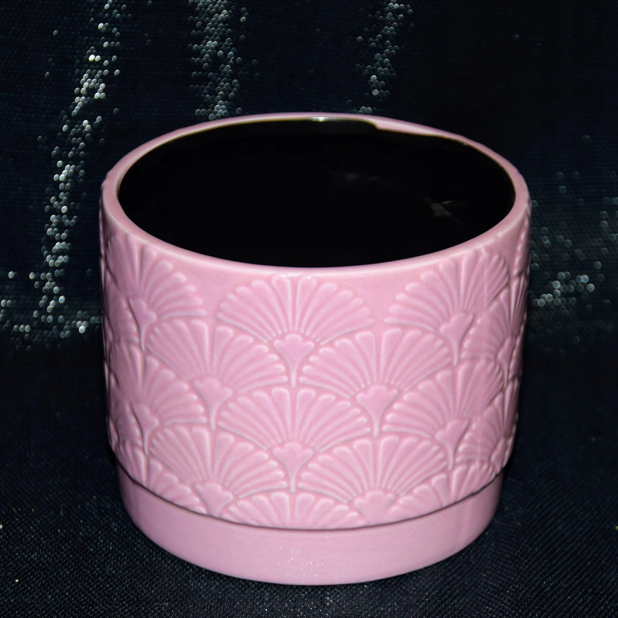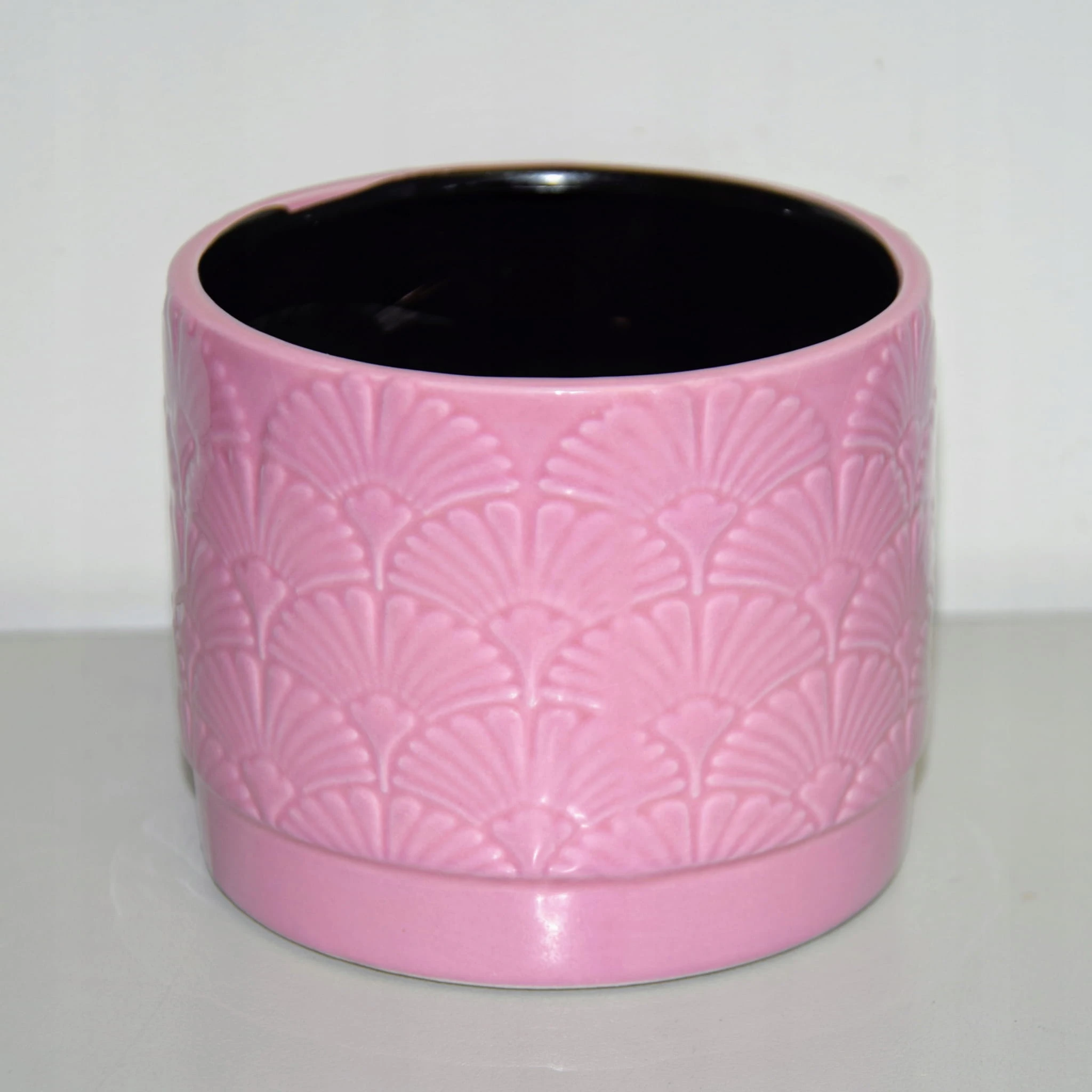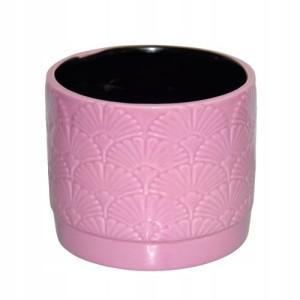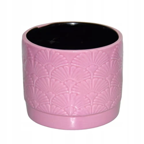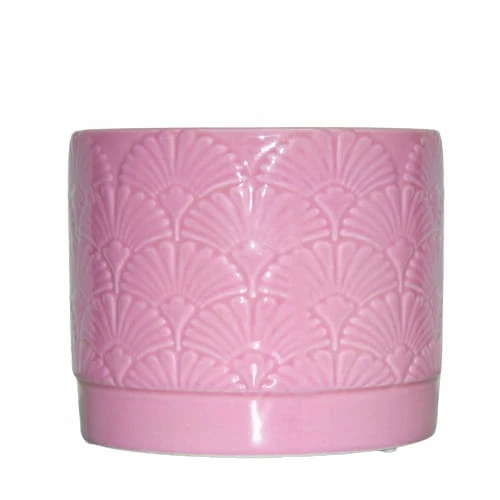 Ceramiczna osłonka w różowym kolorze, ozdobiona wzorem przypominającym miłorząb.