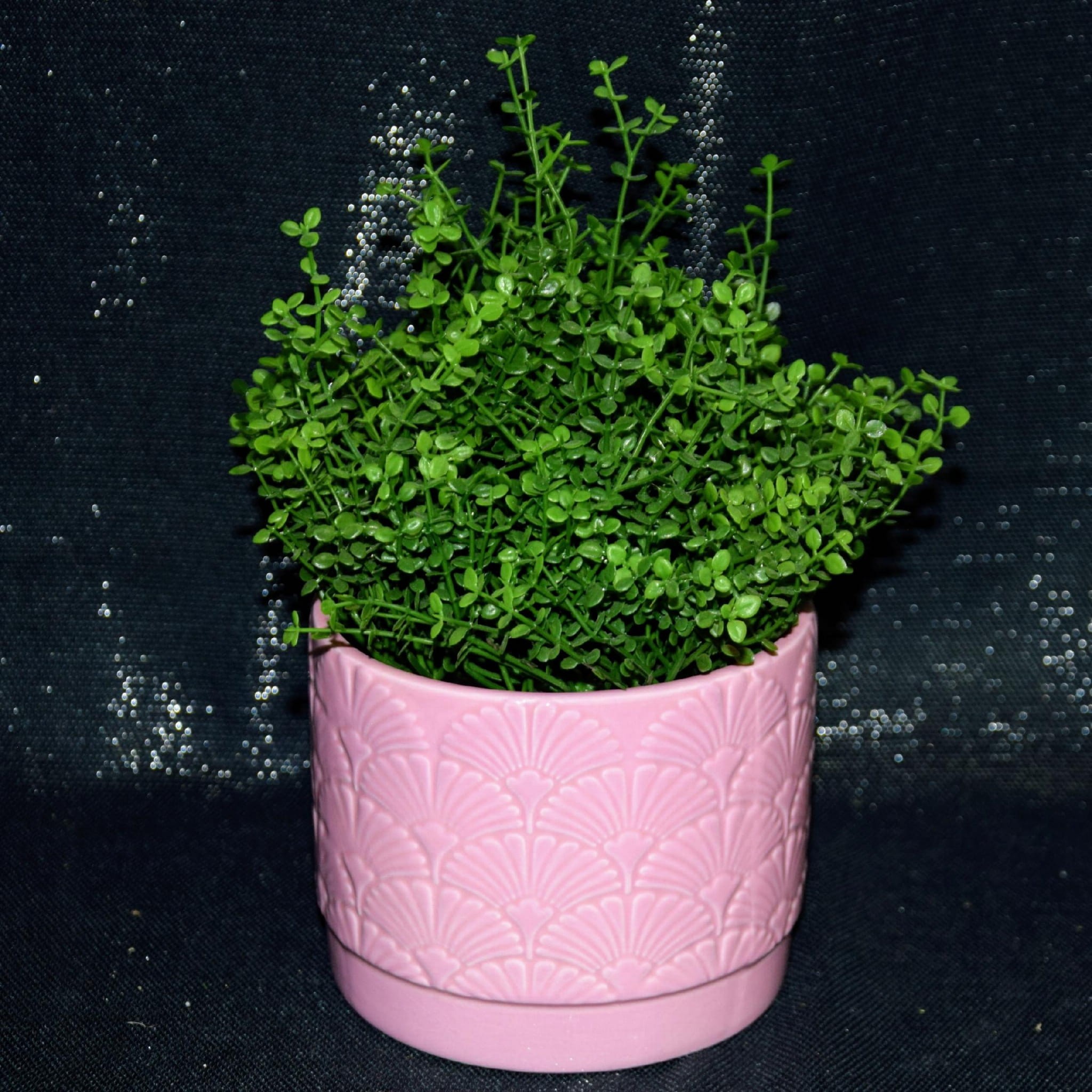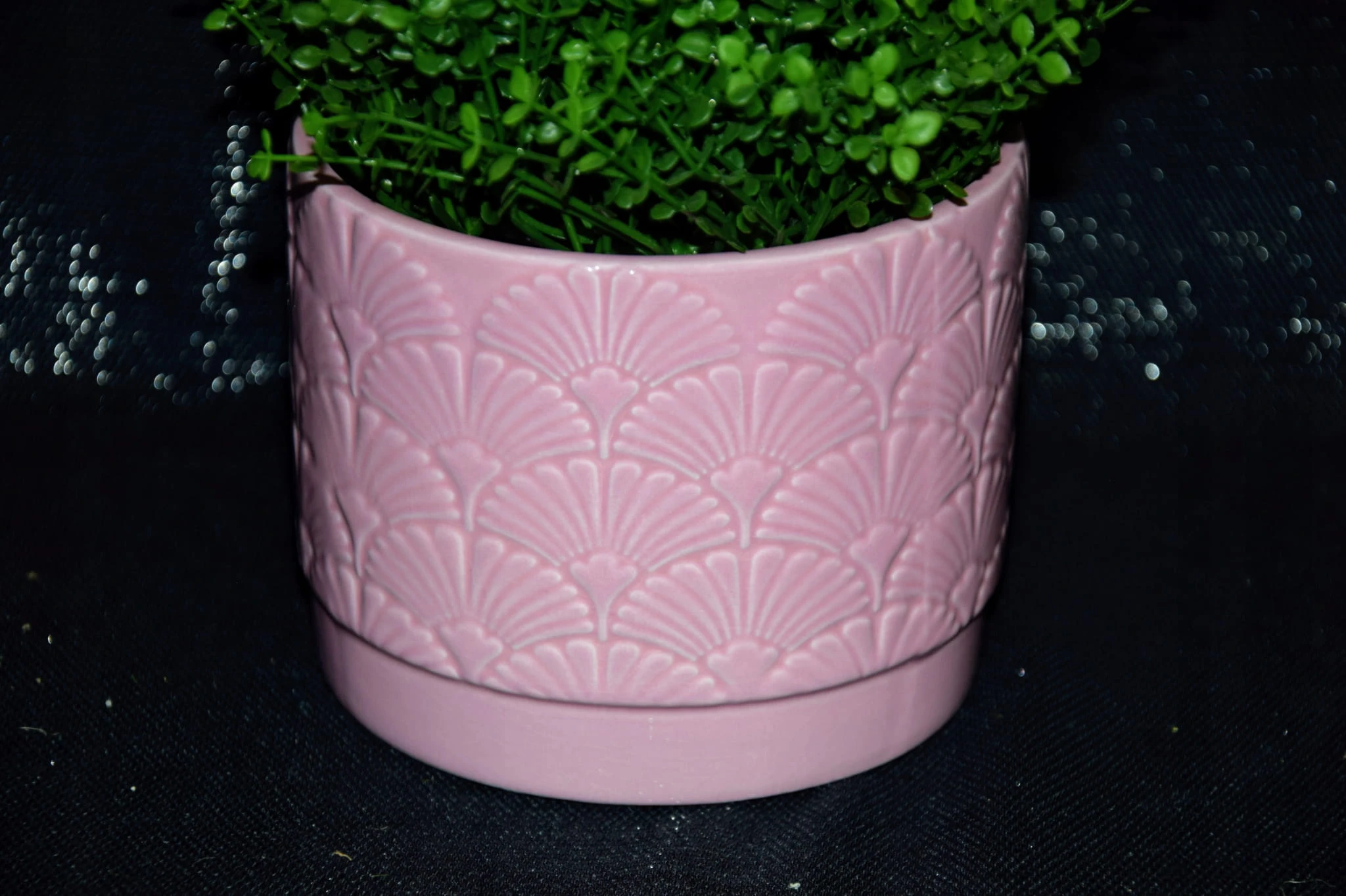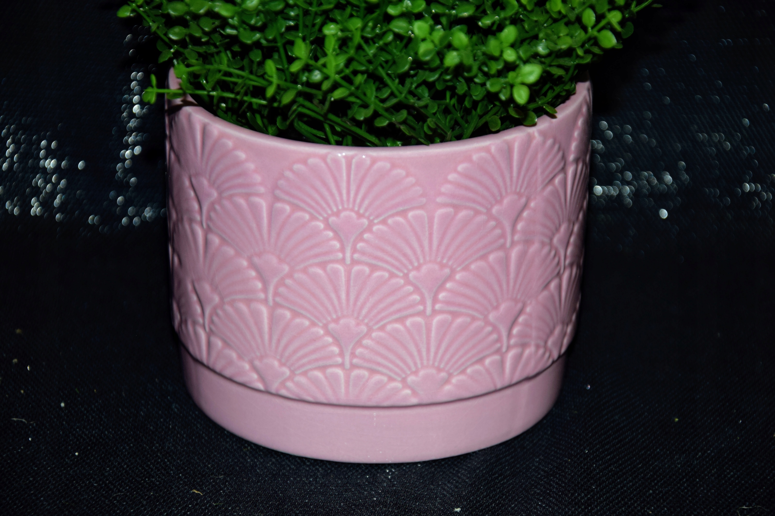 Ceramiczna osłonka w różowym kolorze, ozdobiona wzorem przypominającym miłorząb.