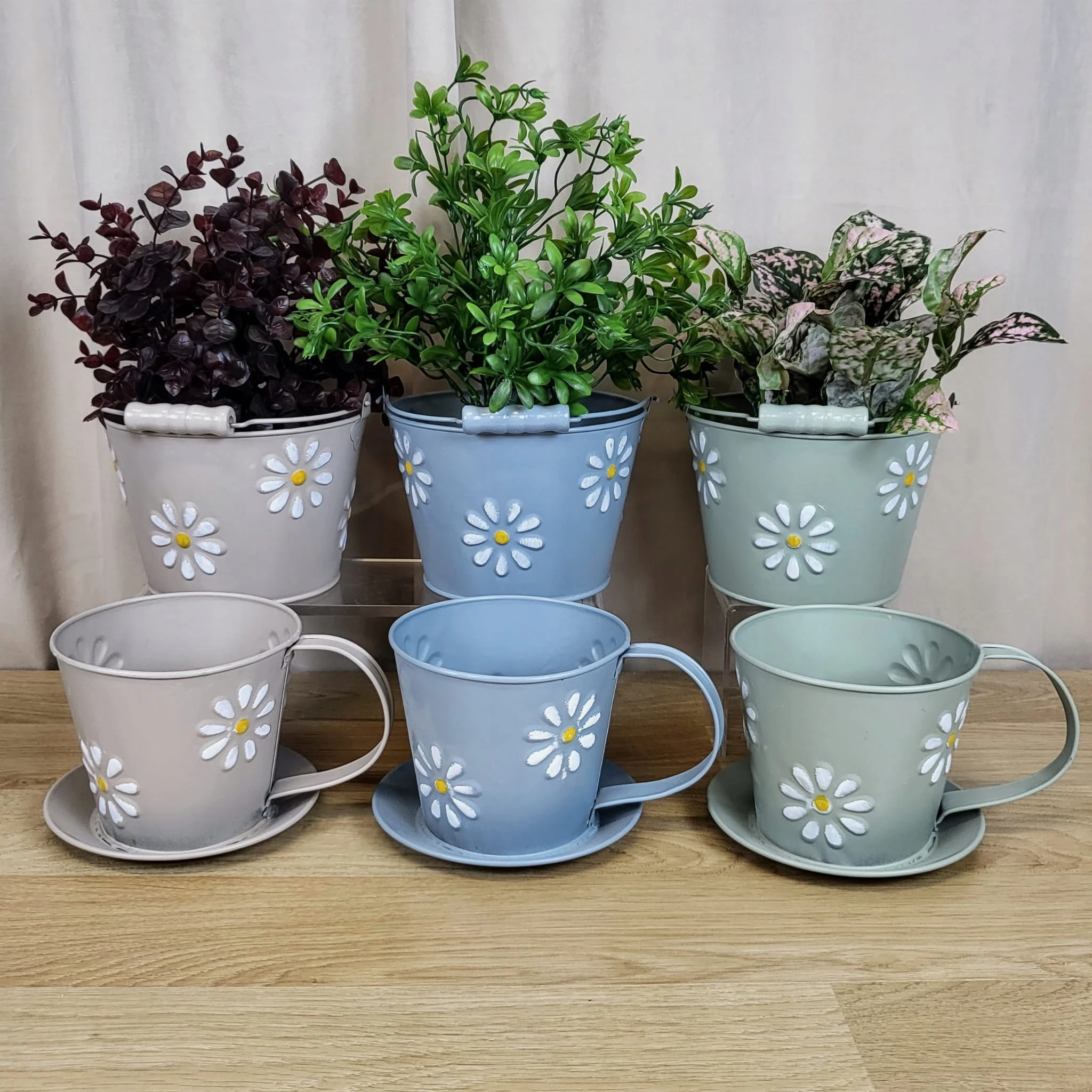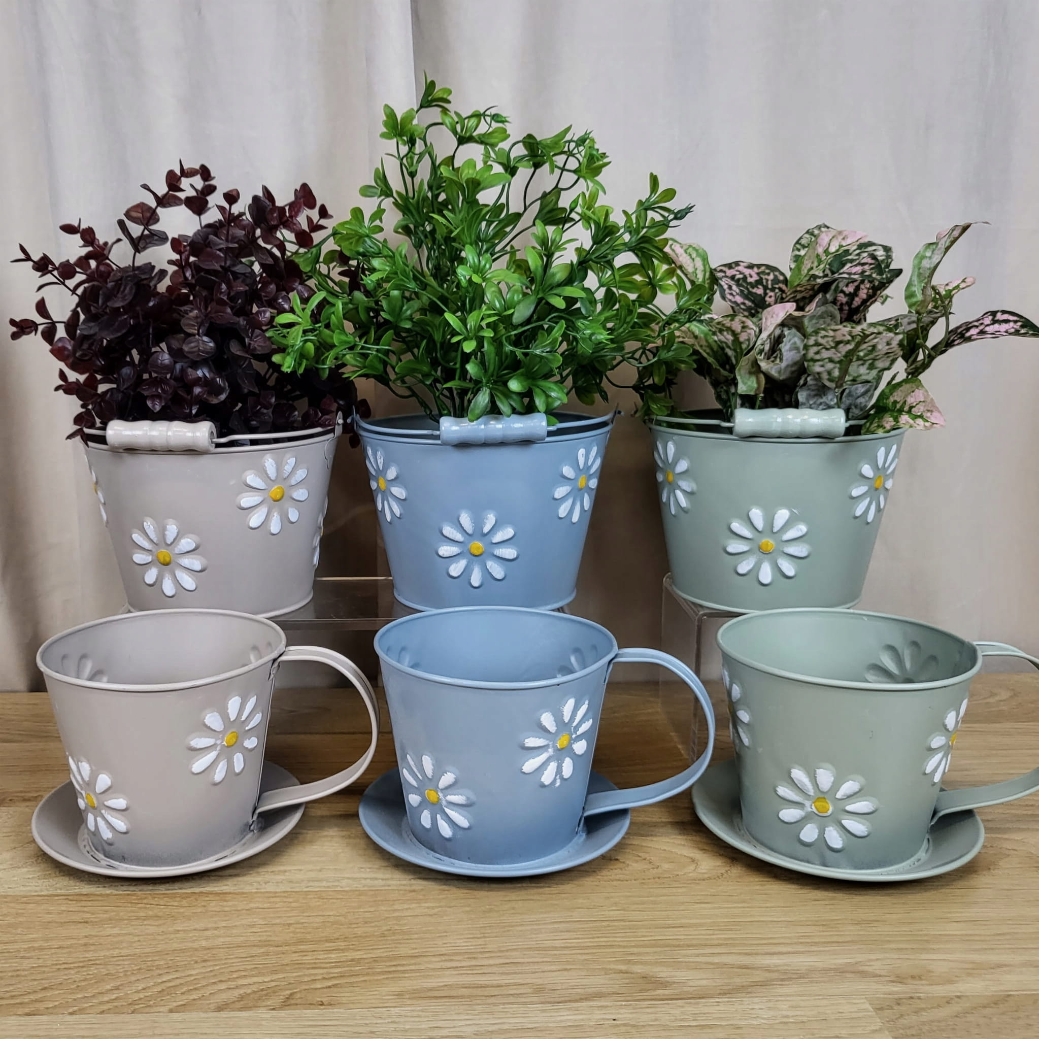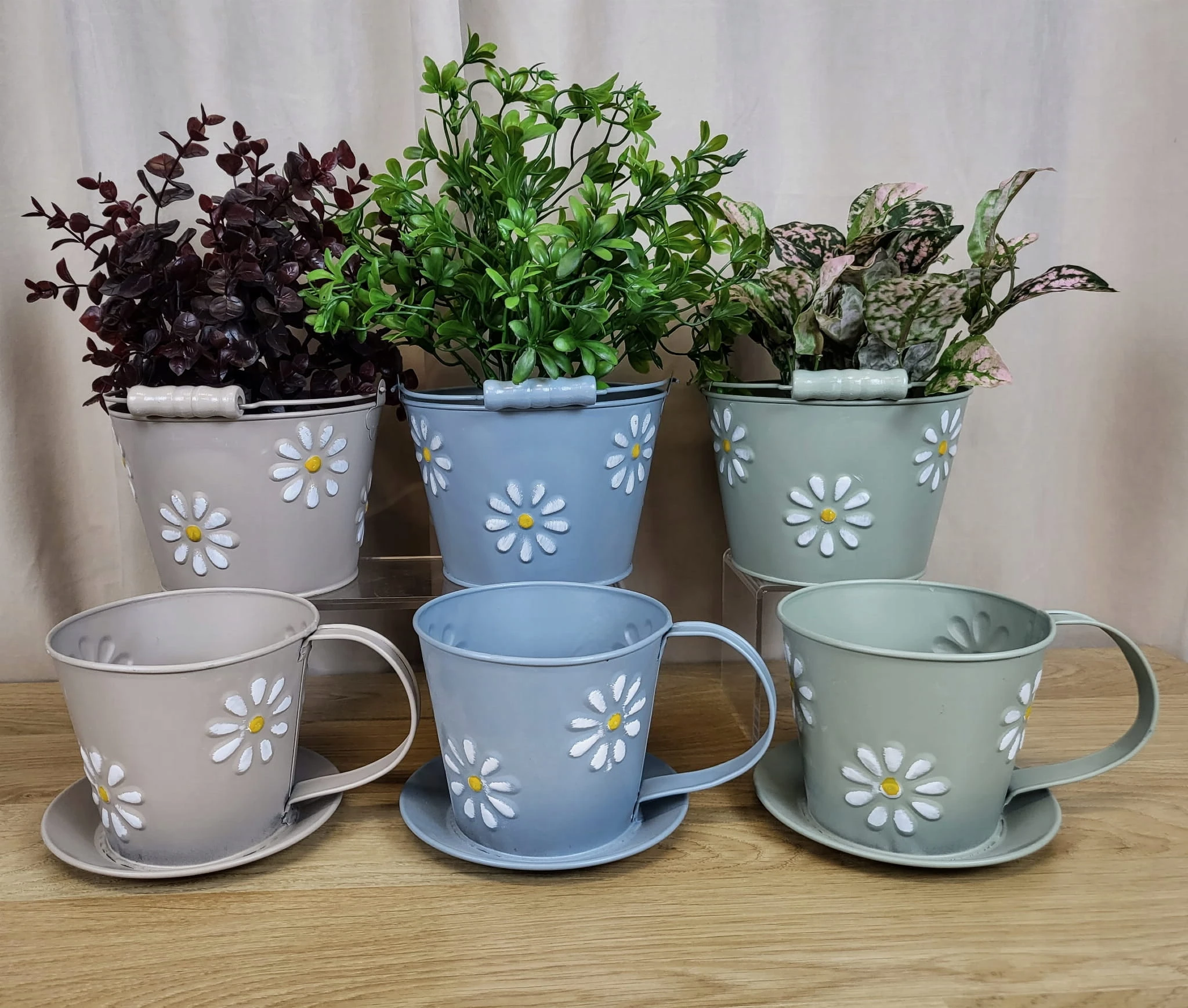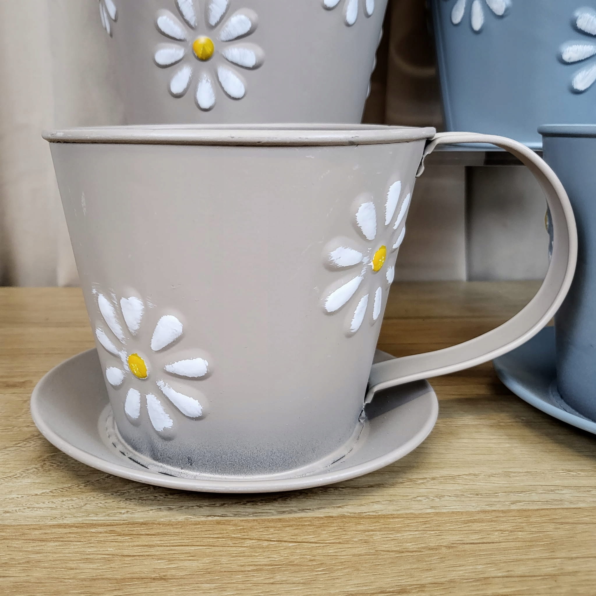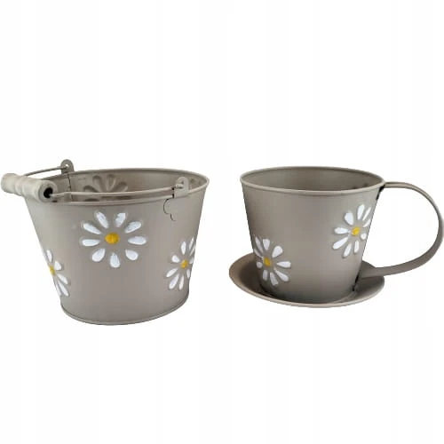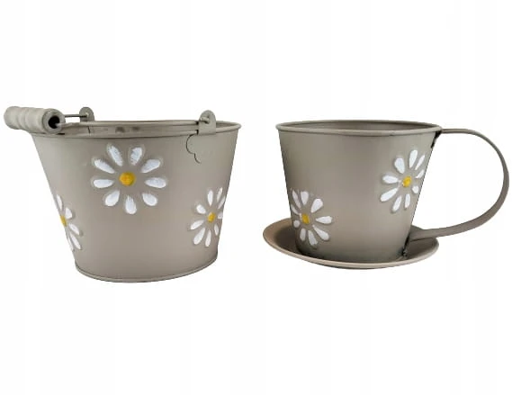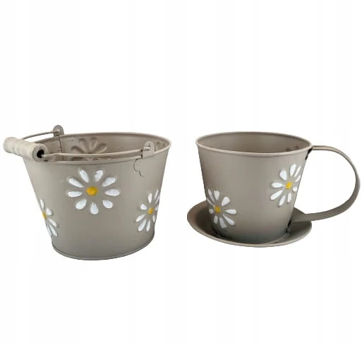 Osłonka metalowa w beżowym kolorze w kształcie filiżanki, ozdobiona uroczymi kwiatuszkami. Idealnie wkomponuje się we wnętrze w stylu rustykalnym jak i prowansalskim. Osłonka ozdobi salon, sypialnię czy taras.
