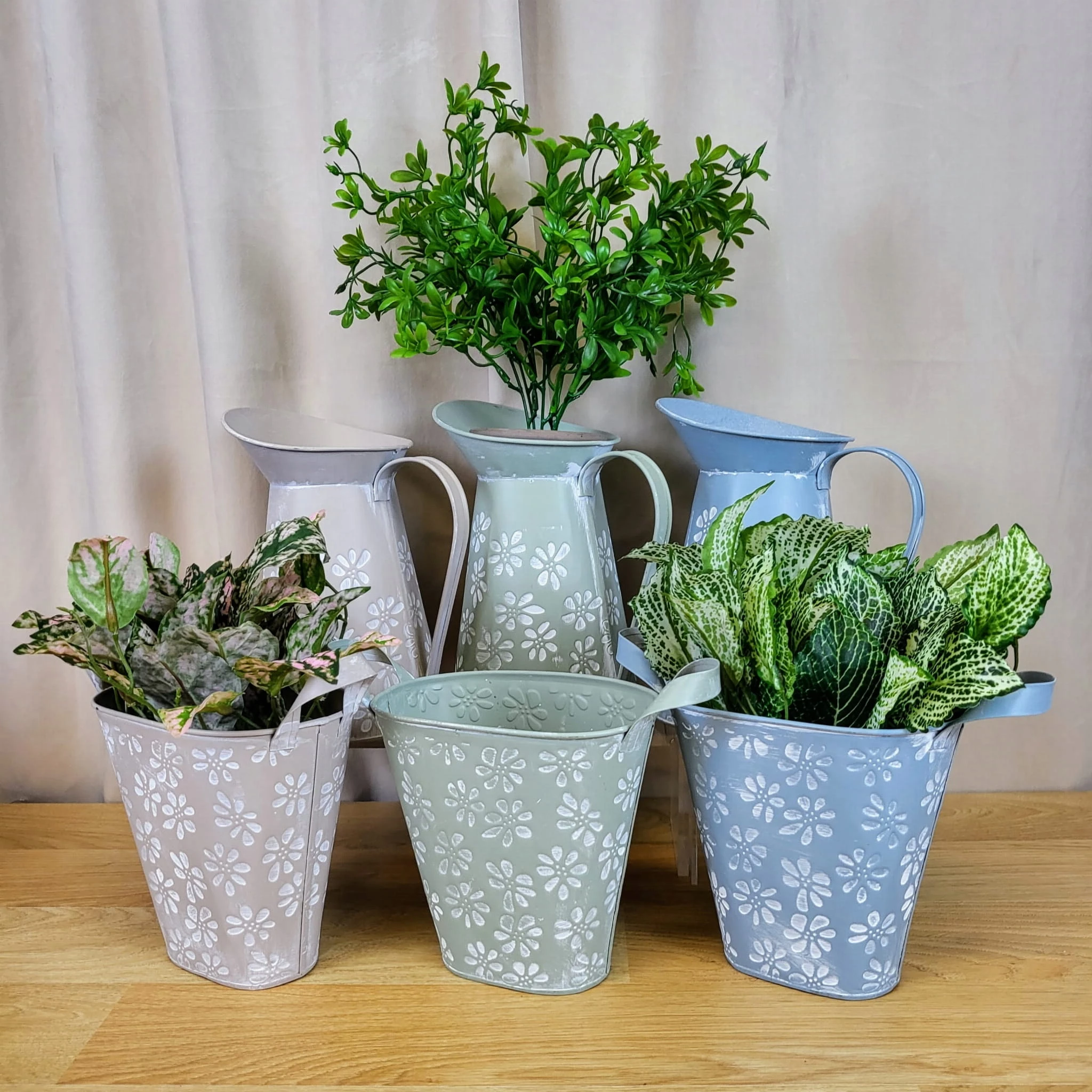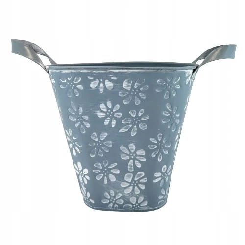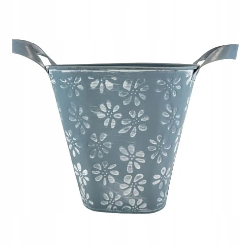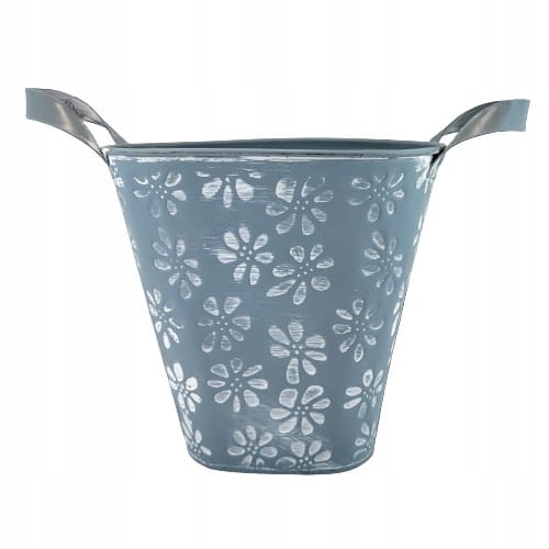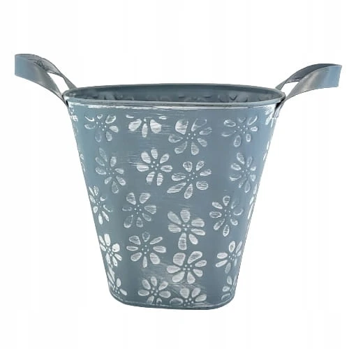 Osłonka metalowa w niebieskim kolorze i uroczym kwiatowym wzorze. Idealnie wkomponuje się we wnętrze w stylu rustykalnym jak i prowansalskim. Osłonka ozdobi biuro, salon czy sypialnię. Osłonkę możemy również wykorzystać jako wazon.
