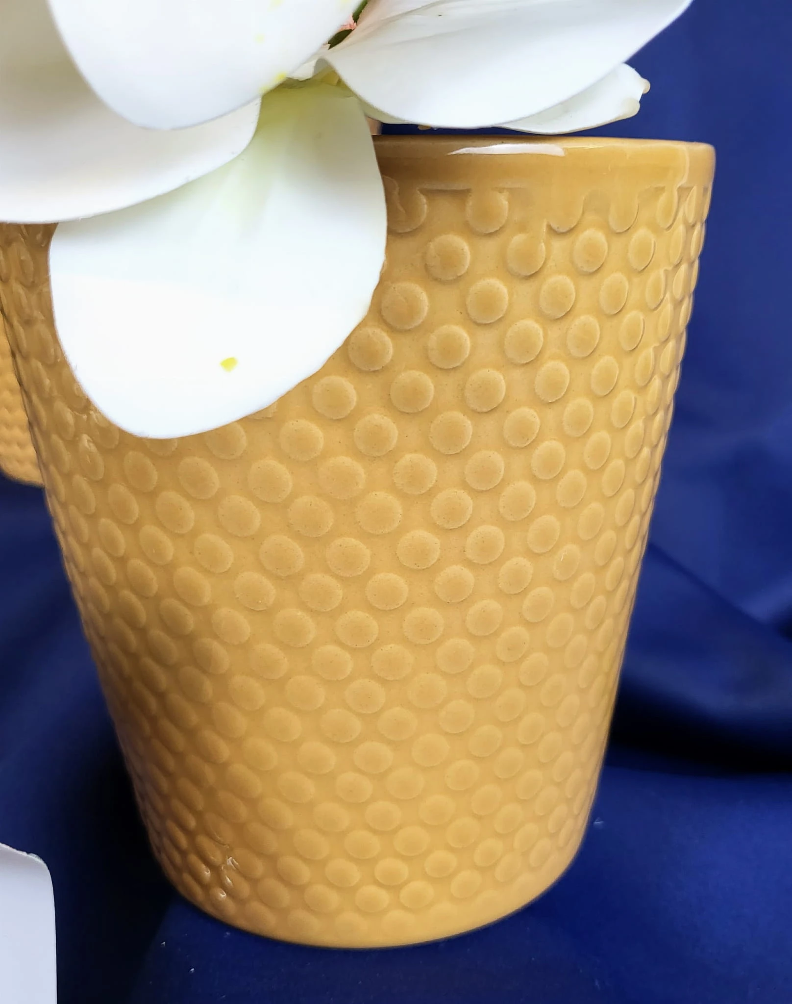 Osłonka ceramiczna w musztardowym kolorze o ciekawym wzorze. Idealnie wkomponuje się we wnętrze w stylu glamour jak i nowoczesne. Osłonka ozdobi biuro, salon czy sypialnię.
