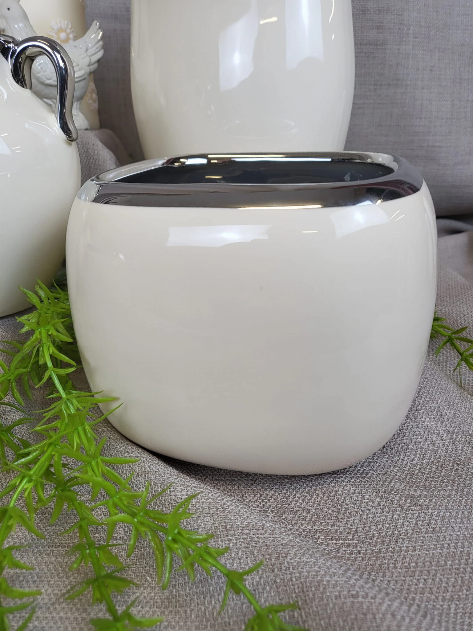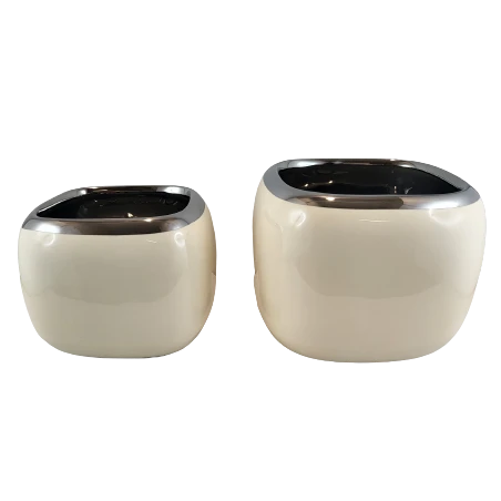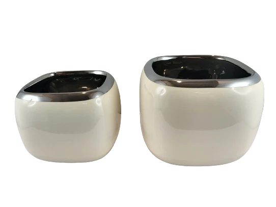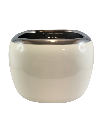Kolor ecru połączony z chłodnym srebrem tworzy nowoczesną, a jednocześnie ponadczasową kompozycję, dzięki czemu nasza donica dopasuje się do wielu wnętrz i uzupełni różne stylizacje.