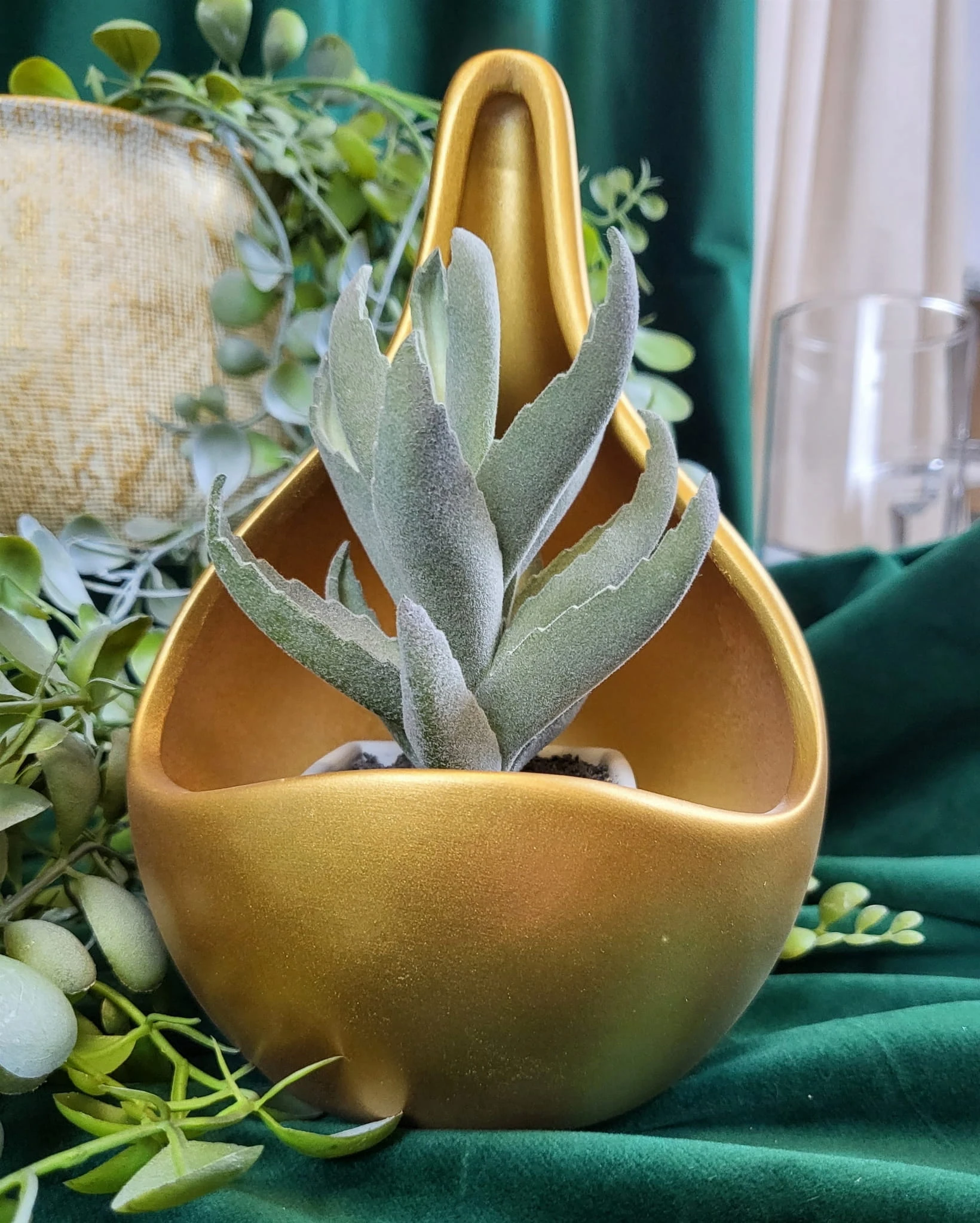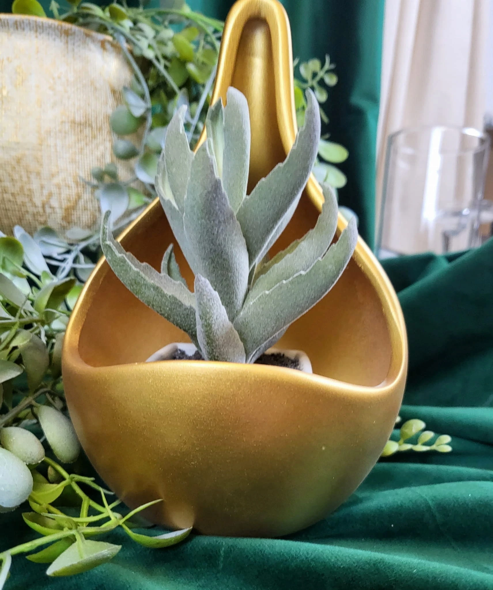 Złota osłonka w ciekawej i abstrakcyjnej formie. Idealnie wkomponuje się we wnętrze w stylu glamour jak i nowoczesne. Osłonka ozdobi biuro, salon czy sypialnię.
