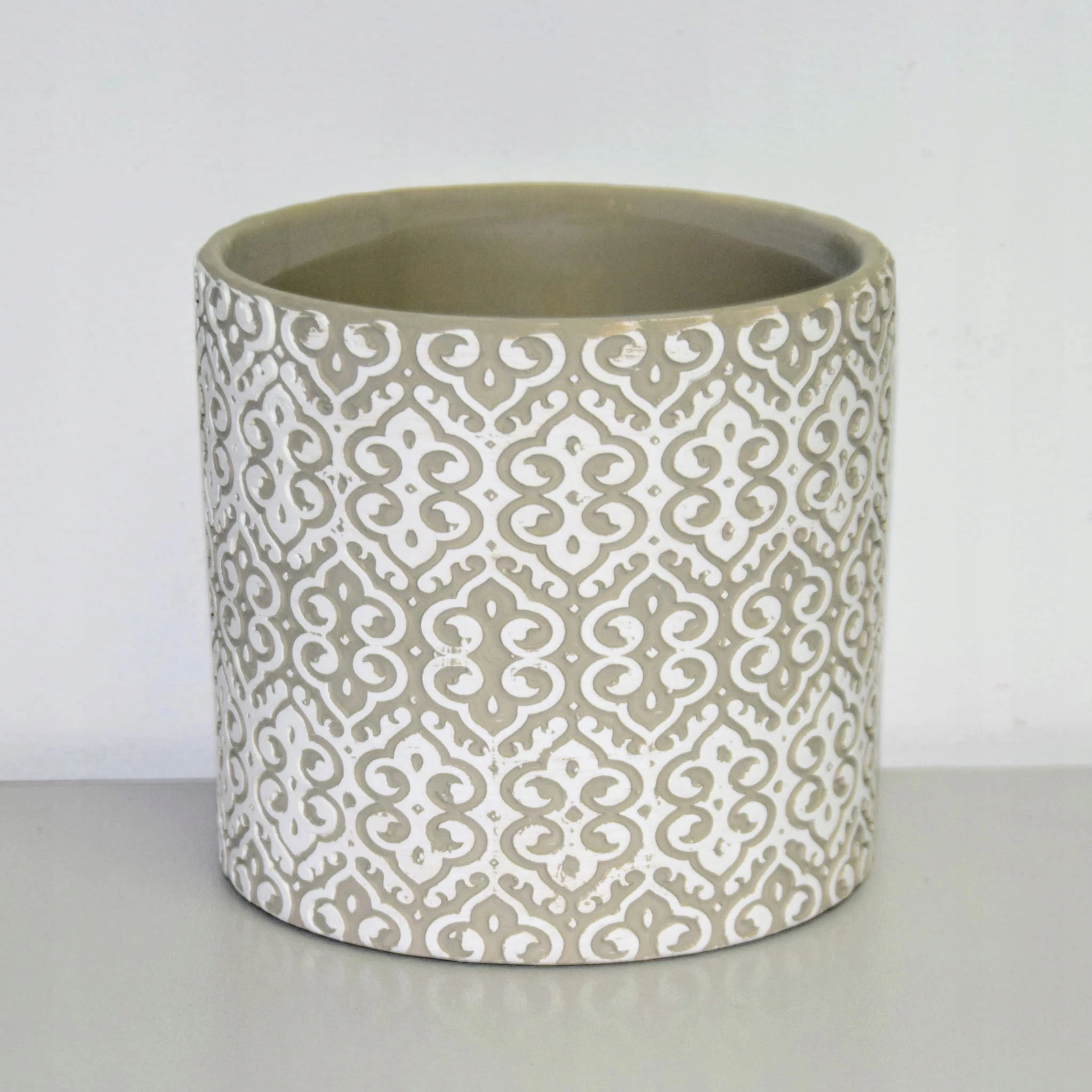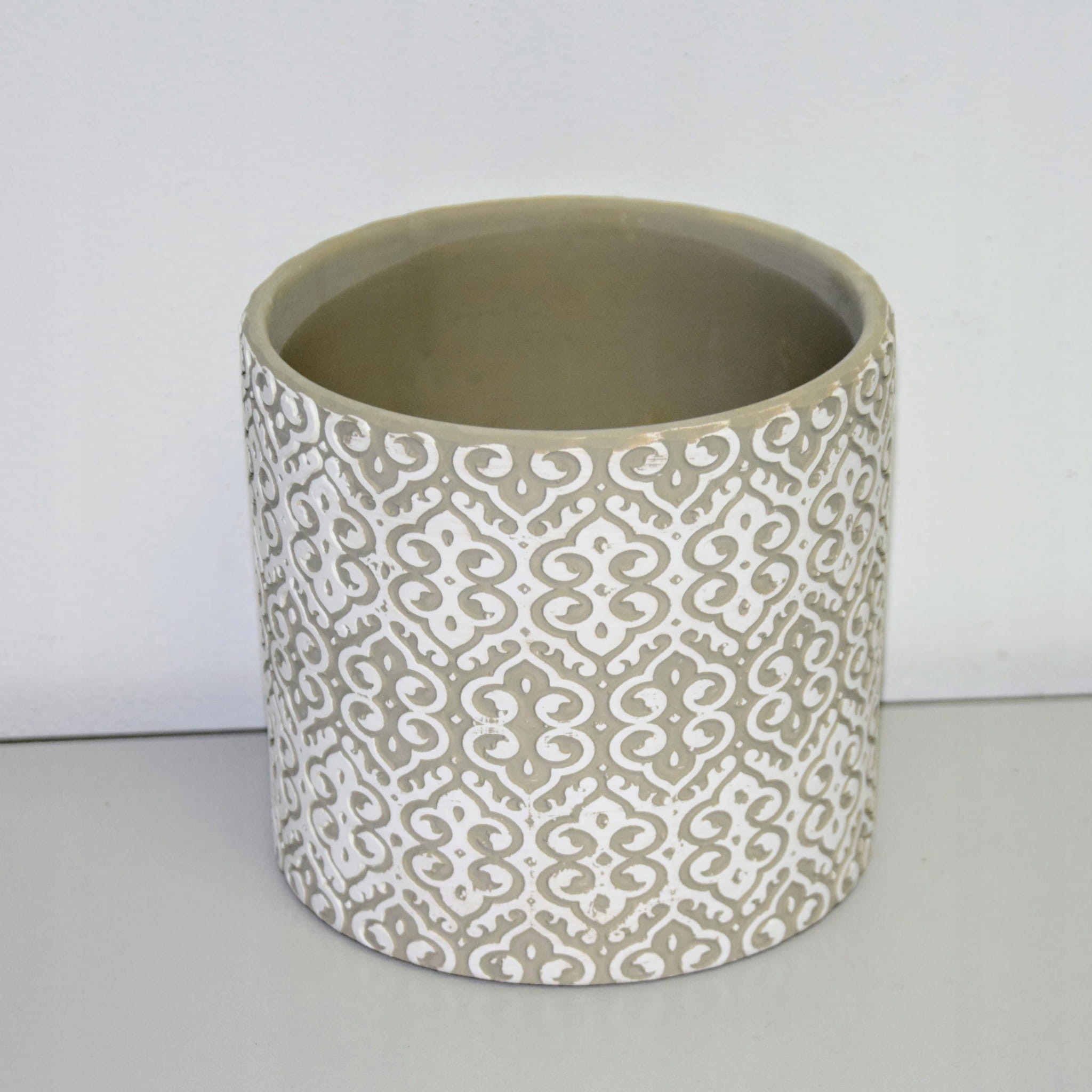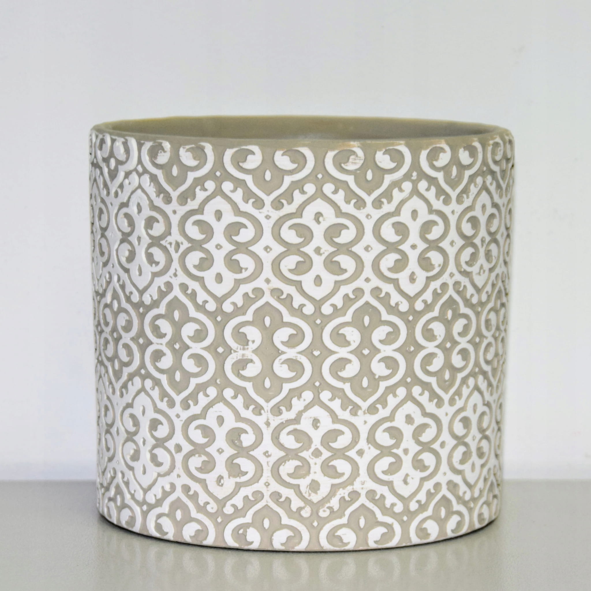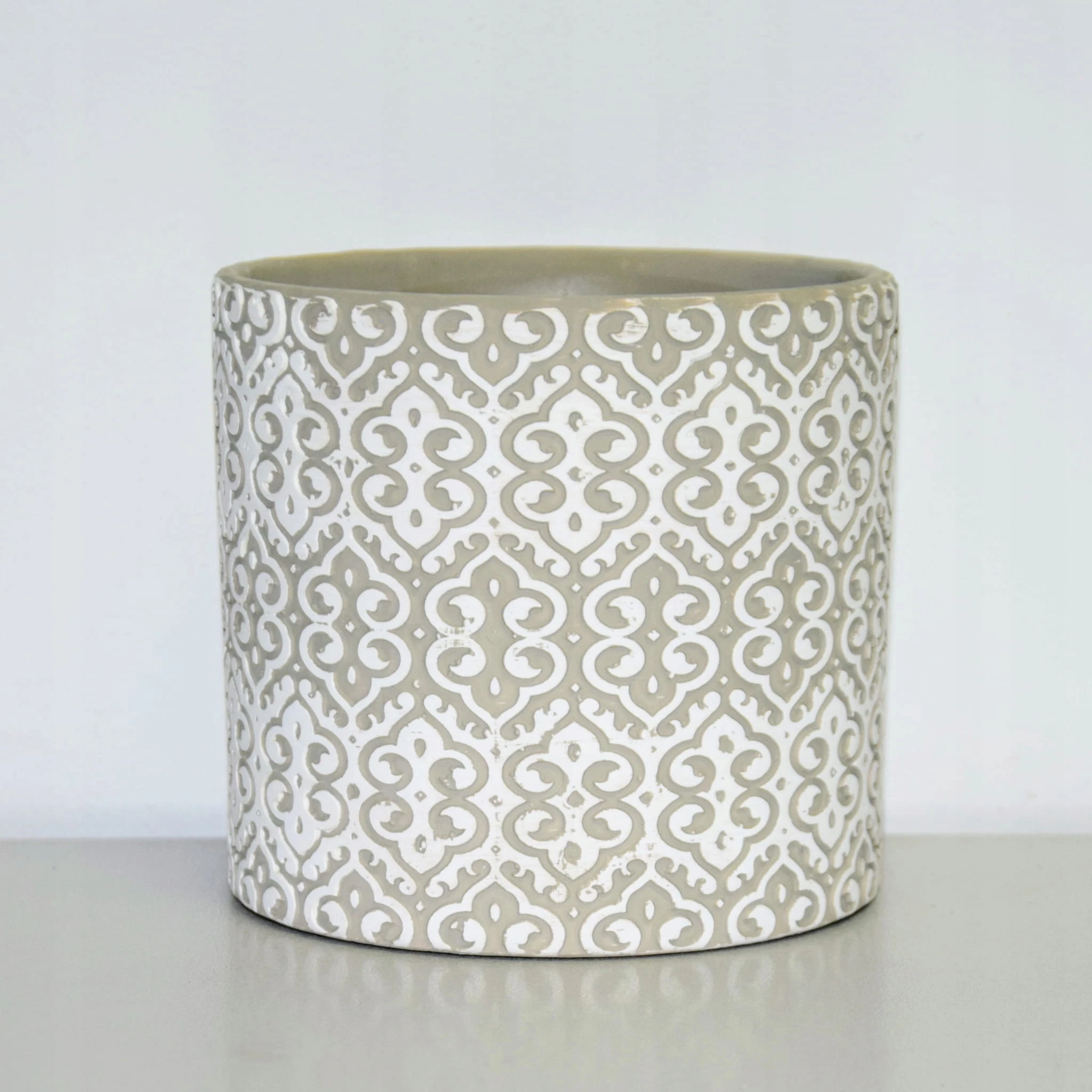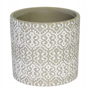 Osłonka w stonowanym kolorze z pięknym tłoczonym wzorem. Stanowi idealną dekorację parapetu, ogrodu, tarasu...