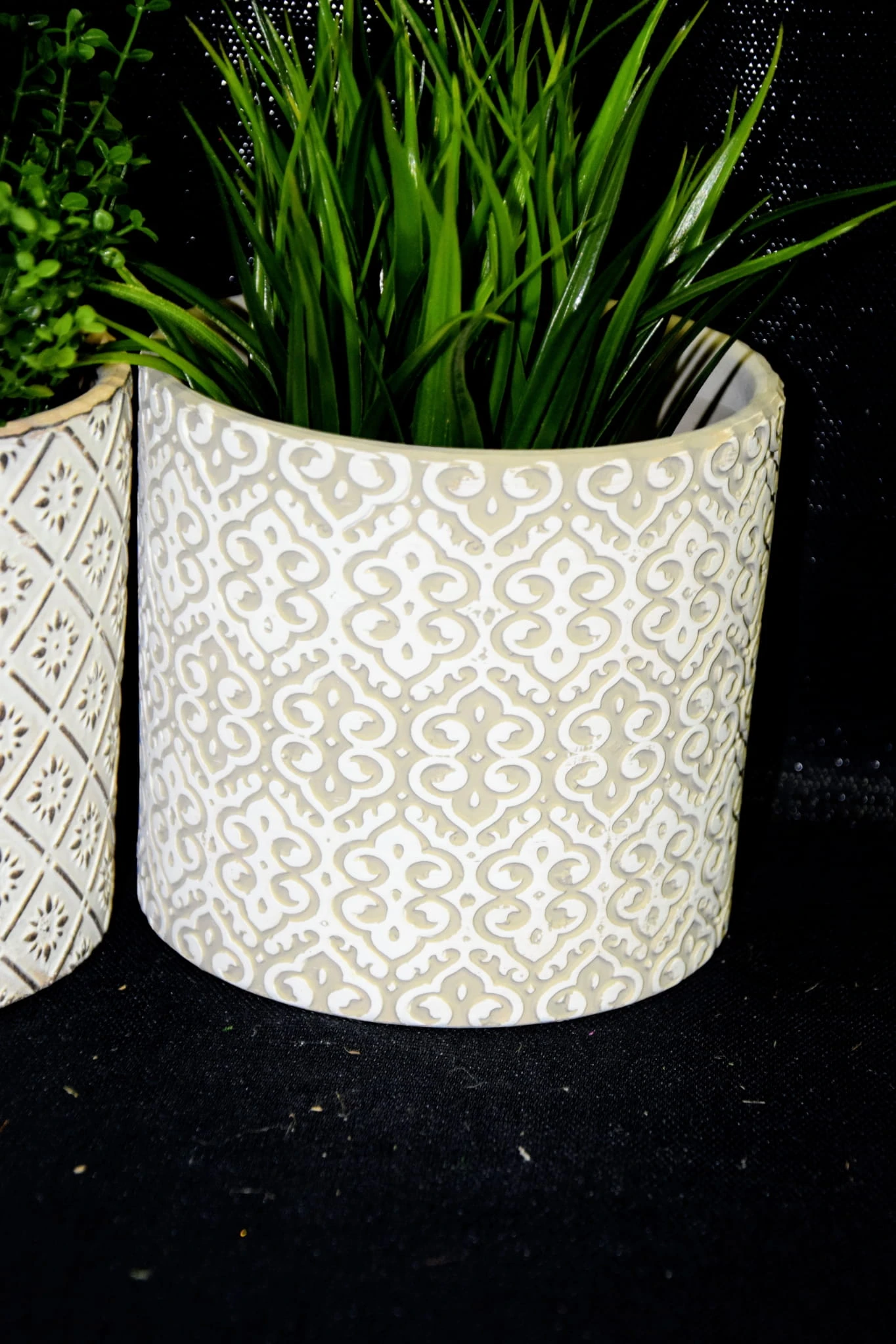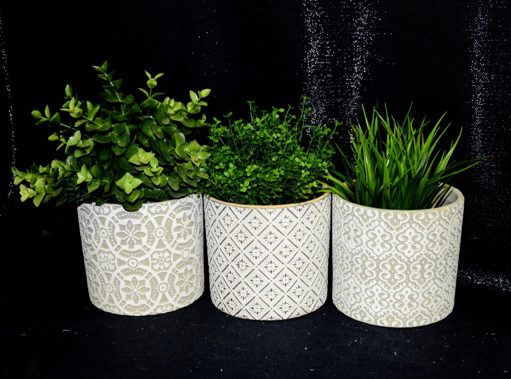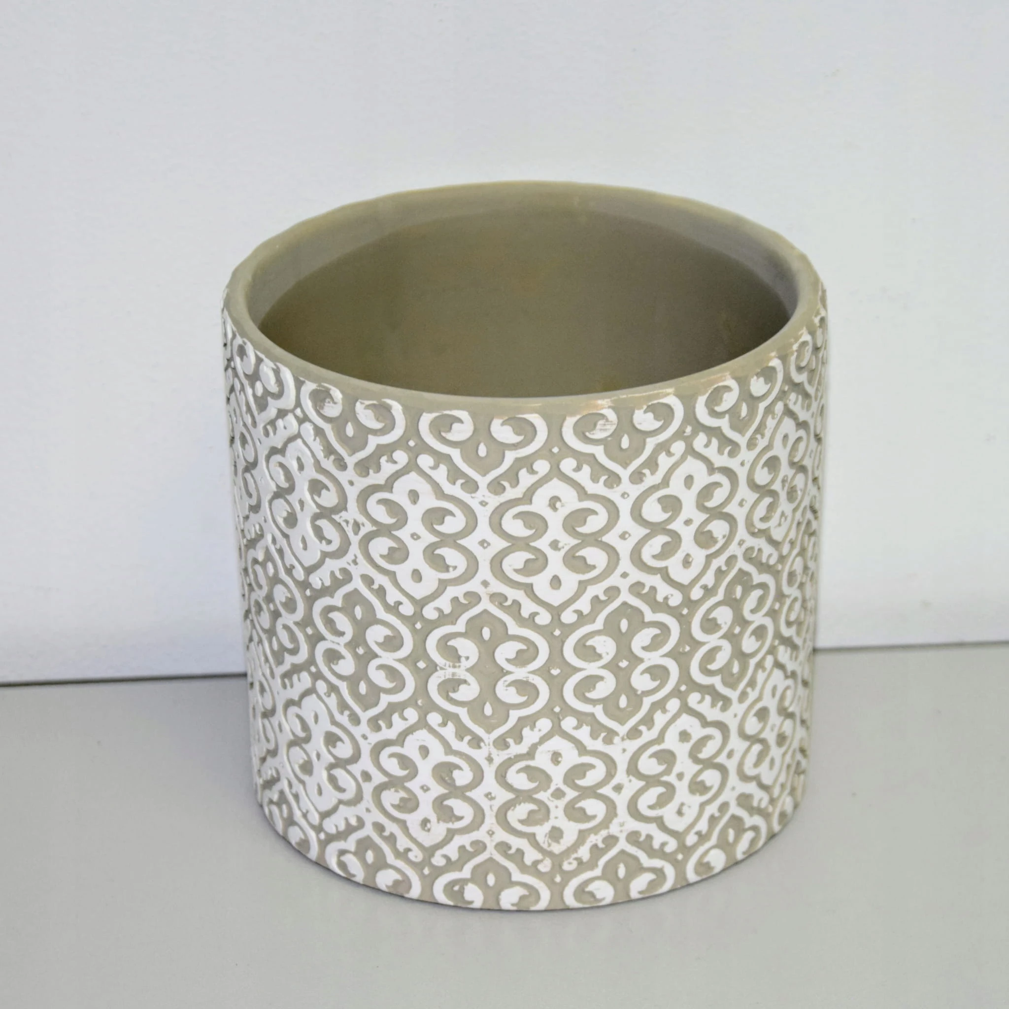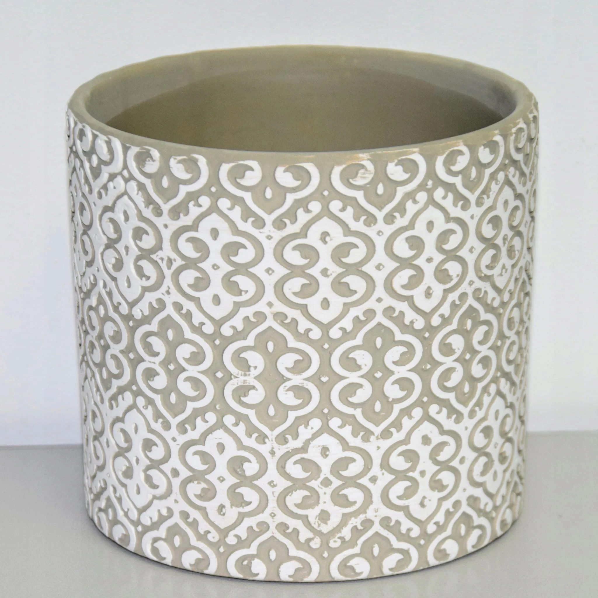 Osłonka w stonowanym kolorze z pięknym tłoczonym wzorem. Stanowi idealną dekorację parapetu, ogrodu, tarasu...