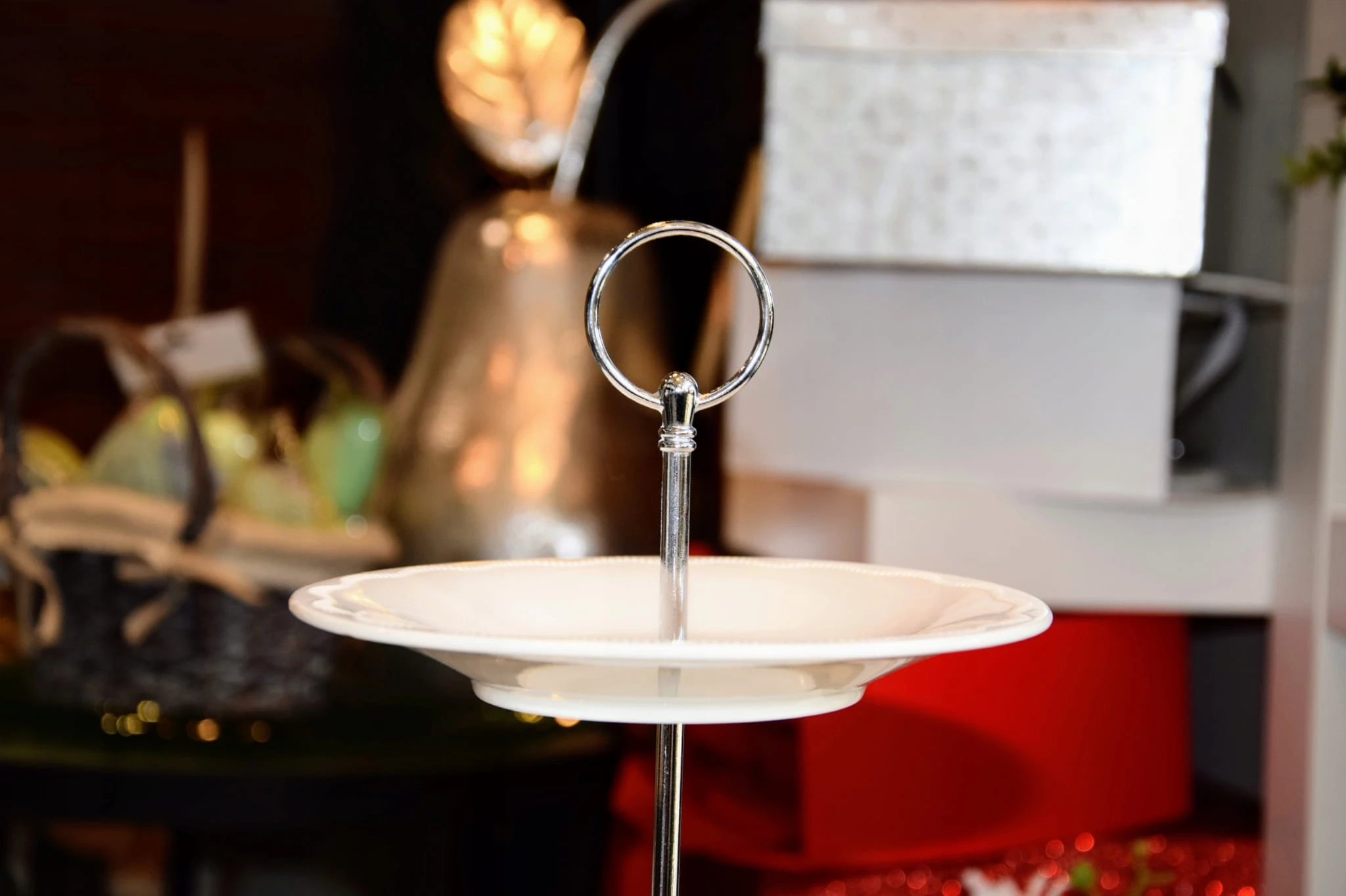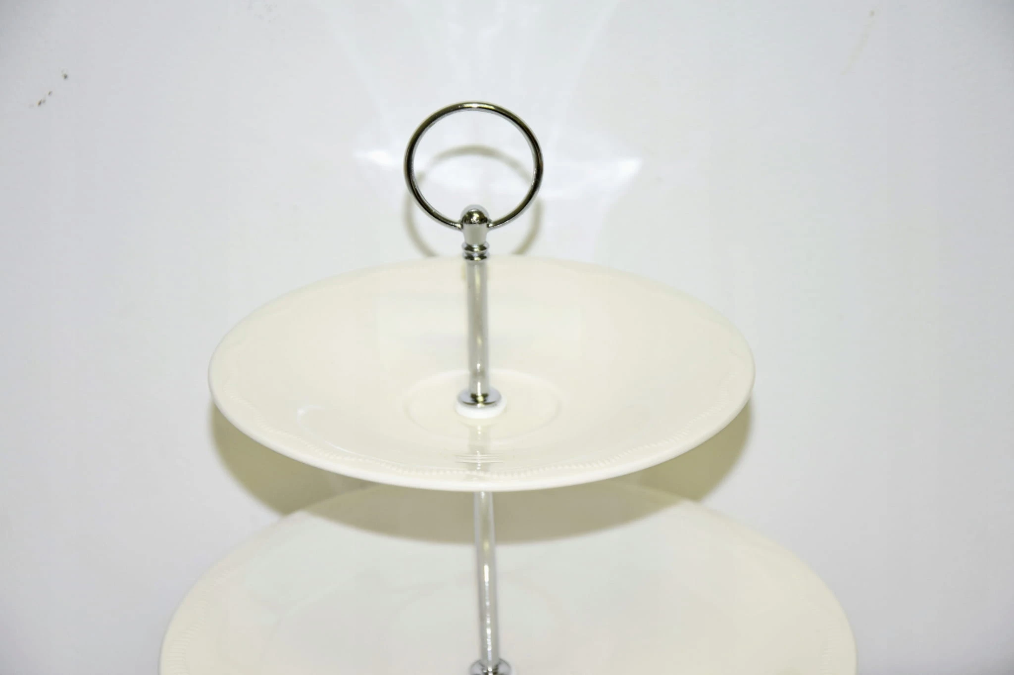 Patera w kolorze ecru z delikatnym wzorem oraz ze srebnym uchwytem.