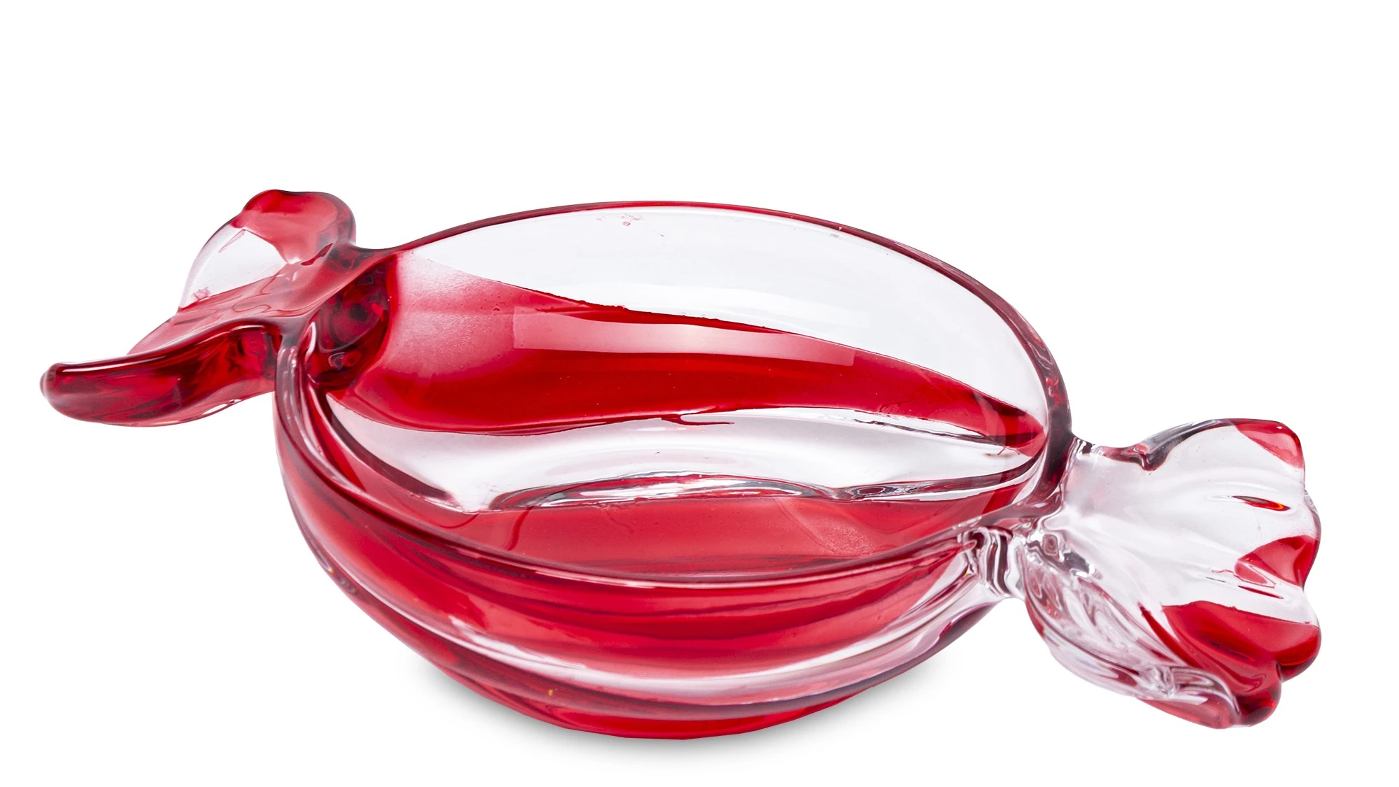 Elegancka patera wykonana ze szkła w kształcie cukierka, idealna jako ozdoba stołu, miseczka na słodycze czy oryginalny element dekoracyjny wnętrza. Dzięki wyjątkowej formie i intensywnemu czerwono-przezroczystemu wykończeniu przyciąga wzrok i dodaje uroku każdemu pomieszczeniu.
